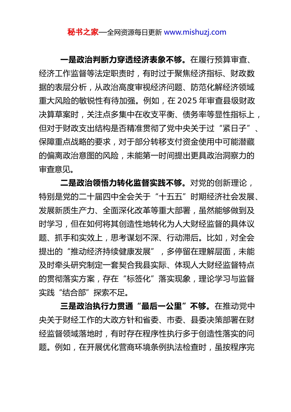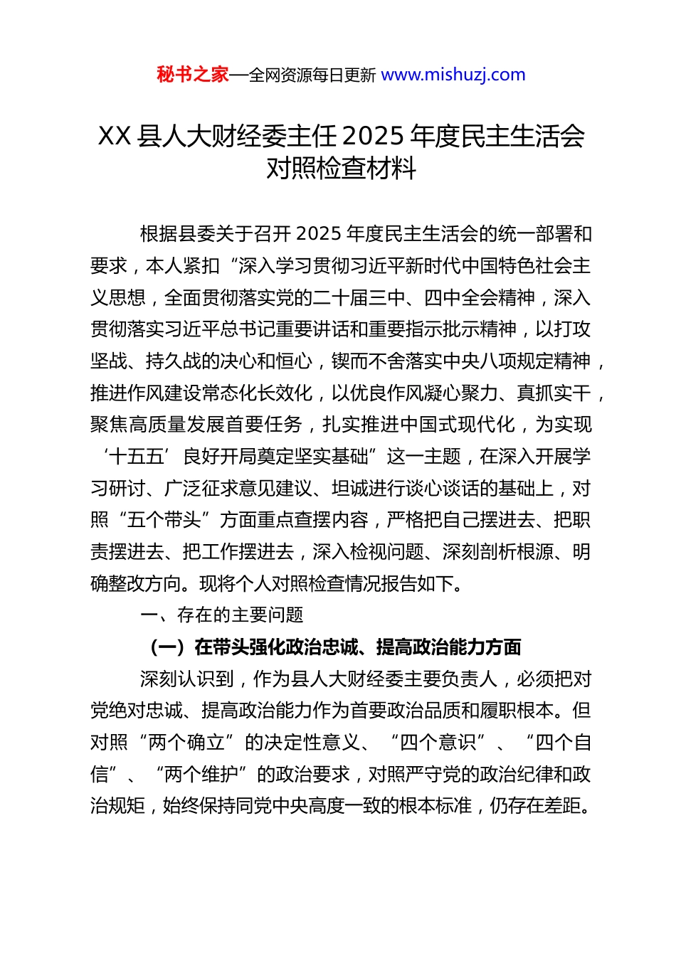秘书之家—全网资源每日更新 www.mishuzj.comXX 县人大财经委主任 2025 年度民主生活会对照检查材料根据县委关于召开 2025 年度民主生活会的统一部署和要求,本人紧扣“深入学习贯彻习近平新时代中国特色社会主义思想,全面贯彻落实党的二十届三中、四中全会精神,深入贯彻落实习近平总书记重要讲话和重要指示批示精神,以打攻坚战、持久战的决心和恒心,锲而不舍落实中央八项规定精神,推进作风建设常态化长效化,以优良作风凝心聚力、真抓实干,聚焦高质量发展首要任务,扎实推进中国式现代化,为实现‘十五五’良好开局奠定坚实基础”这一主题,在深入开展学习研讨、广泛征求意见建议、坦诚进行谈心谈话的基础上,对照“五个带头”方面重点查摆内容,严格把自己摆进去、把职责摆进去、把工作摆进去,深入检视问题、深刻剖析根源、明确整改方向。现将个人对照检查情况报告如下。一、存在的主要问题(一)在带头强化政治忠诚、提高政治能力方面深刻认识到,作为县人大财经委主要负责人,必须把对党绝对忠诚、提高政治能力作为首要政治品质和履职根本。但对照“两个确立”的决定性意义、“四个意识”、“四个自信”、“两个维护”的政治要求,对照严守党的政治纪律和政治规矩,始终保持同党中央高度一致的根本标准,仍存在差距。秘书之家—全网资源每日更新 www.mishuzj.com一是政治判断力穿透经济表象不够。在履行预算审查、经济工作监督等法定职责时,有时过于聚焦经济指标、财政数据的表层分析,从政治高度审视经济问题、防范化解经济领域重大风险的敏锐性有待加强。例如,在 2025 年审查县级财政决算草案时,关注点多集中在收支平衡、债务率等显性指标上,但对于财政支出结构是否精准贯彻了党中央关于过“紧日子”、保障重点战略的要求,对于部分转移支付资金使用中可能潜藏的偏离政治意图的风险,未能第一时间提出更具政治洞察力的审查意见。二是政治领悟力转化监督实践不够。对党的创新理论,特别是党的二十届四中全会关于“十五五”时期经济社会发展、发展新质生产力、全面深化改革等重大部署,虽然能够做到及时学习,但在如何将其创造性地转化为人大财经监督的具体议题、抓手和实效上,思考谋划不深、行动滞后。比如,对全会提出的“推动经济持续健康发展”,多停留在理解层面,未能及时牵头研究制定一套契合我县实际、体现人大财经监督特点的贯彻落实方案,存在“标签化”落实现象,理论学习与监督实践“结合部”探索不足。三是政治执行力贯通“最后一公里”不够。在推动党中央关于财经工作的大政方针和省委、市委、县委决策部署在财经监督领域落地时,有时存在程序性执行多于创造性落实的问题。例如,在开展优化营商环境条例执法检查时,虽按程序完秘书之家—全网资源每日更新 www.mishuzj.com成了听取汇报、走访企业、形成报告等环节,但对于发现的“中梗阻”问题,后续跟踪监督的韧劲不足,未能坚决运用专题询问、满意度测评等更具刚性的监督方式“一竿子插到底”,导致一些深层次问题未能有效破解,监督的“牙齿”不够锋利。(二)在带头固本培元、增强党性方面始终铭记党性修养是终身课题,坚持以习近平新时代中国特色社会主义思想凝心铸魂。但对照“坚持把政治修养摆在党性修养的首位”和“始终用党性原则正心明道、修身律己”的高标准,仍有不足。一是理论武装的“头雁效应”发挥不充分。作为财经委党员负责同志,在组织本委干部学习时,有时满足于完成“规定动作”,带头深钻细研、带动形成浓厚研学氛围的主动性不强。在研讨交流中,自己阐述观点多,引导年轻干部结合财经监督案例深化理解、碰撞思想的“催化”作用发挥不够,未能最大限度激发团队学习的“雁阵活力”。二是党性原则融入日常监督不自觉。在面对涉及多方利益协调的复杂财经议题时,有时不自觉地优先考虑“技术可行性”和“操作平衡性”,而从“坚持党的领导”、“以人民为中心”的党性原则高度来统揽审查监督工作的自觉性、敏锐性有待提升。例如,在初审某项涉及民生投入与基础设施建设资金平衡的预算调整方案时,更多精力放在了数据测算和项目论证的技术层面,未能旗帜鲜明地将保障和改...