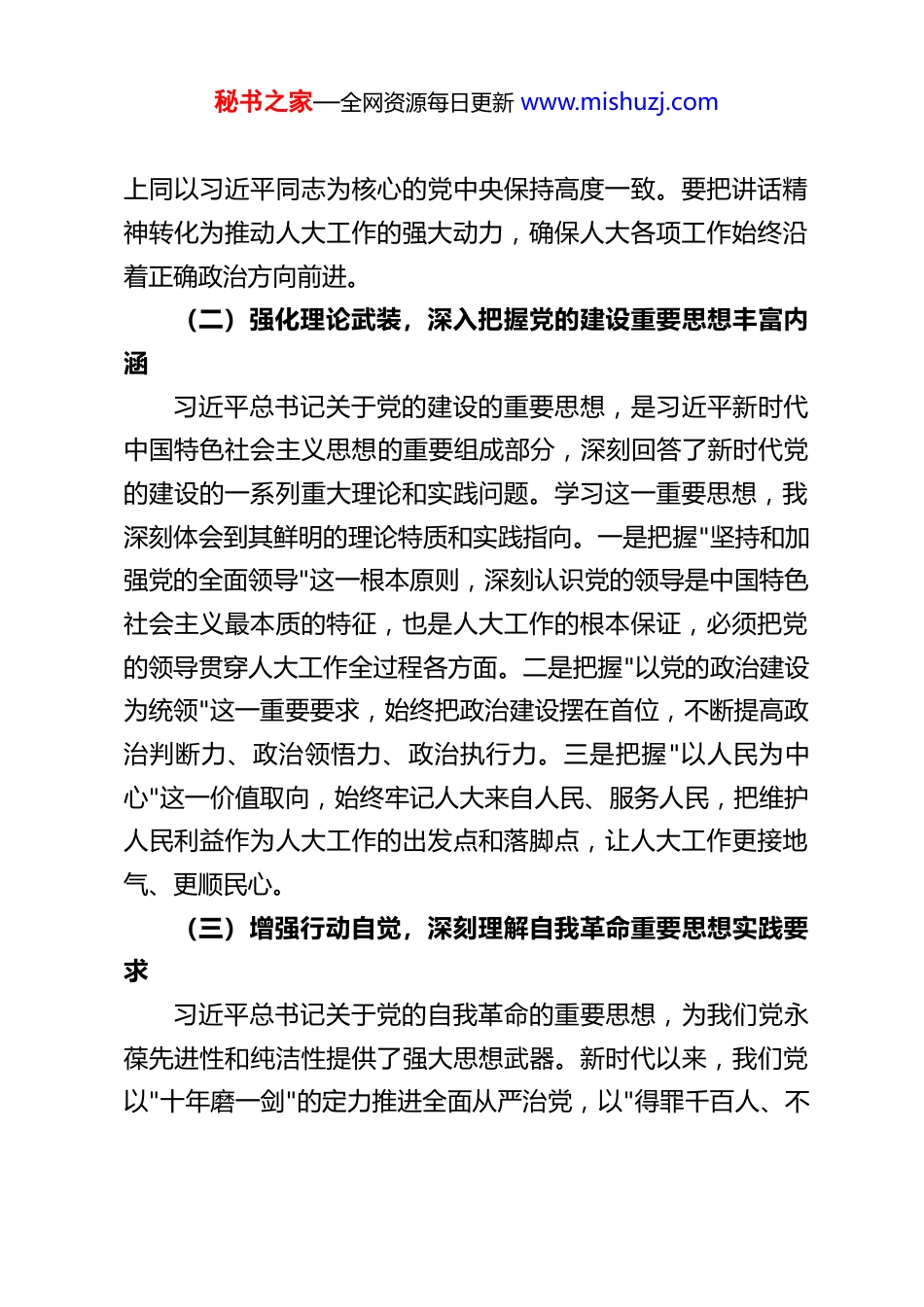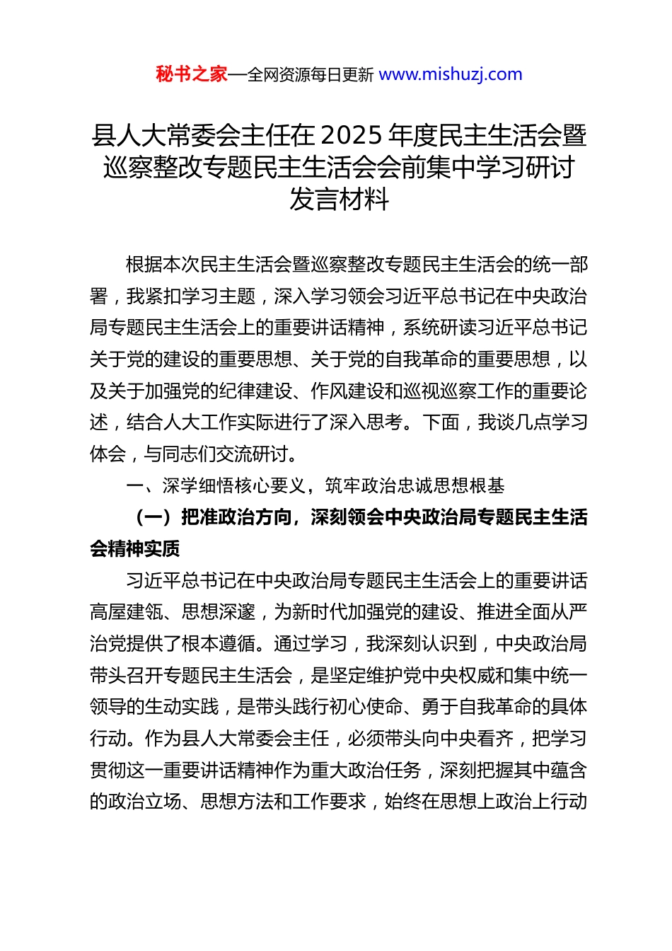 秘书之家—全网资源每日更新 www.mishuzj.com县人大常委会主任在 2025 年度民主生活会暨巡察整改专题民主生活会会前集中学习研讨发言材料根据本次民主生活会暨巡察整改专题民主生活会的统一部署,我紧扣学习主题,深入学习领会习近平总书记在中央政治局专题民主生活会上的重要讲话精神,系统研读习近平总书记关于党的建设的重要思想、关于党的自我革命的重要思想,以及关于加强党的纪律建设、作风建设和巡视巡察工作的重要论述,结合人大工作实际进行了深入思考。下面,我谈几点学习体会,与同志们交流研讨。一、深学细悟核心要义,筑牢政治忠诚思想根基(一)把准政治方向,深刻领会中央政治局专题民主生活会精神实质习近平总书记在中央政治局专题民主生活会上的重要讲话高屋建瓴、思想深邃,为新时代加强党的建设、推进全面从严治党提供了根本遵循。通过学习,我深刻认识到,中央政治局带头召开专题民主生活会,是坚定维护党中央权威和集中统一领导的生动实践,是带头践行初心使命、勇于自我革命的具体行动。作为县人大常委会主任,必须带头向中央看齐,把学习贯彻这一重要讲话精神作为重大政治任务,深刻把握其中蕴含的政治立场、思想方法和工作要求,始终在思想上政治上行动秘书之家—全网资源每日更新 www.mishuzj.com上同以习近平同志为核心的党中央保持高度一致。要把讲话精神转化为推动人大工作的强大动力,确保人大各项工作始终沿着正确政治方向前进。(二)强化理论武装,深入把握党的建设重要思想丰富内涵习近平总书记关于党的建设的重要思想,是习近平新时代中国特色社会主义思想的重要组成部分,深刻回答了新时代党的建设的一系列重大理论和实践问题。学习这一重要思想,我深刻体会到其鲜明的理论特质和实践指向。一是把握"坚持和加强党的全面领导"这一根本原则,深刻认识党的领导是中国特色社会主义最本质的特征,也是人大工作的根本保证,必须把党的领导贯穿人大工作全过程各方面。二是把握"以党的政治建设为统领"这一重要要求,始终把政治建设摆在首位,不断提高政治判断力、政治领悟力、政治执行力。三是把握"以人民为中心"这一价值取向,始终牢记人大来自人民、服务人民,把维护人民利益作为人大工作的出发点和落脚点,让人大工作更接地气、更顺民心。(三)增强行动自觉,深刻理解自我革命重要思想实践要求习近平总书记关于党的自我革命的重要思想,为我们党永葆先进性和纯洁性提供了强大思想武器。新时代以来,我们党以"十年磨一剑"的定力推进全面从严治党,以"得罪千百人、不秘书之家—全网资源每日更新 www.mishuzj.com负十四亿"的使命担当推进史无前例的反腐败斗争,取得了历史性、开创性成就。通过学习,我深刻认识到,自我革命是党跳出治乱兴衰历史周期率的第二个答案,是党永葆生机活力的关键所在。作为党员领导干部,必须以永远在路上的清醒和坚定,带头践行自我革命要求,常敲思想警钟、常思贪欲之害、常破心中之贼,不断清除思想上的尘埃、作风上的顽疾,始终保持共产党人的政治本色。要把自我革命精神融入日常工作生活,勇于正视问题、善于解决问题,以自身过硬作风带动形成风清气正的政治生态。二、聚焦纪律作风建设,锤炼过硬政治品格(一)严明纪律规矩,筑牢廉洁自律思想防线习近平总书记关于加强党的纪律建设的重要论述,深刻阐明了纪律建设的重要意义、核心要义和实践路径,为新时代加强纪律建设提供了根本遵循。党的纪律是党的各级组织和全体党员必须遵守的行为规则,是维护党的团结统一、完成党的任务的保证。作为县人大常委会主任,必须带头强化纪律意识,把纪律规矩挺在前面。一是严守政治纪律和政治规矩,始终把"两个维护"作为最高政治原则和根本政治规矩,坚决贯彻落实党中央决策部署和省、市、县委工作要求,做到令行禁止、政令畅通。二是严格遵守组织纪律,自觉服从组织安排,严格执行民主集中制,认真落实请示报告制度,绝不搞个人专断、自行其是。三是严格遵守廉洁纪律,时刻绷紧廉洁自律这根弦,秘书之家—全网资源每日更新 www.mishuzj.com自觉净化社交圈、生活圈、朋友圈,做到清清白白做人、干干净净做事,永葆清正廉洁的...