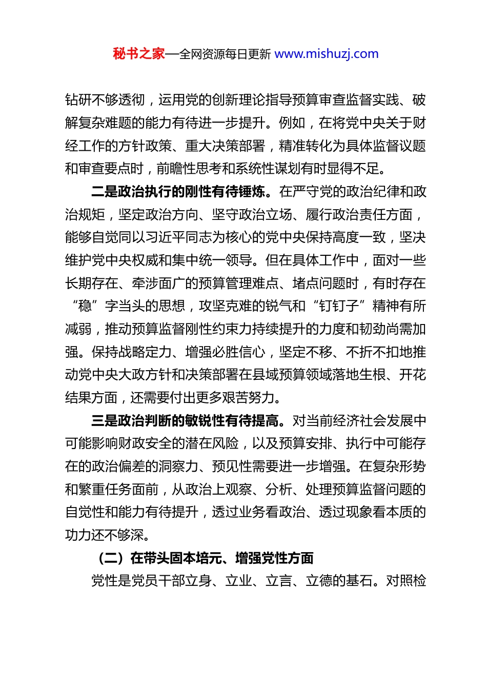 秘书之家—全网资源每日更新 www.mishuzj.comXX 县人大预算委主任 2025 年度民主生活会对照检查材料根据本次民主生活会的要求,本人紧扣会议主题,在深入学习党的创新理论、党的二十届四中全会精神、党章党规党纪以及中央八项规定及其实施细则精神的基础上,紧密结合思想、学习和工作实际,广泛征求意见建议,深入开展谈心谈话,重点围绕规定的“五个带头”方面,认真查摆自身存在的突出问题,深刻剖析思想根源,并对照反面典型案例进行反思,明确了今后的努力方向和整改措施。现将对照检查情况报告如下:一、存在的主要问题(一)在带头强化政治忠诚、提高政治能力方面深刻领悟“两个确立”的决定性意义,增强“四个意识”坚定“四个自信”、做到“两个维护”,是最高政治原则和根本政治规矩。对照检查,主要存在以下不足:一是政治领悟的深度有待加强。虽然能够坚持学习习近平新时代中国特色社会主义思想,但在将其与党的二十届四中全会关于坚持和完善中国特色社会主义制度、推进国家治理体系和治理能力现代化的战略部署,特别是与新时代人大预算审查监督工作的新要求紧密结合、融会贯通上还不够深入。有时满足于一般性了解和宏观把握,对其中蕴含的马克思主义立场、观点、方法,以及贯穿其中的领导方法、思想方法、工作方法秘书之家—全网资源每日更新 www.mishuzj.com钻研不够透彻,运用党的创新理论指导预算审查监督实践、破解复杂难题的能力有待进一步提升。例如,在将党中央关于财经工作的方针政策、重大决策部署,精准转化为具体监督议题和审查要点时,前瞻性思考和系统性谋划有时显得不足。二是政治执行的刚性有待锤炼。在严守党的政治纪律和政治规矩,坚定政治方向、坚守政治立场、履行政治责任方面,能够自觉同以习近平同志为核心的党中央保持高度一致,坚决维护党中央权威和集中统一领导。但在具体工作中,面对一些长期存在、牵涉面广的预算管理难点、堵点问题时,有时存在“稳”字当头的思想,攻坚克难的锐气和“钉钉子”精神有所减弱,推动预算监督刚性约束力持续提升的力度和韧劲尚需加强。保持战略定力、增强必胜信心,坚定不移、不折不扣地推动党中央大政方针和决策部署在县域预算领域落地生根、开花结果方面,还需要付出更多艰苦努力。三是政治判断的敏锐性有待提高。对当前经济社会发展中可能影响财政安全的潜在风险,以及预算安排、执行中可能存在的政治偏差的洞察力、预见性需要进一步增强。在复杂形势和繁重任务面前,从政治上观察、分析、处理预算监督问题的自觉性和能力有待提升,透过业务看政治、透过现象看本质的功力还不够深。(二)在带头固本培元、增强党性方面党性是党员干部立身、立业、立言、立德的基石。对照检秘书之家—全网资源每日更新 www.mishuzj.com查,主要存在以下不足:一是理论武装的主动性、系统性需提升。虽然认识到以习近平新时代中国特色社会主义思想凝心铸魂的极端重要性,但有时存在“以干代学”、“急用先学”的情况,学习的计划性、系统性不够强,对一些新思想、新论断、新要求的理解停留在概念层面,距离真正内化于心、外化于行还有差距。对党章党规党纪的学习有时不够经常和深入,运用党性原则这把标尺正心明道、修身律己的自觉性、严格性有待提高。二是理想信念的根基需持续夯实。能够坚守共产党人精神追求,但对照革命先辈和先进典型,感到自身在思想淬炼、政治历练、实践锻炼、专业训练方面还有欠缺。面对社会上的一些错误思潮和复杂现象,虽然能保持政治清醒,但在积极主动发声亮剑、坚决斗争方面有时不够鲜明有力。解决世界观、人生观、价值观“总开关”问题是一项终身课题,自身需要时刻警惕、持续拧紧。三是为民情怀的实践转化需深化。虽然牢记党的宗旨,但在预算监督工作中,如何更精准地对接群众所思所盼,推动财政资金更好用于保障和改善民生,解决人民群众急难愁盼问题上,调查研究的前瞻性、精准度还有提升空间。有时更多关注预算安排的合规性、程序性,对财政资金使用的最终效果、群众的获得感满意度跟踪问效、深入评估不够充分。四是道德品质的锤炼需常抓不懈。能够自觉遵守社会公德秘书之家—全网资源...