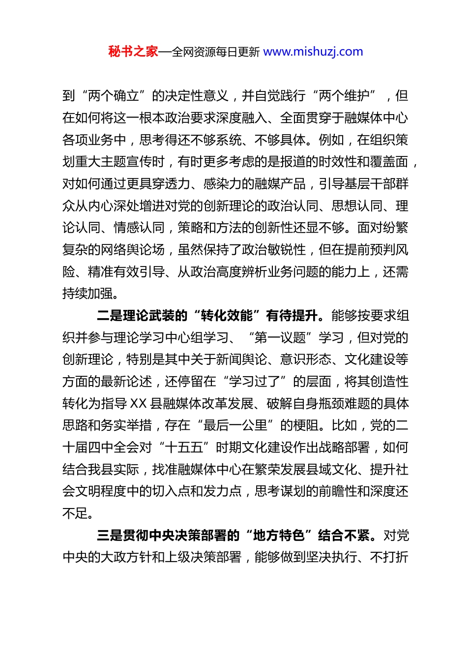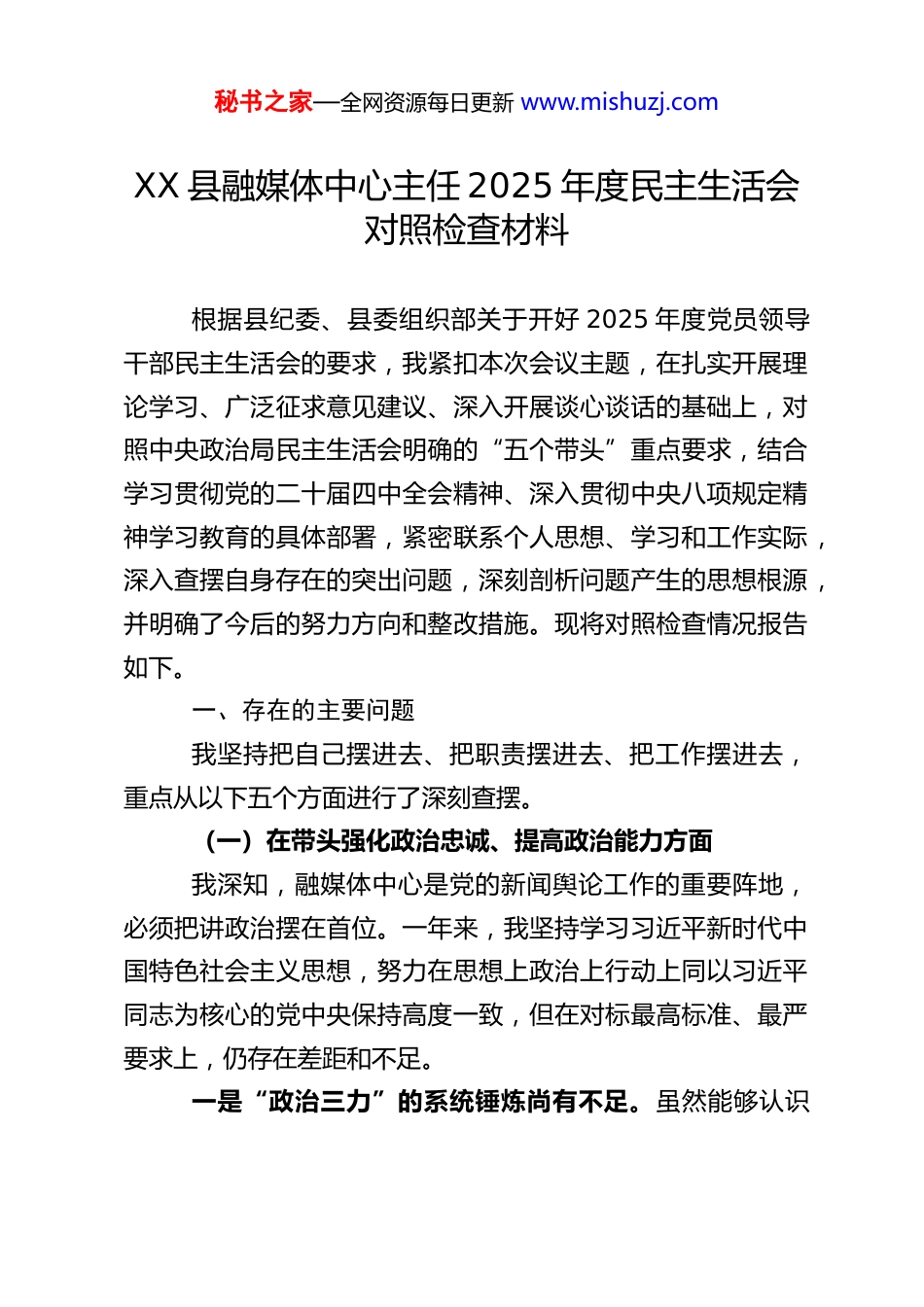 秘书之家—全网资源每日更新 www.mishuzj.comXX 县融媒体中心主任 2025 年度民主生活会对照检查材料根据县纪委、县委组织部关于开好 2025 年度党员领导干部民主生活会的要求,我紧扣本次会议主题,在扎实开展理论学习、广泛征求意见建议、深入开展谈心谈话的基础上,对照中央政治局民主生活会明确的“五个带头”重点要求,结合学习贯彻党的二十届四中全会精神、深入贯彻中央八项规定精神学习教育的具体部署,紧密联系个人思想、学习和工作实际,深入查摆自身存在的突出问题,深刻剖析问题产生的思想根源,并明确了今后的努力方向和整改措施。现将对照检查情况报告如下。一、存在的主要问题我坚持把自己摆进去、把职责摆进去、把工作摆进去,重点从以下五个方面进行了深刻查摆。(一)在带头强化政治忠诚、提高政治能力方面我深知,融媒体中心是党的新闻舆论工作的重要阵地,必须把讲政治摆在首位。一年来,我坚持学习习近平新时代中国特色社会主义思想,努力在思想上政治上行动上同以习近平同志为核心的党中央保持高度一致,但在对标最高标准、最严要求上,仍存在差距和不足。一是“政治三力”的系统锤炼尚有不足。虽然能够认识秘书之家—全网资源每日更新 www.mishuzj.com到“两个确立”的决定性意义,并自觉践行“两个维护”,但在如何将这一根本政治要求深度融入、全面贯穿于融媒体中心各项业务中,思考得还不够系统、不够具体。例如,在组织策划重大主题宣传时,有时更多考虑的是报道的时效性和覆盖面,对如何通过更具穿透力、感染力的融媒产品,引导基层干部群众从内心深处增进对党的创新理论的政治认同、思想认同、理论认同、情感认同,策略和方法的创新性还显不够。面对纷繁复杂的网络舆论场,虽然保持了政治敏锐性,但在提前预判风险、精准有效引导、从政治高度辨析业务问题的能力上,还需持续加强。二是理论武装的“转化效能”有待提升。能够按要求组织并参与理论学习中心组学习、“第一议题”学习,但对党的创新理论,特别是其中关于新闻舆论、意识形态、文化建设等方面的最新论述,还停留在“学习过了”的层面,将其创造性转化为指导 XX 县融媒体改革发展、破解自身瓶颈难题的具体思路和务实举措,存在“最后一公里”的梗阻。比如,党的二十届四中全会对“十五五”时期文化建设作出战略部署,如何结合我县实际,找准融媒体中心在繁荣发展县域文化、提升社会文明程度中的切入点和发力点,思考谋划的前瞻性和深度还不足。三是贯彻中央决策部署的“地方特色”结合不紧。对党中央的大政方针和上级决策部署,能够做到坚决执行、不打折秘书之家—全网资源每日更新 www.mishuzj.com扣。但在结合 XX 县情和融媒体中心实际进行“本土化”落地时,有时存在机械化、套路化倾向。例如,在宣传乡村振兴、营商环境优化等中心工作时,有时满足于完成规定动作的报道任务,策划推出的系列产品虽“形”具但“神”聚不足,未能充分挖掘和展现我县在落实中央精神过程中的独特实践、鲜活故事和深层变化,导致部分宣传报道的针对性、贴近性和说服力打了折扣。(二)在带头固本培元、增强党性方面我始终牢记自己的第一身份是共产党员,努力加强党性修养,但在改造主观世界、筑牢信仰之基的自觉性和彻底性上,仍需持续用力。一是世界观、人生观、价值观的“总开关”拧得不够恒紧。虽然理想信念是坚定的,但在长期、复杂的工作环境中,有时不自觉地放松了对主观世界的持续改造。面对媒体深度融合转型中的压力、困难和诱惑,偶尔会产生“歇歇脚”“等等看”的念头,那种“革命理想高于天”的豪情和攻坚克难的锐气有所消退。对照党章党规党纪进行自我检视的频率和深度不够,未能真正做到“吾日三省吾身”,用党性原则修身律己的“防护网”织得还不够密实。二是对党忠诚的实践内涵拓展不深。认为对党忠诚就是听从指挥、完成好宣传任务,这是基本的。但在新形势下,对党忠诚更体现在坚决维护党的意识形态阵地安全、在众声喧哗秘书之家—全网资源每日更新 www.mishuzj.com中敢于亮剑发声、在服务群众中彰显党的宗旨上。反思自身,在组织引导中心采编人员锤炼“脚力、眼力、脑力、笔力”,...