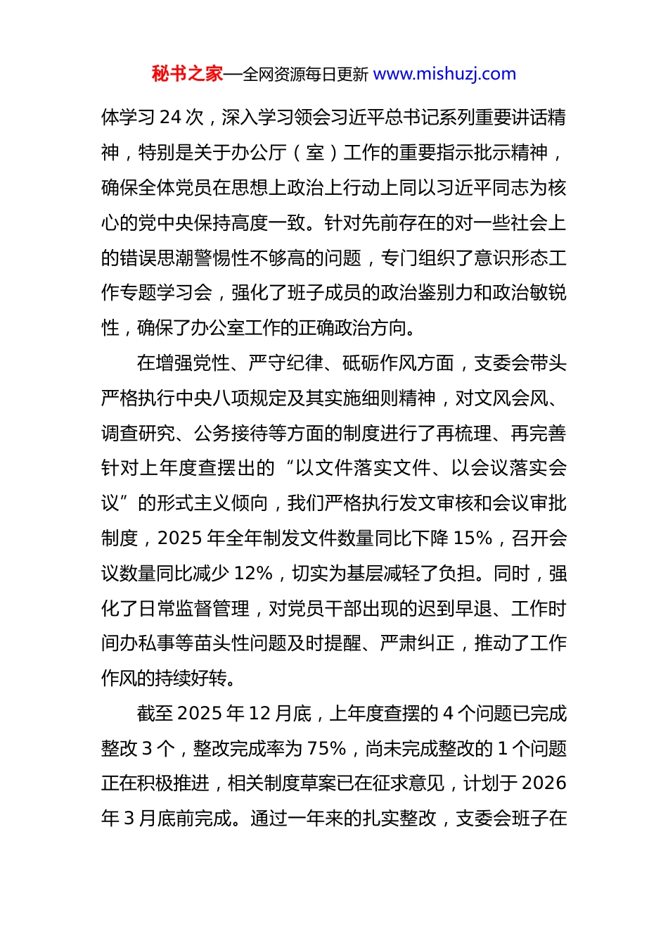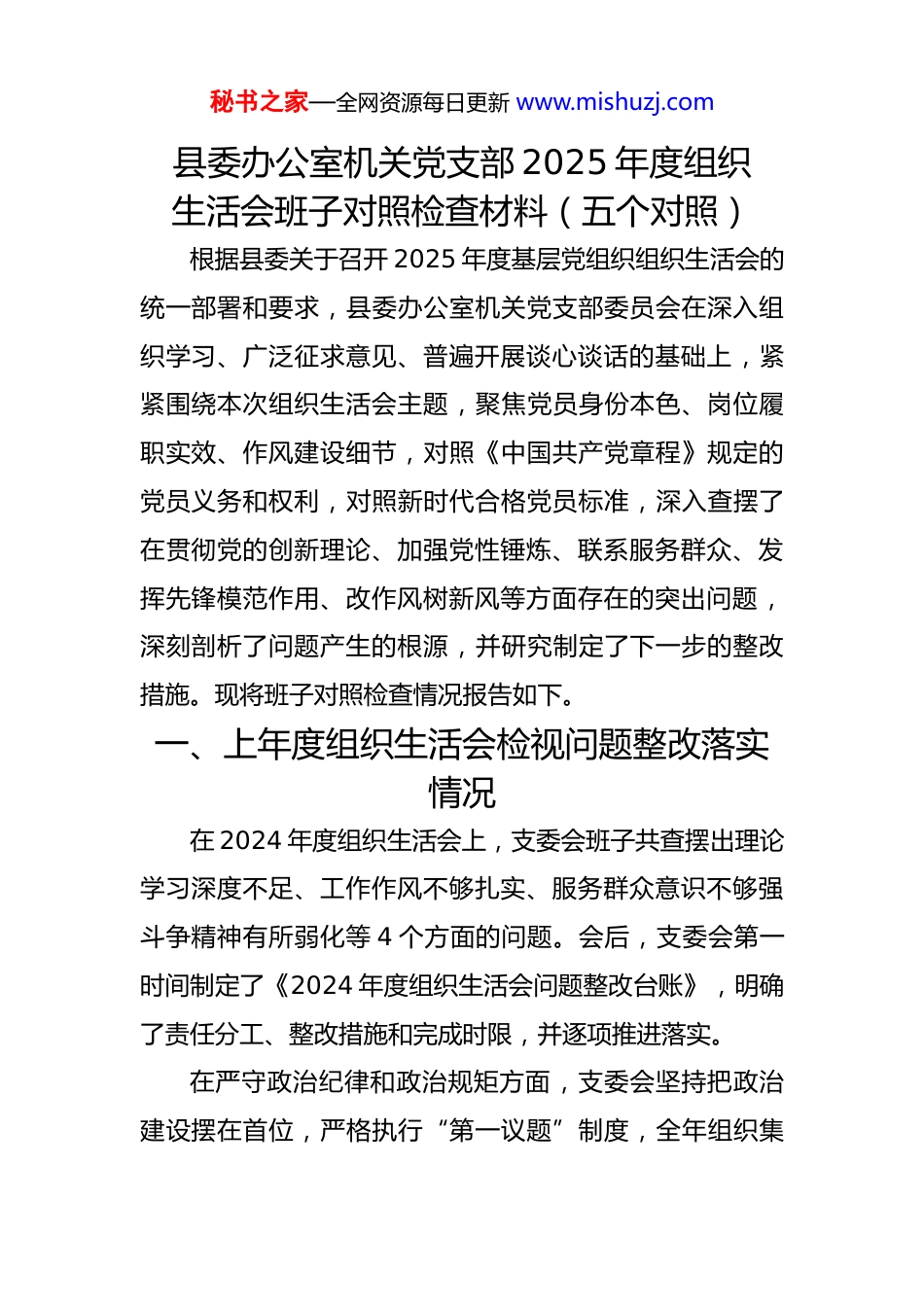 秘书之家—全网资源每日更新 www.mishuzj.com县委办公室机关党支部 2025 年度组织生活会班子对照检查材料(五个对照)根据县委关于召开 2025 年度基层党组织组织生活会的统一部署和要求,县委办公室机关党支部委员会在深入组织学习、广泛征求意见、普遍开展谈心谈话的基础上,紧紧围绕本次组织生活会主题,聚焦党员身份本色、岗位履职实效、作风建设细节,对照《中国共产党章程》规定的党员义务和权利,对照新时代合格党员标准,深入查摆了在贯彻党的创新理论、加强党性锤炼、联系服务群众、发挥先锋模范作用、改作风树新风等方面存在的突出问题,深刻剖析了问题产生的根源,并研究制定了下一步的整改措施。现将班子对照检查情况报告如下。一、上年度组织生活会检视问题整改落实情况在 2024 年度组织生活会上,支委会班子共查摆出理论学习深度不足、工作作风不够扎实、服务群众意识不够强斗争精神有所弱化等 4 个方面的问题。会后,支委会第一时间制定了《2024 年度组织生活会问题整改台账》,明确了责任分工、整改措施和完成时限,并逐项推进落实。在严守政治纪律和政治规矩方面,支委会坚持把政治建设摆在首位,严格执行“第一议题”制度,全年组织集秘书之家—全网资源每日更新 www.mishuzj.com体学习 24 次,深入学习领会习近平总书记系列重要讲话精神,特别是关于办公厅(室)工作的重要指示批示精神,确保全体党员在思想上政治上行动上同以习近平同志为核心的党中央保持高度一致。针对先前存在的对一些社会上的错误思潮警惕性不够高的问题,专门组织了意识形态工作专题学习会,强化了班子成员的政治鉴别力和政治敏锐性,确保了办公室工作的正确政治方向。在增强党性、严守纪律、砥砺作风方面,支委会带头严格执行中央八项规定及其实施细则精神,对文风会风、调查研究、公务接待等方面的制度进行了再梳理、再完善针对上年度查摆出的“以文件落实文件、以会议落实会议”的形式主义倾向,我们严格执行发文审核和会议审批制度,2025 年全年制发文件数量同比下降 15%,召开会议数量同比减少 12%,切实为基层减轻了负担。同时,强化了日常监督管理,对党员干部出现的迟到早退、工作时间办私事等苗头性问题及时提醒、严肃纠正,推动了工作作风的持续好转。截至 2025 年 12 月底,上年度查摆的 4 个问题已完成整改 3 个,整改完成率为 75%,尚未完成整改的 1 个问题正在积极推进,相关制度草案已在征求意见,计划于 2026年 3 月底前完成。通过一年来的扎实整改,支委会班子在秘书之家—全网资源每日更新 www.mishuzj.com思想认识、工作能力和服务水平等方面均取得了明显进步但仍需在今后的工作中持续巩固整改成果,以钉钉子精神推动各项工作要求落地见效。二、存在的主要问题支委会坚持问题导向,聚焦党员本位,从具体务实的角度深入查摆,发现主要存在以下五个方面的问题。(一)在学懂弄通做实、贯彻党的创新理论方面一是理论学习的“深度”有待拓展。在学习贯彻党的二十大及二十届四中全会精神等党的创新理论过程中,班子成员虽然能够做到及时跟进学习,但系统性、研究性学习还不够。有时满足于通读文件、记录要点,对理论背后的历史逻辑、理论逻辑和实践逻辑钻研得不够透彻,导致在理解把握一些新思想、新论断时,仅停留在“知其然”的层面,离“知其所以然”还有差距。比如,在组织学习关于发展新质生产力的论述时,对如何结合我县产业基础和发展实际提出具体可行的参谋建议,思考谋划得不够深入。二是知行合一的“精度”有待提升。将理论学习成果转化为推动办公室“三服务”工作高质量发展的实际成效还不够明显。虽然时常强调要用党的创新理论指导实践,但在具体工作中,有时还是习惯于凭经验、老办法办事,秘书之家—全网资源每日更新 www.mishuzj.com运用新理论分析新情况、解决新问题的能力有待加强。去年在推进机关数字化转型工作中,虽然学习了大量关于数字政府建设的理论知识,但在具体推动公文流转系统升级、优化“督查在线”平台功能时,未能充分运用系统思维进行顶层设计,导致部分功能模块与实际工作流程匹配度不高,影响了使用效率...
