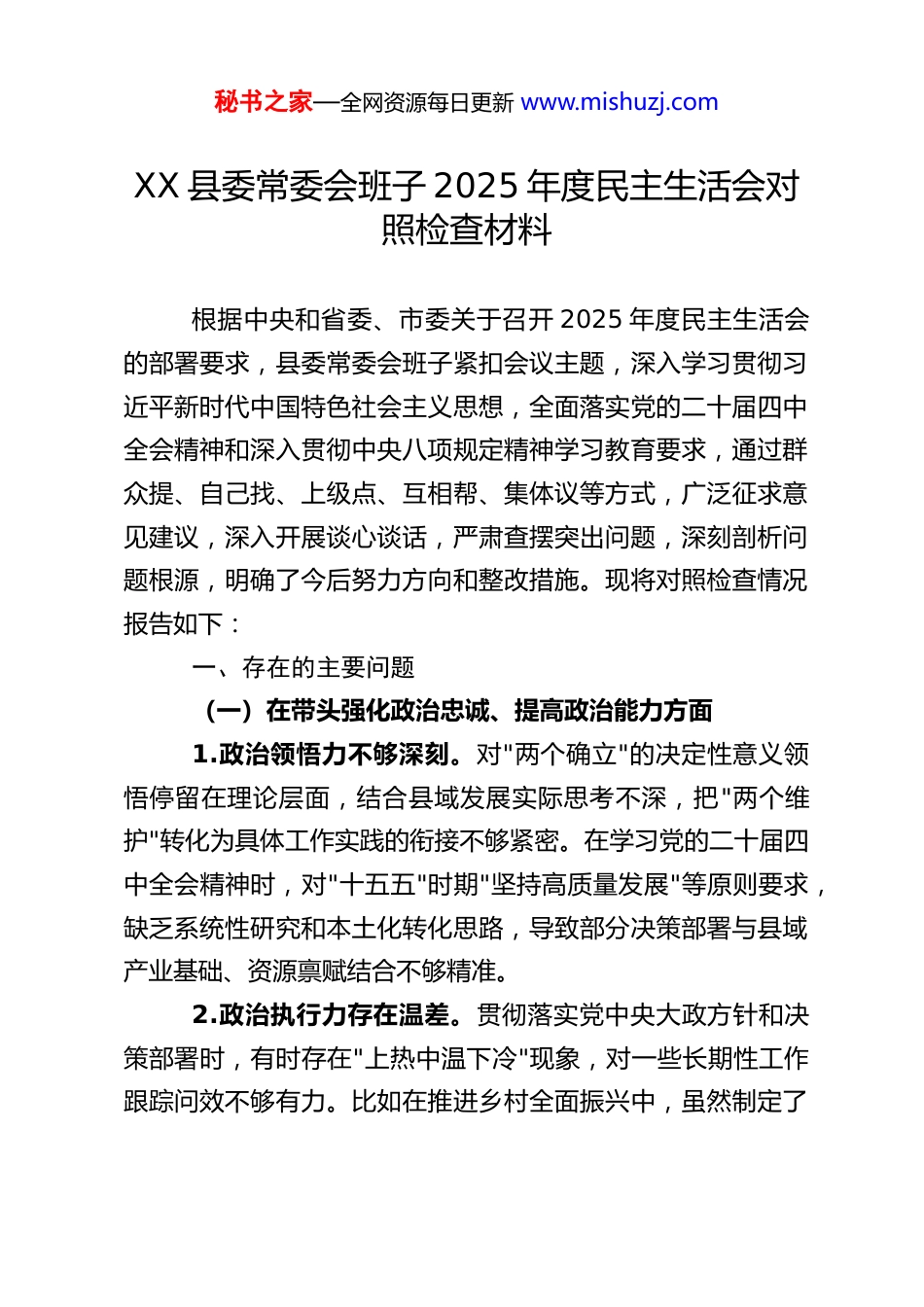秘书之家—全网资源每日更新 www.mishuzj.comXX 县委常委会班子 2025 年度民主生活会对照检查材料根据中央和省委、市委关于召开 2025 年度民主生活会的部署要求,县委常委会班子紧扣会议主题,深入学习贯彻习近平新时代中国特色社会主义思想,全面落实党的二十届四中全会精神和深入贯彻中央八项规定精神学习教育要求,通过群众提、自己找、上级点、互相帮、集体议等方式,广泛征求意见建议,深入开展谈心谈话,严肃查摆突出问题,深刻剖析问题根源,明确了今后努力方向和整改措施。现将对照检查情况报告如下:一、存在的主要问题(一)在带头强化政治忠诚、提高政治能力方面1.政治领悟力不够深刻。对"两个确立"的决定性意义领悟停留在理论层面,结合县域发展实际思考不深,把"两个维护"转化为具体工作实践的衔接不够紧密。在学习党的二十届四中全会精神时,对"十五五"时期"坚持高质量发展"等原则要求,缺乏系统性研究和本土化转化思路,导致部分决策部署与县域产业基础、资源禀赋结合不够精准。2.政治执行力存在温差。贯彻落实党中央大政方针和决策部署时,有时存在"上热中温下冷"现象,对一些长期性工作跟踪问效不够有力。比如在推进乡村全面振兴中,虽然制定了秘书之家—全网资源每日更新 www.mishuzj.com实施方案,但对产业振兴的持续性投入不足,部分村集体经济发展仍停留在初级阶段,与二十届四中全会提出的"加快农业农村现代化"要求存在差距。3.政治判断力有待提升。面对复杂多变的发展形势,对县域经济社会发展中的风险隐患排查不够全面,特别是在防范化解地方政府债务、生态环保等领域,前瞻性思考不足。在落实"统筹发展和安全"要求时,存在重发展轻安全倾向,对潜在风险预警机制不够健全,应对突发情况的预案准备不够充分。(二)在带头固本培元、增强党性方面1.理论武装不够扎实。对习近平新时代中国特色社会主义思想的学习缺乏系统性和深入性,常委会班子集体学习有时存在"以会代学"现象,专题研讨不够深入,对"世界观、人生观、价值观"总开关问题的检视不够经常。在深入贯彻中央八项规定精神学习教育中,对习近平总书记关于作风建设的重要论述学习不够透彻,结合实际学、带着问题学的针对性不强。2.党性修养锤炼不够经常。落实"把政治修养摆在党性修养首位"要求不够到位,班子成员参加双重组织生活有时不够主动,开展批评与自我批评存在"老好人"思想,辣味不足。在学习党章党规党纪时,满足于表面通读,对具体条款的理解和执行不够严格,用党性原则正心明道、修身律己的自觉性有待提升。3.理想信念根基不够牢固。面对县域发展中的困难和挑秘书之家—全网资源每日更新 www.mishuzj.com战,有时存在畏难情绪,缺乏"功成不必在我"的精神境界和"功成必定有我"的历史担当。在推动高质量发展中,对一些打基础、利长远的工作投入精力不够,在坚守共产党人精神追求、厚植为民情怀上还有差距,部分民生领域的突出问题未能及时有效解决。(三)在带头敬畏人民、敬畏组织、敬畏法纪方面1.践行群众路线不够深入。落实"四下基层"制度不够扎实,班子成员深入乡镇、村社调研存在"走马观花"现象,有时提前踩点、预设问题,未能真正倾听群众心声。在解决教育、医疗、养老等群众急难愁盼问题上,回应不够及时,比如县域内优质教育资源分配不均,农村养老服务设施不完善等问题尚未得到根本改善,与二十届四中全会提出的"加大保障和改善民生力度"要求不符。2.民主集中制执行不够严格。在重大事项决策中,有时存在"一把手"先定调、其他成员随声附和的情况,对不同意见的听取和采纳不够充分,防止"一言堂"的机制不够健全。在议事决策过程中,对部分专业性较强的事项论证不够充分,征求专家意见和群众建议的范围不够广泛,决策科学化水平有待提升。3.纪律规矩意识不够强烈。对"敬畏法纪"的认识不够深刻,班子成员在规范权力运行、防止特权思想方面自我要求不够严格。在贯彻落实中央八项规定精神中,对一些细节问题重秘书之家—全网资源每日更新 www.mishuzj.com视不够,比如公务接待中有时存在超标准现象,对下属单位存在的形式主义问题整治不够彻底。在筑牢拒腐防变思想堤坝上还有差...