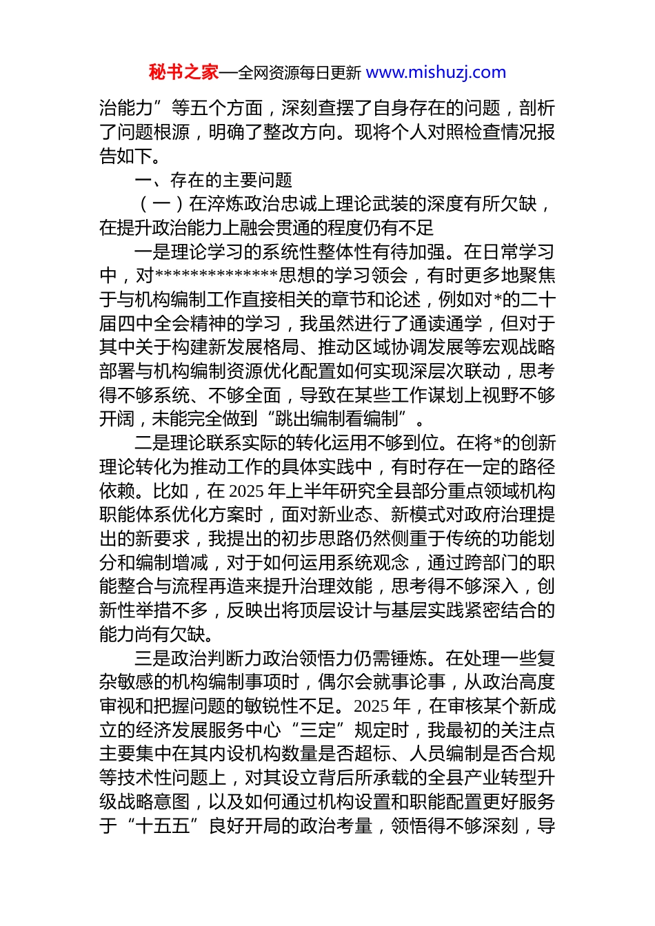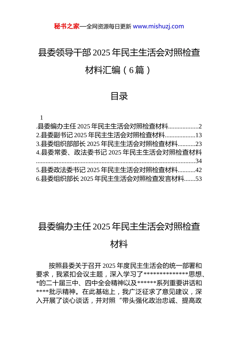 秘书之家—全网资源每日更新 www.mishuzj.com县委领导干部 2025 年民主生活会对照检查材料汇编(6 篇)目录1.县委编办主任 2025 年民主生活会对照检查材料...................22.县委副书记 2025 年民主生活会对照检查材料...................133.县委组织部部长 2025 年民主生活会对照检查材料...........234.县委常委、政法委书记 2025 年民主生活会对照检查材料...................................................................................................345.县委政法委书记 2025 年民主生活会对照检查材料...........426.县委组织部长 2025 年民主生活会对照检查发言材料.......53县委编办主任 2025 年民主生活会对照检查材料按照县委关于召开 2025 年度民主生活会的统一部署和要求,我紧扣会议主题,深入学习了**************思想、*的二十届三中、四中全会精神以及******系列重要讲话和****批示精神。在此基础上,我广泛征求了意见建议,深入开展了谈心谈话,并对照“带头强化政治忠诚、提高政秘书之家—全网资源每日更新 www.mishuzj.com治能力”等五个方面,深刻查摆了自身存在的问题,剖析了问题根源,明确了整改方向。现将个人对照检查情况报告如下。一、存在的主要问题(一)在淬炼政治忠诚上理论武装的深度有所欠缺,在提升政治能力上融会贯通的程度仍有不足一是理论学习的系统性整体性有待加强。在日常学习中,对**************思想的学习领会,有时更多地聚焦于与机构编制工作直接相关的章节和论述,例如对*的二十届四中全会精神的学习,我虽然进行了通读通学,但对于其中关于构建新发展格局、推动区域协调发展等宏观战略部署与机构编制资源优化配置如何实现深层次联动,思考得不够系统、不够全面,导致在某些工作谋划上视野不够开阔,未能完全做到“跳出编制看编制”。二是理论联系实际的转化运用不够到位。在将*的创新理论转化为推动工作的具体实践中,有时存在一定的路径依赖。比如,在 2025 年上半年研究全县部分重点领域机构职能体系优化方案时,面对新业态、新模式对政府治理提出的新要求,我提出的初步思路仍然侧重于传统的功能划分和编制增减,对于如何运用系统观念,通过跨部门的职能整合与流程再造来提升治理效能,思考得不够深入,创新性举措不多,反映出将顶层设计与基层实践紧密结合的能力尚有欠缺。三是政治判断力政治领悟力仍需锤炼。在处理一些复杂敏感的机构编制事项时,偶尔会就事论事,从政治高度审视和把握问题的敏锐性不足。2025 年,在审核某个新成立的经济发展服务中心“三定”规定时,我最初的关注点主要集中在其内设机构数量是否超标、人员编制是否合规等技术性问题上,对其设立背后所承载的全县产业转型升级战略意图,以及如何通过机构设置和职能配置更好服务于“十五五”良好开局的政治考量,领悟得不够深刻,导秘书之家—全网资源每日更新 www.mishuzj.com致在初步审核意见中未能充分体现出服务中心大局的前瞻性和战略性。(二)在坚守*性原则上自我修炼的韧劲有所松懈,在厚植为民情怀上宗旨意识的根基仍需夯实一是*性分析的深刻性有所弱化。在参加组织生活时,虽然能够坦诚地进行自我批评,但有时对于思想深处的问题挖掘不够,习惯于谈工作问题多、谈思想根源少。在2025 年度的几次*支部学习研讨中,我对于中央八项规定精神的学习,更多是分享如何规范公务接待、精简文件会议等具体做法,但对于自身是否存在享乐主义、奢靡之风的隐形变异思想苗头,是否在内心深处对“四风”问题真正做到了深恶痛绝,自我剖析的“辣味”不足,未能真正做到见人见事见思想。二是对标先进的自觉性有所降低。随着工作年限的增长,有时会不自觉地产生一丝“歇歇脚”的念头,与革命先辈和时代楷模相比,自我要求的标准在潜移默化中有所放松。例如,在处理日常繁杂的审批和协调事务时,满足于按时完成、不出差错,但对于是否能够做到精益求精、追求卓越,要求不够严格。有时一天下来,虽然身体疲惫但反思当天的工作,发现创造性、开拓性的工作不多,守成思想有所抬头,缺乏了“时时放心不下”的责任感和“事事落实到...