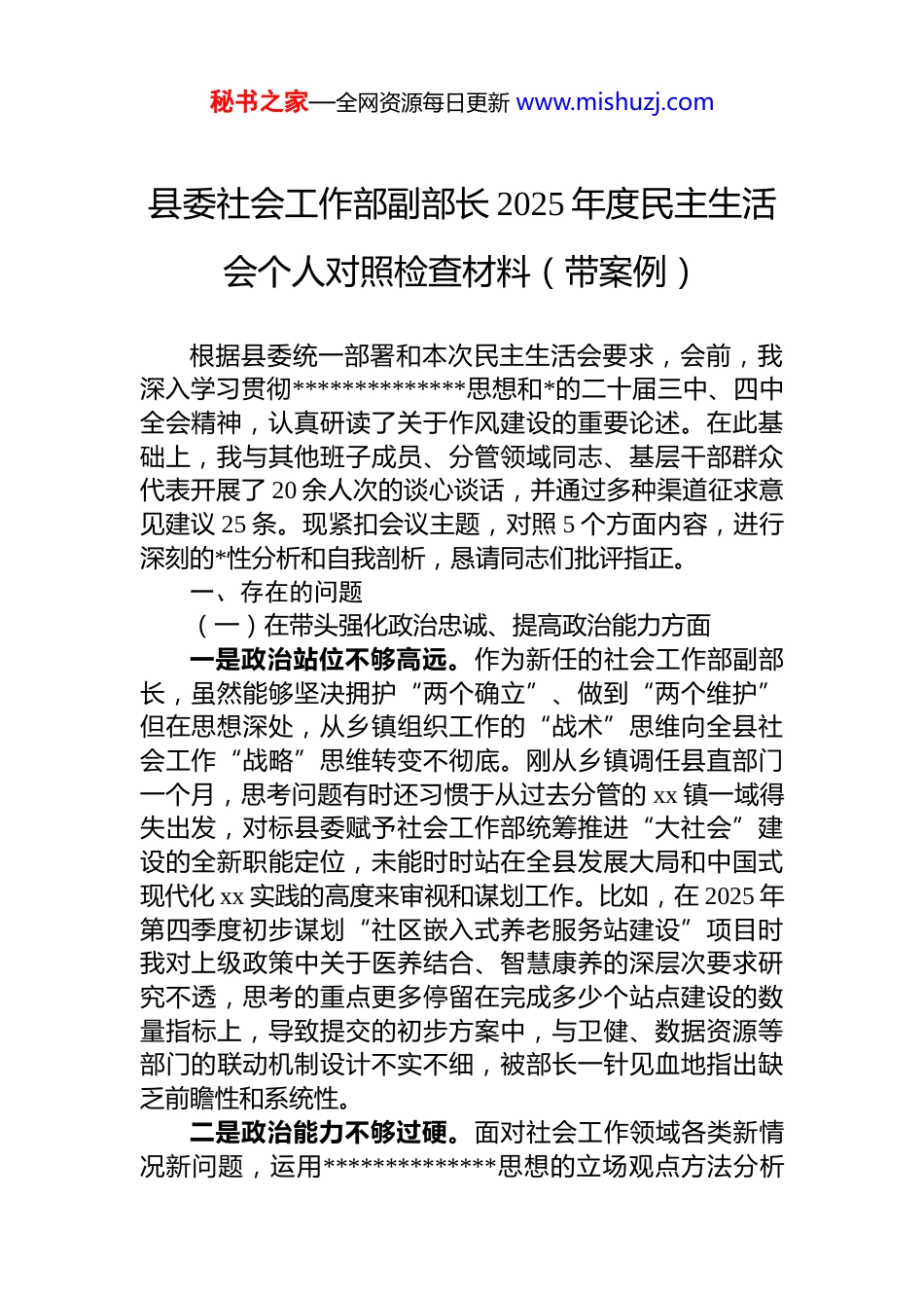 秘书之家—全网资源每日更新 www.mishuzj.com县委社会工作部副部长 2025 年度民主生活会个人对照检查材料(带案例)根据县委统一部署和本次民主生活会要求,会前,我深入学习贯彻**************思想和*的二十届三中、四中全会精神,认真研读了关于作风建设的重要论述。在此基础上,我与其他班子成员、分管领域同志、基层干部群众代表开展了 20 余人次的谈心谈话,并通过多种渠道征求意见建议 25 条。现紧扣会议主题,对照 5 个方面内容,进行深刻的*性分析和自我剖析,恳请同志们批评指正。一、存在的问题(一)在带头强化政治忠诚、提高政治能力方面一是政治站位不够高远。作为新任的社会工作部副部长,虽然能够坚决拥护“两个确立”、做到“两个维护”但在思想深处,从乡镇组织工作的“战术”思维向全县社会工作“战略”思维转变不彻底。刚从乡镇调任县直部门一个月,思考问题有时还习惯于从过去分管的 xx 镇一域得失出发,对标县委赋予社会工作部统筹推进“大社会”建设的全新职能定位,未能时时站在全县发展大局和中国式现代化 xx 实践的高度来审视和谋划工作。比如,在 2025 年第四季度初步谋划“社区嵌入式养老服务站建设”项目时我对上级政策中关于医养结合、智慧康养的深层次要求研究不透,思考的重点更多停留在完成多少个站点建设的数量指标上,导致提交的初步方案中,与卫健、数据资源等部门的联动机制设计不实不细,被部长一针见血地指出缺乏前瞻性和系统性。二是政治能力不够过硬。面对社会工作领域各类新情况新问题,运用**************思想的立场观点方法分析秘书之家—全网资源每日更新 www.mishuzj.com和解决实际问题的能力不强。我分管社会组织管理工作,面对当前经济下行压力下,部分行业协会商会生存发展困难、作用发挥不明显的现状,在如何引导其深度融入全县产业链发展、助力招商引资等中心工作上,思路不宽、办法不多。2025 年 11 月,在参加县工商联组织的民营企业家座谈会时,有 3 家行业协会负责人提出希望社会工作部能在政策扶持、资源对接上给予更多指导,我当时的回应多是原则性的、方向性的,未能结合他们的实际困难,现场拿出几条具有针对性、可操作性的“干货”,这反映出我从政治上看问题、从政治上抓工作的能力还有很大差距。三是政治执行不够坚决。对中央和省市县委的决策部署,虽然能够做到闻令而动、坚决执行,但在执行的精度和深度上还存在不足,“一竿子插到底”的韧劲不够。例如,县委在 2025 年下半年明确要求,要推动社会组织 dj 与“产业链 dj”深度融合,我虽然组织召开了推进会,也下发了指导文件,但在后续的跟踪问效上投入精力不足。截至2025 年底,全县 12 个重点产业链中,仅有 4 个产业链上的社会组织建立了功能型*支部,进度明显滞后于县委要求。究其原因,是我在推进过程中,对部分行业主管部门存在的“业务归业务、dj 归 dj”的模糊认识,没有及时进行有力的政治引导和督促纠偏,存在“上热中温下冷”的现象。(二)在带头固本培元、增强*性方面一是理论武装缺乏穿透力。对**************思想的学习,系统性和深刻性不足,存在“知其然、不知其所以然”的情况。特别是对*的二十届四中全会提出的关于完善社会治理体系、健全基层*组织领导的基层群众自治机制等一系列新思想新论断,满足于通读会议公报和新闻报道,未能沉下心来系统研读辅导材料和权威解读文章,导致在实际工作中理解不深、把握不准。2025 年 12 月,在指导 xx街道探索“dj 引领、五社联动”社区治理新模式时,我对“社会力量”在其中的功能定位和边界把握不清晰,提出秘书之家—全网资源每日更新 www.mishuzj.com的初步构想依然是“社区主导、社工执行”的传统路径,未能真正体现“多元共治”的精髓。二是*性锤炼缺乏淬炼度。在严肃的*内政治生活中锤炼*性的自觉性不强,有时满足于“按部就班”完成规定动作,自我革命的锐气有所消减。回想在乡镇任组织委员时处理 xx 村发展*员争议问题,虽然最终严格按照程序,对不符合条件的预备*员停止了转正程序,维护了*员队伍的纯洁性。但当时,我更多是把它当成一个棘手的“业...