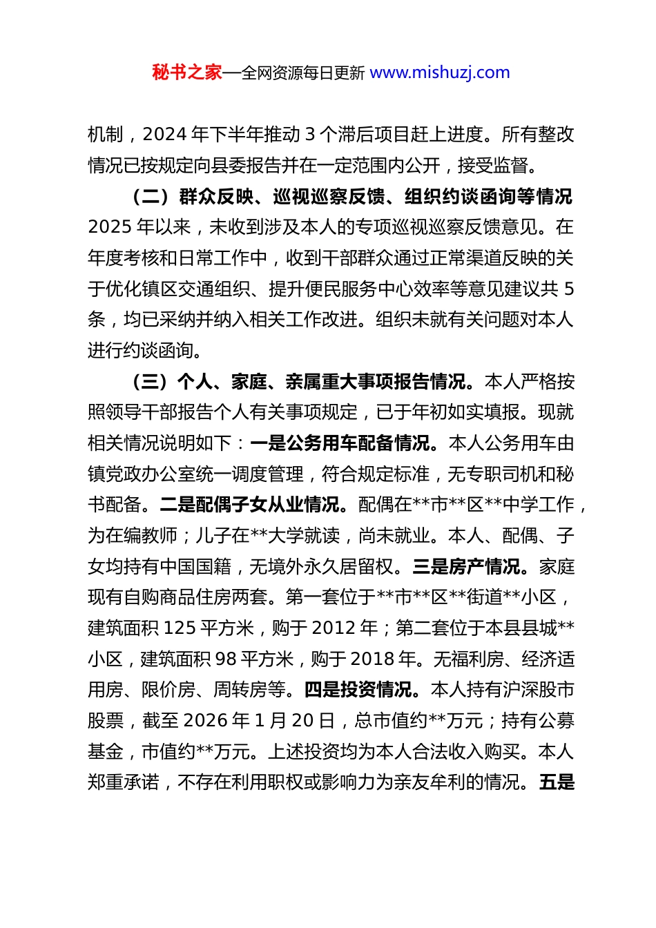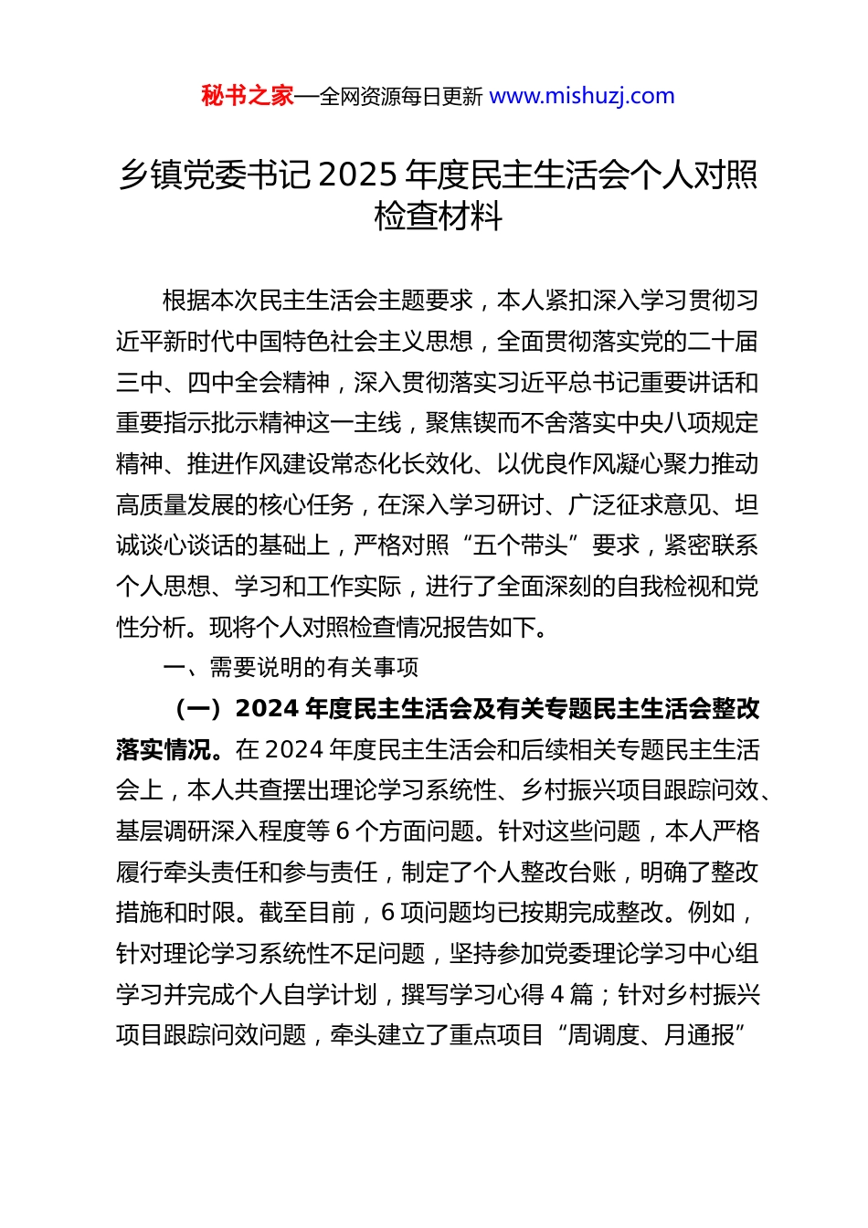 秘书之家—全网资源每日更新 www.mishuzj.com乡镇党委书记 2025 年度民主生活会个人对照检查材料根据本次民主生活会主题要求,本人紧扣深入学习贯彻习近平新时代中国特色社会主义思想,全面贯彻落实党的二十届三中、四中全会精神,深入贯彻落实习近平总书记重要讲话和重要指示批示精神这一主线,聚焦锲而不舍落实中央八项规定精神、推进作风建设常态化长效化、以优良作风凝心聚力推动高质量发展的核心任务,在深入学习研讨、广泛征求意见、坦诚谈心谈话的基础上,严格对照“五个带头”要求,紧密联系个人思想、学习和工作实际,进行了全面深刻的自我检视和党性分析。现将个人对照检查情况报告如下。一、需要说明的有关事项(一)2024 年度民主生活会及有关专题民主生活会整改落实情况。在 2024 年度民主生活会和后续相关专题民主生活会上,本人共查摆出理论学习系统性、乡村振兴项目跟踪问效、基层调研深入程度等 6 个方面问题。针对这些问题,本人严格履行牵头责任和参与责任,制定了个人整改台账,明确了整改措施和时限。截至目前,6 项问题均已按期完成整改。例如,针对理论学习系统性不足问题,坚持参加党委理论学习中心组学习并完成个人自学计划,撰写学习心得 4 篇;针对乡村振兴项目跟踪问效问题,牵头建立了重点项目“周调度、月通报”秘书之家—全网资源每日更新 www.mishuzj.com机制,2024 年下半年推动 3 个滞后项目赶上进度。所有整改情况已按规定向县委报告并在一定范围内公开,接受监督。(二)群众反映、巡视巡察反馈、组织约谈函询等情况2025 年以来,未收到涉及本人的专项巡视巡察反馈意见。在年度考核和日常工作中,收到干部群众通过正常渠道反映的关于优化镇区交通组织、提升便民服务中心效率等意见建议共 5条,均已采纳并纳入相关工作改进。组织未就有关问题对本人进行约谈函询。(三)个人、家庭、亲属重大事项报告情况。本人严格按照领导干部报告个人有关事项规定,已于年初如实填报。现就相关情况说明如下:一是公务用车配备情况。本人公务用车由镇党政办公室统一调度管理,符合规定标准,无专职司机和秘书配备。二是配偶子女从业情况。配偶在**市**区**中学工作,为在编教师;儿子在**大学就读,尚未就业。本人、配偶、子女均持有中国国籍,无境外永久居留权。三是房产情况。家庭现有自购商品住房两套。第一套位于**市**区**街道**小区,建筑面积 125 平方米,购于 2012 年;第二套位于本县县城**小区,建筑面积 98 平方米,购于 2018 年。无福利房、经济适用房、限价房、周转房等。四是投资情况。本人持有沪深股市股票,截至 2026 年 1 月 20 日,总市值约**万元;持有公募基金,市值约**万元。上述投资均为本人合法收入购买。本人郑重承诺,不存在利用职权或影响力为亲友牟利的情况。五是秘书之家—全网资源每日更新 www.mishuzj.com婚丧喜庆事宜。2025 年度,本人及直系亲属未操办婚丧喜庆事宜。(四)受到诫勉、党纪政务处分等情况。2025 年度以来,本人未受到任何诫勉、党纪政务处分。二、对照“五个带头”查摆存在的主要问题本人坚持刀刃向内,紧扣主题,围绕“五个带头”深入查摆,共梳理出 15 个具体问题。(一)在带头强化政治忠诚、提高政治能力方面。一是政治判断力不够敏锐,对标看齐存在温差。对党中央决策部署和省委、市委、县委工作要求,有时未能第一时间从政治高度深刻领会其战略意图和实践要求,存在“执行就是忠诚”的简单化认识。例如,在落实“稳定、发展、生态、强边”四件大事本地化部署时,对“稳定”的理解一度局限于社会治安,对意识形态、经济金融等领域的风险关联性、传导性研判不足,2025 年第三季度处置某涉企劳资纠纷时,初期未能将其与潜在的群体性事件风险充分关联,政治洞察力有待加强。二是政治领悟力不够透彻,融会贯通存在落差。对党的创新理论,特别是其中蕴含的领导方法、思想方法、工作方法,钻研不深、把握不准,未能完全转化为谋划工作的具体思路。学习党的二十届四中全会精神时,虽然组织了专题学习,但在结合本镇实际,将全会精神转化为发展举措方面,思路不够开阔,提...