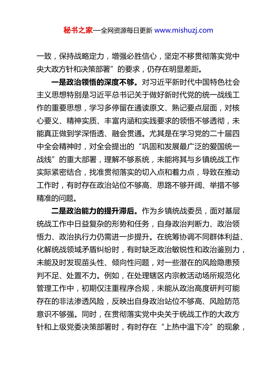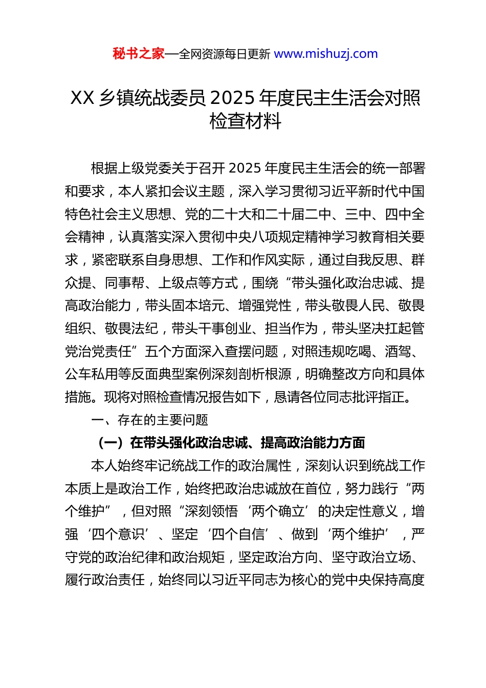 秘书之家—全网资源每日更新 www.mishuzj.comXX 乡镇统战委员 2025 年度民主生活会对照检查材料根据上级党委关于召开 2025 年度民主生活会的统一部署和要求,本人紧扣会议主题,深入学习贯彻习近平新时代中国特色社会主义思想、党的二十大和二十届二中、三中、四中全会精神,认真落实深入贯彻中央八项规定精神学习教育相关要求,紧密联系自身思想、工作和作风实际,通过自我反思、群众提、同事帮、上级点等方式,围绕“带头强化政治忠诚、提高政治能力,带头固本培元、增强党性,带头敬畏人民、敬畏组织、敬畏法纪,带头干事创业、担当作为,带头坚决扛起管党治党责任”五个方面深入查摆问题,对照违规吃喝、酒驾、公车私用等反面典型案例深刻剖析根源,明确整改方向和具体措施。现将对照检查情况报告如下,恳请各位同志批评指正。一、存在的主要问题(一)在带头强化政治忠诚、提高政治能力方面本人始终牢记统战工作的政治属性,深刻认识到统战工作本质上是政治工作,始终把政治忠诚放在首位,努力践行“两个维护”,但对照“深刻领悟‘两个确立’的决定性意义,增强‘四个意识’、坚定‘四个自信’、做到‘两个维护’,严守党的政治纪律和政治规矩,坚定政治方向、坚守政治立场、履行政治责任,始终同以习近平同志为核心的党中央保持高度秘书之家—全网资源每日更新 www.mishuzj.com一致,保持战略定力,增强必胜信心,坚定不移贯彻落实党中央大政方针和决策部署”的要求,仍存在明显差距。一是政治领悟的深度不够。对习近平新时代中国特色社会主义思想特别是习近平总书记关于做好新时代党的统一战线工作的重要思想,学习多停留在通读原文、熟记要点层面,对核心要义、精神实质、丰富内涵和实践要求的领悟不够透彻,未能真正做到学深悟透、融会贯通。尤其是在学习党的二十届四中全会精神时,对全会提出的“巩固和发展最广泛的爱国统一战线”的重大部署,理解不够系统,未能将其与乡镇统战工作实际紧密结合,找准贯彻落实的切入点和着力点,导致在推动工作时,有时存在政治站位不够高、思路不够开阔、举措不够精准的问题。二是政治能力的提升滞后。作为乡镇统战委员,面对基层统战工作中日益复杂的形势和任务,自身政治判断力、政治领悟力、政治执行力仍需进一步提升。在统筹协调不同群体利益、化解统战领域矛盾纠纷时,有时缺乏政治敏锐性和政治鉴别力,未能及时发现苗头性、倾向性问题,对一些潜在的风险隐患预判不足、处置不力。例如,在处理辖区内宗教活动场所规范化管理工作中,初期仅注重程序合规,未能从政治高度研判可能存在的非法渗透风险,反映出自身政治站位不够高、风险防范意识不够强。同时,在贯彻落实党中央关于统战工作的大政方针和上级党委决策部署时,有时存在“上热中温下冷”的现象,秘书之家—全网资源每日更新 www.mishuzj.com对一些工作部署的推进力度不够、落实不够到位,缺乏钉钉子精神,未能确保各项决策部署在基层落地生根、开花结果。三是政治纪律的执行不够严格。本人始终能够严守党的政治纪律和政治规矩,但在一些细节方面,仍存在不够严谨的问题。例如,在参加党委理论学习中心组学习、民主生活会等重要会议时,有时存在发言不够主动、不够深入的情况,对一些问题的认识不够深刻,未能充分发挥党内政治生活的锤炼作用;在日常工作中,有时存在对统战领域的政策规定宣传不够到位、解读不够精准的问题,导致部分统战对象对党的政策理解存在偏差,影响了政策的贯彻落实;在向上级党委汇报统战工作时,有时存在报喜不报忧的情况,对工作中存在的问题和不足反映不够全面、不够客观,缺乏实事求是的政治担当。(二)在带头固本培元、增强党性方面本人始终坚持把政治修养摆在党性修养的首位,自觉以习近平新时代中国特色社会主义思想凝心铸魂,努力坚守共产党人精神追求,认真学习党章党规党纪,试图解决好世界观、人生观、价值观这个总开关问题,但对照“坚持把政治修养摆在党性修养的首位,自觉以习近平新时代中国特色社会主义思想凝心铸魂,坚守共产党人精神追求,解决好世界观、人生观、价值观总开关问题,认真学习党章党规党纪,始终用党性...