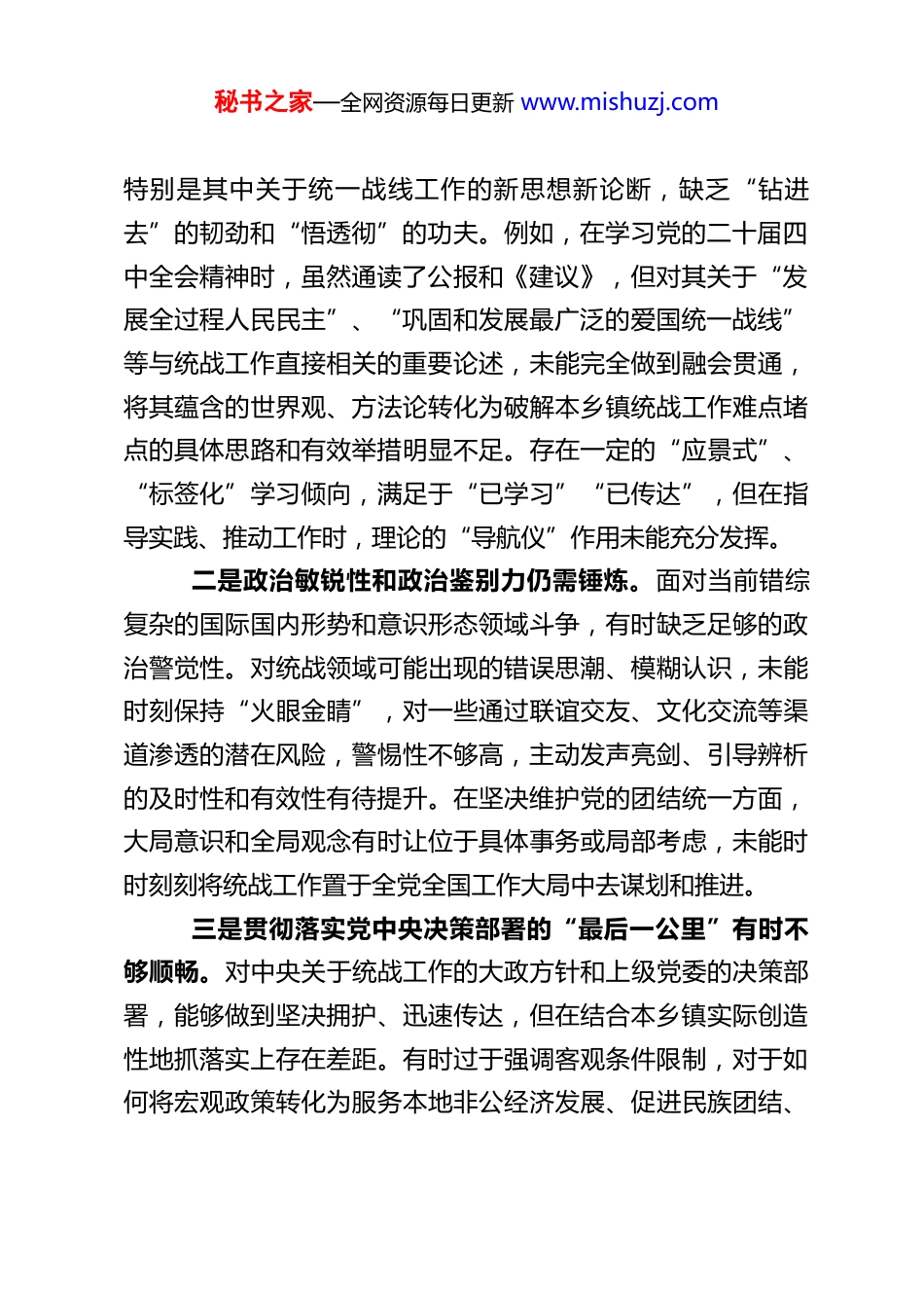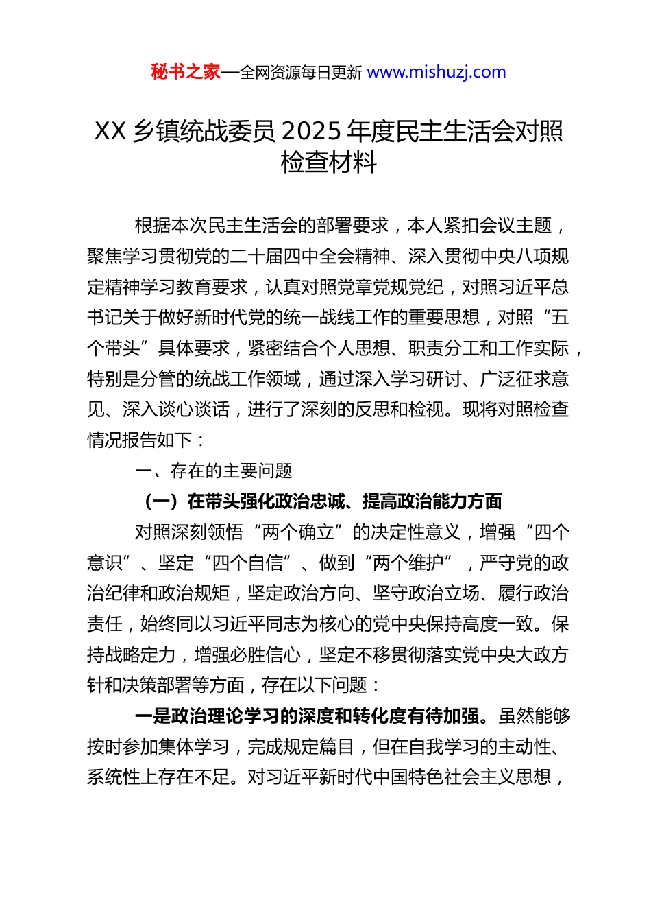 秘书之家—全网资源每日更新 www.mishuzj.comXX 乡镇统战委员 2025 年度民主生活会对照检查材料根据本次民主生活会的部署要求,本人紧扣会议主题,聚焦学习贯彻党的二十届四中全会精神、深入贯彻中央八项规定精神学习教育要求,认真对照党章党规党纪,对照习近平总书记关于做好新时代党的统一战线工作的重要思想,对照“五个带头”具体要求,紧密结合个人思想、职责分工和工作实际,特别是分管的统战工作领域,通过深入学习研讨、广泛征求意见、深入谈心谈话,进行了深刻的反思和检视。现将对照检查情况报告如下:一、存在的主要问题(一)在带头强化政治忠诚、提高政治能力方面对照深刻领悟“两个确立”的决定性意义,增强“四个意识”、坚定“四个自信”、做到“两个维护”,严守党的政治纪律和政治规矩,坚定政治方向、坚守政治立场、履行政治责任,始终同以习近平同志为核心的党中央保持高度一致。保持战略定力,增强必胜信心,坚定不移贯彻落实党中央大政方针和决策部署等方面,存在以下问题:一是政治理论学习的深度和转化度有待加强。虽然能够按时参加集体学习,完成规定篇目,但在自我学习的主动性、系统性上存在不足。对习近平新时代中国特色社会主义思想,秘书之家—全网资源每日更新 www.mishuzj.com特别是其中关于统一战线工作的新思想新论断,缺乏“钻进去”的韧劲和“悟透彻”的功夫。例如,在学习党的二十届四中全会精神时,虽然通读了公报和《建议》,但对其关于“发展全过程人民民主”、“巩固和发展最广泛的爱国统一战线”等与统战工作直接相关的重要论述,未能完全做到融会贯通,将其蕴含的世界观、方法论转化为破解本乡镇统战工作难点堵点的具体思路和有效举措明显不足。存在一定的“应景式”、“标签化”学习倾向,满足于“已学习”“已传达”,但在指导实践、推动工作时,理论的“导航仪”作用未能充分发挥。二是政治敏锐性和政治鉴别力仍需锤炼。面对当前错综复杂的国际国内形势和意识形态领域斗争,有时缺乏足够的政治警觉性。对统战领域可能出现的错误思潮、模糊认识,未能时刻保持“火眼金睛”,对一些通过联谊交友、文化交流等渠道渗透的潜在风险,警惕性不够高,主动发声亮剑、引导辨析的及时性和有效性有待提升。在坚决维护党的团结统一方面,大局意识和全局观念有时让位于具体事务或局部考虑,未能时时刻刻将统战工作置于全党全国工作大局中去谋划和推进。三是贯彻落实党中央决策部署的“最后一公里”有时不够顺畅。对中央关于统战工作的大政方针和上级党委的决策部署,能够做到坚决拥护、迅速传达,但在结合本乡镇实际创造性地抓落实上存在差距。有时过于强调客观条件限制,对于如何将宏观政策转化为服务本地非公经济发展、促进民族团结、秘书之家—全网资源每日更新 www.mishuzj.com引导宗教与社会主义社会相适应的具体行动,思考不深、办法不多,存在一定的“上下一般粗”现象,导致政策红利未能完全释放,服务大局的效能打了折扣。(二)在带头固本培元、增强党性方面对照坚持把政治修养摆在党性修养的首位,自觉以习近平新时代中国特色社会主义思想凝心铸魂,坚守共产党人精神追求,解决好世界观、人生观、价值观总开关问题。认真学习党章党规党纪,始终用党性原则正心明道、修身律己,坚定理想信念、筑牢对党忠诚、厚植为民情怀、纯正道德品质、保持清正廉洁等方面,存在以下问题:一是党性修养的主动性和常态化不足。参加组织生活有时存在“完成任务”心态,自我革命的勇气和自觉性有待加强。在开展批评与自我批评时,对自身问题的剖析有时“隔靴搔痒”,怕揭短亮丑;对待同志的批评,有时内心深处会有“抵触情绪”,未能完全做到闻过则喜、从善如流。对照党章党规党纪进行自我检视的频率和深度不够,未能真正将党性锤炼融入日常、抓在经常,导致在复杂环境和具体考验面前,理想信念的“压舱石”作用有时不够稳固。二是宗旨意识树立得不够牢固。虽然主观上知道要厚植为民情怀,但在实际工作中,“为了谁、依靠谁、我是谁”的问题有时模糊。下基层调研走访统战成员(如非公经济人士、新的社会阶层人士、少数民族群众等),有时侧重于了...