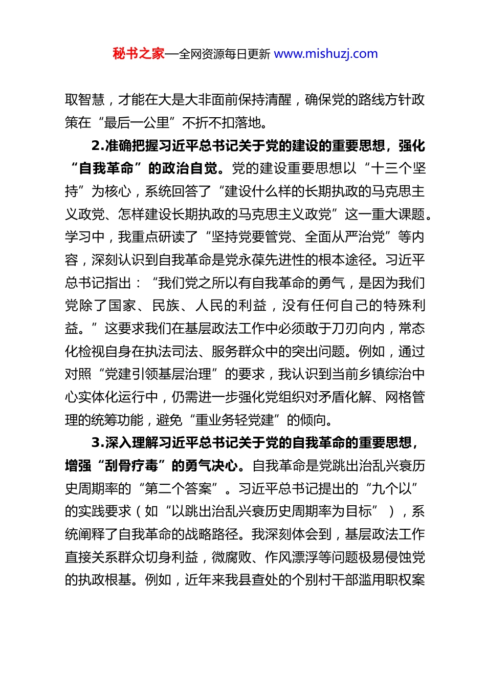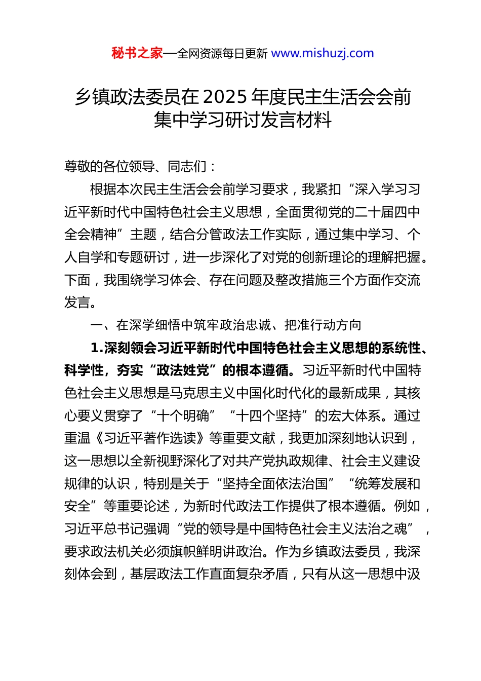 秘书之家—全网资源每日更新 www.mishuzj.com乡镇政法委员在 2025 年度民主生活会会前集中学习研讨发言材料尊敬的各位领导、同志们:根据本次民主生活会会前学习要求,我紧扣“深入学习习近平新时代中国特色社会主义思想,全面贯彻党的二十届四中全会精神”主题,结合分管政法工作实际,通过集中学习、个人自学和专题研讨,进一步深化了对党的创新理论的理解把握。下面,我围绕学习体会、存在问题及整改措施三个方面作交流发言。一、在深学细悟中筑牢政治忠诚、把准行动方向1.深刻领会习近平新时代中国特色社会主义思想的系统性、科学性,夯实“政法姓党”的根本遵循。习近平新时代中国特色社会主义思想是马克思主义中国化时代化的最新成果,其核心要义贯穿了“十个明确”“十四个坚持”的宏大体系。通过重温《习近平著作选读》等重要文献,我更加深刻地认识到,这一思想以全新视野深化了对共产党执政规律、社会主义建设规律的认识,特别是关于“坚持全面依法治国”“统筹发展和安全”等重要论述,为新时代政法工作提供了根本遵循。例如,习近平总书记强调“党的领导是中国特色社会主义法治之魂”,要求政法机关必须旗帜鲜明讲政治。作为乡镇政法委员,我深刻体会到,基层政法工作直面复杂矛盾,只有从这一思想中汲秘书之家—全网资源每日更新 www.mishuzj.com取智慧,才能在大是大非面前保持清醒,确保党的路线方针政策在“最后一公里”不折不扣落地。2.准确把握习近平总书记关于党的建设的重要思想,强化“自我革命”的政治自觉。党的建设重要思想以“十三个坚持”为核心,系统回答了“建设什么样的长期执政的马克思主义政党、怎样建设长期执政的马克思主义政党”这一重大课题。学习中,我重点研读了“坚持党要管党、全面从严治党”等内容,深刻认识到自我革命是党永葆先进性的根本途径。习近平总书记指出:“我们党之所以有自我革命的勇气,是因为我们党除了国家、民族、人民的利益,没有任何自己的特殊利益。”这要求我们在基层政法工作中必须敢于刀刃向内,常态化检视自身在执法司法、服务群众中的突出问题。例如,通过对照“党建引领基层治理”的要求,我认识到当前乡镇综治中心实体化运行中,仍需进一步强化党组织对矛盾化解、网格管理的统筹功能,避免“重业务轻党建”的倾向。3.深入理解习近平总书记关于党的自我革命的重要思想,增强“刮骨疗毒”的勇气决心。自我革命是党跳出治乱兴衰历史周期率的“第二个答案”。习近平总书记提出的“九个以”的实践要求(如“以跳出治乱兴衰历史周期率为目标”),系统阐释了自我革命的战略路径。我深刻体会到,基层政法工作直接关系群众切身利益,微腐败、作风漂浮等问题极易侵蚀党的执政根基。例如,近年来我县查处的个别村干部滥用职权案秘书之家—全网资源每日更新 www.mishuzj.com例,正是自我革命意识淡化的反面教材。通过学习,我进一步明确了必须坚持以案促改,在政法队伍中深化警示教育,做到“查处一案、警示一片、治理一域”。4.全面贯彻关于加强党的纪律建设、作风建设的重要论述,树牢“严管厚爱”的导向。习近平总书记反复强调“纪律是管党治党的戒尺”,要求“党性党风党纪一起抓”。结合新修订的《中国共产党纪律处分条例》,我重点学习了“六项纪律”的主旨要义,尤其关注与政法工作密切相关的群众纪律、工作纪律。例如,针对乡镇政法干警可能存在的“庸懒散拖”现象,必须通过常态化纪律教育强化约束。同时,作风建设关乎人心向背,习近平总书记指出“要持之以恒落实中央八项规定精神”,这要求我们在基层工作中坚决纠治形式主义、官僚主义,比如避免调解工作“纸上谈兵”,而要深入田间地头解决实际纠纷。5.深刻领悟关于巡视工作的重要论述,扛起“整改落实”的政治责任。巡视是党内监督的战略性制度安排,习近平总书记强调“巡视发现问题的目的是解决问题,要压实整改责任”。我结合县政法委近期对乡镇政法工作的专项巡察反馈,深入学习了巡视整改“四个融入”(融入日常工作、融入深化改革、融入全面从严治党、融入班子队伍建设)的要求。例如,巡察指出的“社区矫正对象监管不到位”问题,暴露出制度执行...
