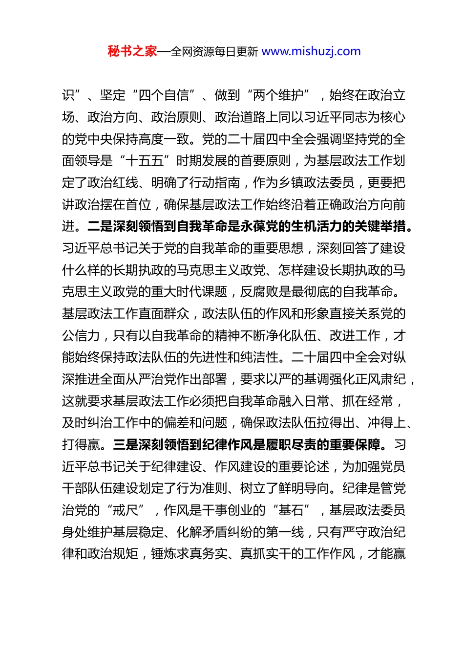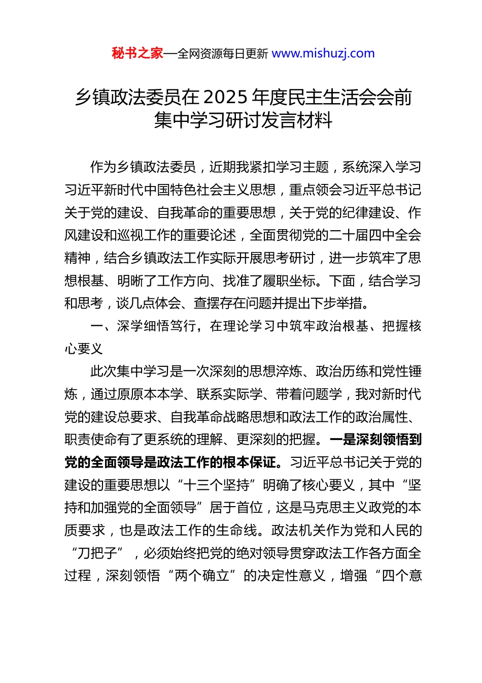 秘书之家—全网资源每日更新 www.mishuzj.com乡镇政法委员在 2025 年度民主生活会会前集中学习研讨发言材料作为乡镇政法委员,近期我紧扣学习主题,系统深入学习习近平新时代中国特色社会主义思想,重点领会习近平总书记关于党的建设、自我革命的重要思想,关于党的纪律建设、作风建设和巡视工作的重要论述,全面贯彻党的二十届四中全会精神,结合乡镇政法工作实际开展思考研讨,进一步筑牢了思想根基、明晰了工作方向、找准了履职坐标。下面,结合学习和思考,谈几点体会、查摆存在问题并提出下步举措。一、深学细悟笃行,在理论学习中筑牢政治根基、把握核心要义此次集中学习是一次深刻的思想淬炼、政治历练和党性锤炼,通过原原本本学、联系实际学、带着问题学,我对新时代党的建设总要求、自我革命战略思想和政法工作的政治属性、职责使命有了更系统的理解、更深刻的把握。一是深刻领悟到党的全面领导是政法工作的根本保证。习近平总书记关于党的建设的重要思想以“十三个坚持”明确了核心要义,其中“坚持和加强党的全面领导”居于首位,这是马克思主义政党的本质要求,也是政法工作的生命线。政法机关作为党和人民的“刀把子”,必须始终把党的绝对领导贯穿政法工作各方面全过程,深刻领悟“两个确立”的决定性意义,增强“四个意秘书之家—全网资源每日更新 www.mishuzj.com识”、坚定“四个自信”、做到“两个维护”,始终在政治立场、政治方向、政治原则、政治道路上同以习近平同志为核心的党中央保持高度一致。党的二十届四中全会强调坚持党的全面领导是“十五五”时期发展的首要原则,为基层政法工作划定了政治红线、明确了行动指南,作为乡镇政法委员,更要把讲政治摆在首位,确保基层政法工作始终沿着正确政治方向前进。二是深刻领悟到自我革命是永葆党的生机活力的关键举措。习近平总书记关于党的自我革命的重要思想,深刻回答了建设什么样的长期执政的马克思主义政党、怎样建设长期执政的马克思主义政党的重大时代课题,反腐败是最彻底的自我革命。基层政法工作直面群众,政法队伍的作风和形象直接关系党的公信力,只有以自我革命的精神不断净化队伍、改进工作,才能始终保持政法队伍的先进性和纯洁性。二十届四中全会对纵深推进全面从严治党作出部署,要求以严的基调强化正风肃纪,这就要求基层政法工作必须把自我革命融入日常、抓在经常,及时纠治工作中的偏差和问题,确保政法队伍拉得出、冲得上、打得赢。三是深刻领悟到纪律作风是履职尽责的重要保障。习近平总书记关于纪律建设、作风建设的重要论述,为加强党员干部队伍建设划定了行为准则、树立了鲜明导向。纪律是管党治党的“戒尺”,作风是干事创业的“基石”,基层政法委员身处维护基层稳定、化解矛盾纠纷的第一线,只有严守政治纪律和政治规矩,锤炼求真务实、真抓实干的工作作风,才能赢秘书之家—全网资源每日更新 www.mishuzj.com得群众信任、推动工作落实。同时,习近平总书记关于巡视工作的重要论述,彰显了党内监督的重要性,巡视工作的利剑作用启示我们,基层工作也要强化自我监督、主动接受监督,把监督要求融入政法工作各环节,做到知敬畏、存戒惧、守底线。四是深刻领悟到服务大局是政法工作的价值追求。党的二十届四中全会为“十五五”时期经济社会发展擘画了蓝图,明确了扎实推进乡村全面振兴、维护国家安全和社会稳定等重点任务。乡镇政法工作作为基层治理的重要组成部分,必须紧紧围绕全会部署,把政法工作放到乡镇发展大局中去谋划、去推进,以政法工作的实际成效护航乡村全面振兴、保障群众安居乐业,为实现“十五五”时期发展目标筑牢基层安全屏障。二、对照检视反思,在自我剖析中找准问题短板、深挖根源症结结合学习内容和政法工作实际,我坚持把自己摆进去、把职责摆进去、把工作摆进去,对照习近平新时代中国特色社会主义思想,对照习近平总书记关于党的建设、自我革命、纪律作风和巡视工作的重要论述,对照党的二十届四中全会精神和政法工作要求,深入查摆自身存在的问题和不足,主要体现在四个方面。一是理论学习的深度和实效仍有欠缺。一方面,学习的系统性不足,对习近平...
