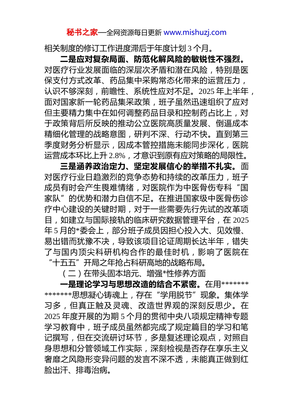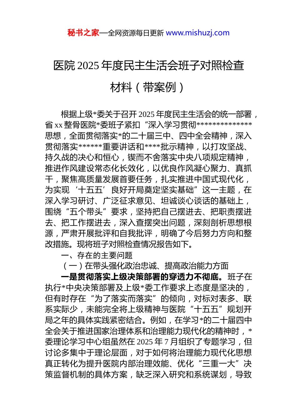 秘书之家—全网资源每日更新 www.mishuzj.com医院 2025 年度民主生活会班子对照检查材料(带案例)根据上级*委关于召开 2025 年度民主生活会的统一部署,省 xx 整骨医院*委班子紧扣“深入学习贯彻**************思想,全面贯彻落实*的二十届三中、四中全会精神,深入贯彻落实******重要讲话和****批示精神,以打攻坚战、持久战的决心和恒心,锲而不舍落实中央八项规定精神,推进作风建设常态化长效化,以优良作风凝心聚力、真抓干,聚焦高质量发展首要任务,扎实推进中国式现代化,为实现‘十五五’良好开局奠定坚实基础”这一主题,在深入学习研讨、广泛征求意见、坦诚谈心谈话的基础上,围绕“五个带头”要求,坚持把自己摆进去、把职责摆进去、把工作摆进去,深入查摆突出问题,深刻剖析思想根源,严肃开展批评和自我批评,明确了今后努力方向和整改措施。现将班子对照检查情况报告如下。一、存在的主要问题(一)在带头强化政治忠诚、提高政治能力方面一是贯彻落实上级决策部署的穿透力不彻底。班子在执行*中央决策部署及上级*委工作要求上态度是坚决的,但有时存在“为了落实而落实”的倾向,对标对表多、联系实际少,未能完全将上级精神与医院“十五五”规划开局之年的具体实践紧密结合。例如,在学习*的二十届四中全会关于推进国家治理体系和治理能力现代化的精神时,*委理论学习中心组虽然在 2025 年 7 月组织了专题学习,但讨论多集中于理论层面,对于如何将治理能力现代化思想真正转化为提升医院内部治理效能、优化“三重一大”决策监督机制的具体方案,缺乏深入研究和系统谋划,导致秘书之家—全网资源每日更新 www.mishuzj.com相关制度的修订工作进度滞后于年度计划 3 个月。二是应对复杂局面、防范化解风险的敏锐性不强烈。对医疗行业发展面临的深层次矛盾和潜在风险,特别是医保支付方式改革、药品集中采购常态化带来的运营压力,认识不够深刻,前瞻性、系统性应对不足。2025 年上半年,面对国家新一轮药品集采政策,班子虽然迅速组织了应对但主要精力集中在如何调整药品目录和控制药占比上,对于政策背后所反映的推动公立医院高质量发展、倒逼成本精细化管理的战略意图,研判不深、行动不快。直到第三季度财务分析显示,因成本管控措施未能同步深化,医院运营成本环比上升 2.8%,才意识到原有应对策略的局限性。三是涵养政治定力、坚定发展信心的举措不扎实。面对医疗行业日趋激烈的竞争态势和持续的改革压力,班子成员有时会产生畏难情绪,对医院作为中医骨伤专科“国家队”的优势和潜力自信不足。在推进国家级中医骨伤诊疗中心建设的关键时期,对于一些需要先行先试的改革项目,如建立与国际接轨的临床研究数据管理平台,在 2025年 5 月的*委会上,部分班子成员因担心投入大、见效慢、易出错而犹豫不决,导致该项目论证周期长达半年,错失了与国内顶尖科研机构合作的最佳时机,影响了医院在“十五五”开局之年抢占科研高地的战略布局。(二)在带头固本培元、增强*性修养方面一是理论学习与思想改造的结合不紧密。在用**************思想凝心铸魂上,存在“学用脱节”现象。集体学习多,但真正触及灵魂、改造世界观的深刻反思少。在2025 年度开展的为期 5 个月的贯彻中央八项规定精神专题学习教育中,班子成员虽然都完成了规定篇目的学习和笔记撰写,但在交流研讨环节,多是复述理论观点,对照自身思想和分管领域工作实际,深刻检视是否存在享乐主义奢靡之风隐形变异问题的发言不深不透,未能真正做到红脸出汗、排毒治病。秘书之家—全网资源每日更新 www.mishuzj.com二是坚守共产*人精神追求的意志不坚定。在长期和平环境和相对优越的工作条件下,艰苦奋斗、勤俭节约的意识有所淡化。虽然医院层面三公经费持续压降,2025 年同比下降 4.5%,但“看不见的浪费”依然存在。例如,在推进院区信息化升级改造过程中,对于一些非核心业务系统仍倾向于采购价格昂贵的一线品牌,而对功能同样满足需求、性价比更高的国产品牌采纳意愿不强。据后勤部门统计,仅 2025 年采购的办公电脑、打印机等设备,如果选择国产品牌,预计可节约开支近 40 ...