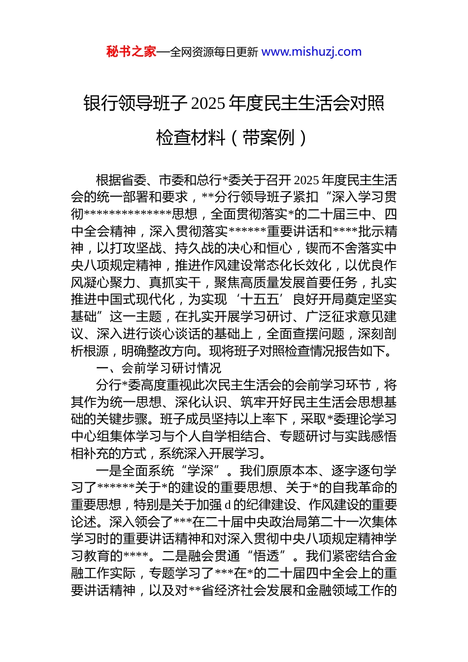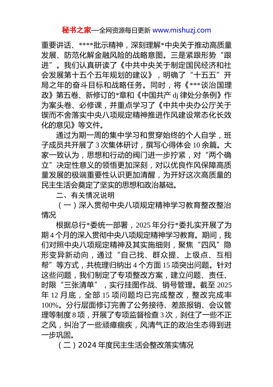 秘书之家—全网资源每日更新 www.mishuzj.com银行领导班子 2025 年度民主生活会对照检查材料(带案例)根据省委、市委和总行*委关于召开 2025 年度民主生活会的统一部署和要求,**分行领导班子紧扣“深入学习贯彻**************思想,全面贯彻落实*的二十届三中、四中全会精神,深入贯彻落实******重要讲话和****批示精神,以打攻坚战、持久战的决心和恒心,锲而不舍落实中央八项规定精神,推进作风建设常态化长效化,以优良作风凝心聚力、真抓实干,聚焦高质量发展首要任务,扎实推进中国式现代化,为实现‘十五五’良好开局奠定坚实基础”这一主题,在扎实开展学习研讨、广泛征求意见建议、深入进行谈心谈话的基础上,全面查摆问题,深刻剖析根源,明确整改方向。现将班子对照检查情况报告如下。一、会前学习研讨情况分行*委高度重视此次民主生活会的会前学习环节,将其作为统一思想、深化认识、筑牢开好民主生活会思想基础的关键步骤。班子成员坚持以上率下,采取*委理论学习中心组集体学习与个人自学相结合、专题研讨与实践感悟相补充的方式,系统深入开展学习。一是全面系统“学深”。我们原原本本、逐字逐句学习了******关于*的建设的重要思想、关于*的自我革命的重要思想,特别是关于加强 d 的纪律建设、作风建设的重要论述。深入领会了***在二十届中央政治局第二十一次集体学习时的重要讲话精神和对深入贯彻中央八项规定精神学习教育的****。二是融会贯通“悟透”。我们紧密结合金融工作实际,专题学习了***在*的二十届四中全会上的重要讲话精神,以及对**省经济社会发展和金融领域工作的秘书之家—全网资源每日更新 www.mishuzj.com重要讲话、****批示精神,深刻理解*中央关于推动高质量发展、防范化解金融风险的战略意图。三是紧跟形势“跟进”。我们认真研读了《中共中央关于制定国民经济和社会发展第十五个五年规划的建议》,明确了“十五五”开局之年的奋斗目标和战略任务。同时,将《***谈治国理政》第五卷、新修订的*章和《中国共产 dj 律处分条例》作为案头卷、必修课,并重点学习了《中共中央办公厅关于锲而不舍落实中央八项规定精神推进作风建设常态化长效化的意见》等文件。通过为期一周的集中学习和贯穿始终的个人自学,班子成员共开展了 3 次集体研讨,撰写心得体会 10 余篇。大家一致认为,思想和行动的阀门进一步拧紧,对“两个确立”决定性意义的领悟更加深刻,对以优良作风保障高质量发展的极端重要性认识更加清醒,为开好这次高质量的民主生活会奠定了坚实的思想和政治基础。二、有关情况说明(一)深入贯彻中央八项规定精神学习教育整改整治情况根据总行*委统一部署,2025 年分行*委扎实开展了为期 4 个月的深入贯彻中央八项规定精神学习教育。期间,我们对照中央八项规定精神及其实施细则,聚焦“四风”隐形变异新动向,通过“自己找、群众提、上级点、互相帮”等方式,共梳理归纳出 4 个方面 15 项突出问题。针对这些问题,我们制定了专项整改方案,建立问题、责任、时限“三张清单”,实行挂图作战、销号管理。截至 2025年 12 月底,全部 15 项问题均已完成整改,整改完成率100%。分行层面修订完善了公务接待、差旅报销、会议管理等制度 8 项,开展了专项监督检查 3 次,刹住了一些不正之风,纠治了一些顽瘴痼疾,风清气正的政治生态得到进一步巩固。(二)2024 年度民主生活会整改落实情况秘书之家—全网资源每日更新 www.mishuzj.com在 2024 年度民主生活会上,分行班子聚焦“四个带头”要求,共查摆出 4 个方面 18 项具体问题。会后,我们制定了详尽的整改方案,将任务逐一分解到班子成员和相关部门,明确了整改时限和标准。经过一年的持续努力,整改工作取得扎实成效。截至 2025 年 12 月底,18 项问题中,有 16 项已彻底完成整改,整改完成率达到 88.9%;另外 2 项涉及优化信贷结构、培养复合型人才等需要长期坚持的复杂问题,也已取得显著的阶段性成效,并转化为常态化工作举措持续推进。相关整改情况已按规定在一定范围内进行了通报。(三)本次民主生活会征求意见情况为确保问题查摆“像准...