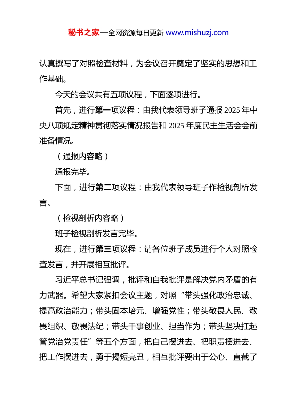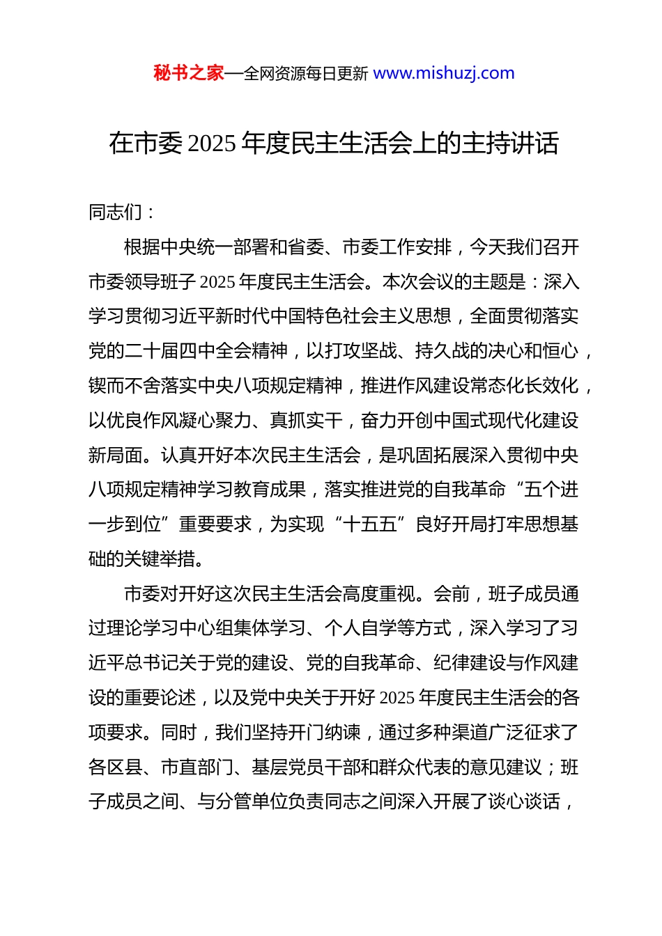 秘书之家—全网资源每日更新 www.mishuzj.com在市委 2025 年度民主生活会上的主持讲话 同志们:根据中央统一部署和省委、市委工作安排,今天我们召开市委领导班子 2025 年度民主生活会。本次会议的主题是:深入学习贯彻习近平新时代中国特色社会主义思想,全面贯彻落实党的二十届四中全会精神,以打攻坚战、持久战的决心和恒心,锲而不舍落实中央八项规定精神,推进作风建设常态化长效化,以优良作风凝心聚力、真抓实干,奋力开创中国式现代化建设新局面。认真开好本次民主生活会,是巩固拓展深入贯彻中央八项规定精神学习教育成果,落实推进党的自我革命“五个进一步到位”重要要求,为实现“十五五”良好开局打牢思想基础的关键举措。市委对开好这次民主生活会高度重视。会前,班子成员通过理论学习中心组集体学习、个人自学等方式,深入学习了习近平总书记关于党的建设、党的自我革命、纪律建设与作风建设的重要论述,以及党中央关于开好 2025 年度民主生活会的各项要求。同时,我们坚持开门纳谏,通过多种渠道广泛征求了各区县、市直部门、基层党员干部和群众代表的意见建议;班子成员之间、与分管单位负责同志之间深入开展了谈心谈话,秘书之家—全网资源每日更新 www.mishuzj.com认真撰写了对照检查材料,为会议召开奠定了坚实的思想和工作基础。今天的会议共有五项议程,下面逐项进行。首先,进行第一项议程:由我代表领导班子通报 2025 年中央八项规定精神贯彻落实情况报告和 2025 年度民主生活会会前准备情况。(通报内容略)通报完毕。下面,进行第二项议程:由我代表领导班子作检视剖析发言。(检视剖析内容略)班子检视剖析发言完毕。现在,进行第三项议程:请各位班子成员进行个人对照检查发言,并开展相互批评。习近平总书记强调,批评和自我批评是解决党内矛盾的有力武器。希望大家紧扣会议主题,对照“带头强化政治忠诚、提高政治能力;带头固本培元、增强党性;带头敬畏人民、敬畏组织、敬畏法纪;带头干事创业、担当作为;带头坚决扛起管党治党责任”等五个方面,把自己摆进去、把职责摆进去、把工作摆进去,勇于揭短亮丑,相互批评要出于公心、直截了秘书之家—全网资源每日更新 www.mishuzj.com当,达到“团结—批评—团结”的目的。首先,由我作个人对照检查发言。(个人对照检查内容略)请同志们对我提出批评意见。(听取批评意见后)感谢同志们的批评意见,我全部虚心接受,并将纳入个人整改清单,坚决抓好落实。下面,请班子成员依次发言,并开展相互批评。(班子成员依次发言并开展相互批评)同志们,刚才各位班子成员的自我批评深刻具体,相互批评坦诚中肯,体现了对党、对事业、对同志高度负责的态度,会议充满了严肃认真的政治空气和民主氛围。通过思想交锋,大家共同经历了一次深刻的党性锻炼和思想洗礼。接下来,进行第四项议程:让我们以热烈的掌声,欢迎市委督导组组长**同志进行点评讲话。(督导组组长点评讲话略)感谢**组长全面、中肯的点评。督导组的指导意见站位高、把脉准、要求实,既充分肯定了本次民主生活会的成效,也指出了我们存在的不足,更为我们下一步抓好整改、加强班子建设、改进工作作风指明了方向。我们一定要认真学习领会,全秘书之家—全网资源每日更新 www.mishuzj.com面贯彻落实。下面,由我代表市委领导班子,就抓好此次民主生活会问题整改和加强班子自身建设,作如下表态。一、在筑牢政治忠诚、提升执政能力上对标更高标准,以绝对坚定的立场抓好整改我们将把问题整改作为锤炼政治判断力、政治领悟力、政治执行力的具体实践。针对查摆出的在完整、准确、全面贯彻新发展理念,结合市情创造性落实中央决策部署方面存在的差距,我们将坚持“第一议题”制度,及时跟进学习习近平总书记最新重要讲话和指示批示精神。未来一个季度内,我们将围绕党的二十届四中全会关于推进中国式现代化的战略部署,组织市委理论学习中心组开展不少于 3 次的专题学习研讨,切实把学习成果转化为谋划“十五五”发展的清晰思路、推动高质量发展的有效举措和防范化解重大风险的实际能力。我们将严格执行民主集中制,完善市委议事...