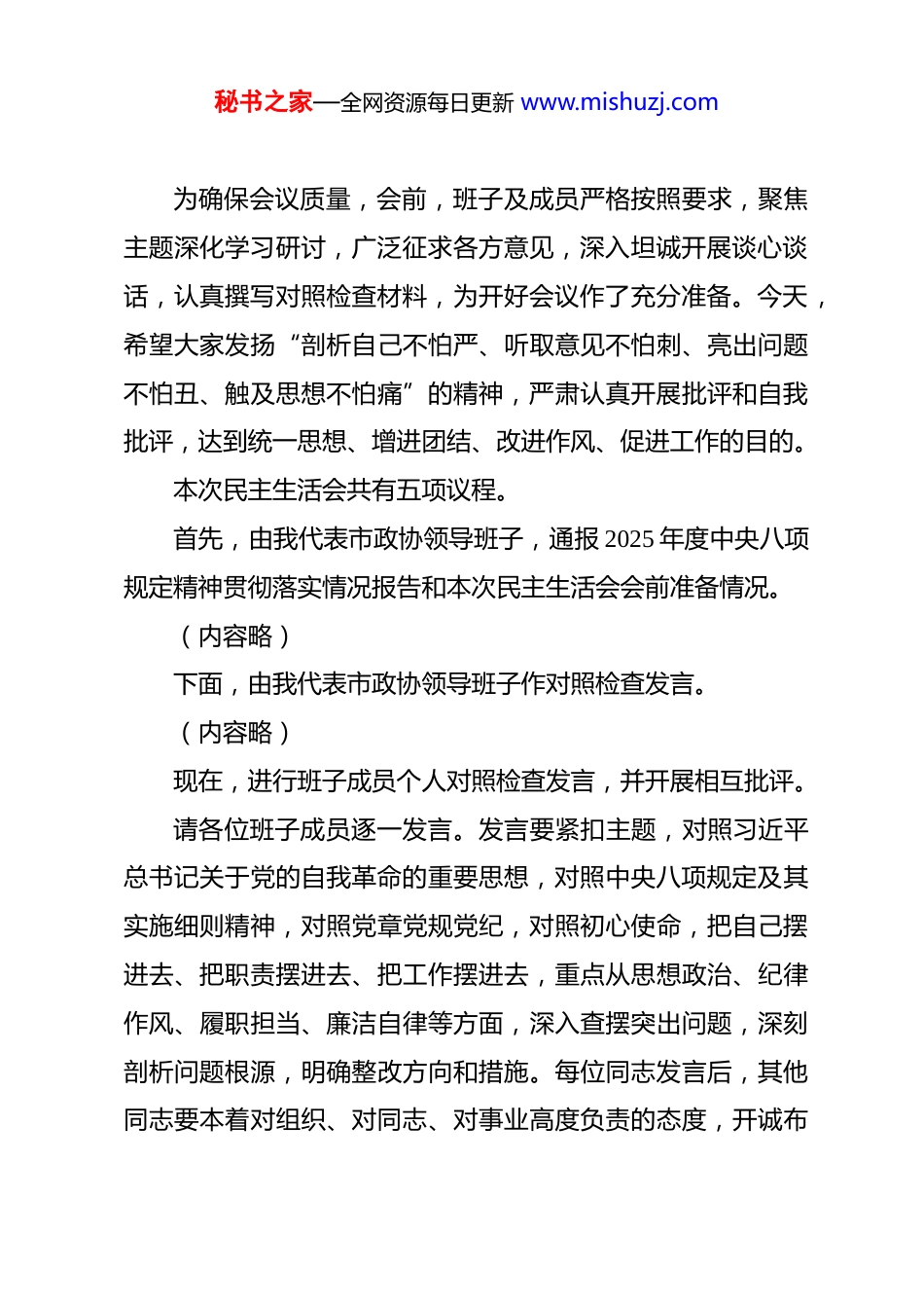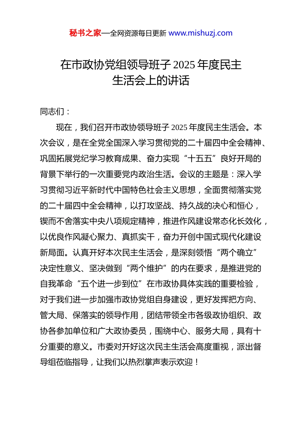 秘书之家—全网资源每日更新 www.mishuzj.com在市政协党组领导班子 2025 年度民主生活会上的讲话 同志们:现在,我们召开市政协领导班子 2025 年度民主生活会。本次会议,是在全党全国深入学习贯彻党的二十届四中全会精神、巩固拓展党纪学习教育成果、奋力实现“十五五”良好开局的背景下举行的一次重要党内政治生活。会议的主题是:深入学习贯彻习近平新时代中国特色社会主义思想,全面贯彻落实党的二十届四中全会精神,以打攻坚战、持久战的决心和恒心,锲而不舍落实中央八项规定精神,推进作风建设常态化长效化,以优良作风凝心聚力、真抓实干,奋力开创中国式现代化建设新局面。认真开好本次民主生活会,是深刻领悟“两个确立”决定性意义、坚决做到“两个维护”的内在要求,是推进党的自我革命“五个进一步到位”在市政协具体实践的重要检验,对于我们进一步加强市政协党组自身建设,更好发挥把方向、管大局、保落实的领导作用,团结带领全市各级政协组织、政协各参加单位和广大政协委员,围绕中心、服务大局,具有十分重要的意义。市委对开好这次民主生活会高度重视,派出督导组莅临指导,让我们以热烈掌声表示欢迎!秘书之家—全网资源每日更新 www.mishuzj.com为确保会议质量,会前,班子及成员严格按照要求,聚焦主题深化学习研讨,广泛征求各方意见,深入坦诚开展谈心谈话,认真撰写对照检查材料,为开好会议作了充分准备。今天,希望大家发扬“剖析自己不怕严、听取意见不怕刺、亮出问题不怕丑、触及思想不怕痛”的精神,严肃认真开展批评和自我批评,达到统一思想、增进团结、改进作风、促进工作的目的。本次民主生活会共有五项议程。首先,由我代表市政协领导班子,通报 2025 年度中央八项规定精神贯彻落实情况报告和本次民主生活会会前准备情况。(内容略)下面,由我代表市政协领导班子作对照检查发言。(内容略)现在,进行班子成员个人对照检查发言,并开展相互批评。请各位班子成员逐一发言。发言要紧扣主题,对照习近平总书记关于党的自我革命的重要思想,对照中央八项规定及其实施细则精神,对照党章党规党纪,对照初心使命,把自己摆进去、把职责摆进去、把工作摆进去,重点从思想政治、纪律作风、履职担当、廉洁自律等方面,深入查摆突出问题,深刻剖析问题根源,明确整改方向和措施。每位同志发言后,其他同志要本着对组织、对同志、对事业高度负责的态度,开诚布秘书之家—全网资源每日更新 www.mishuzj.com公、实事求是地提出批评意见。相互批评要直指问题、有的放矢,达到“红脸出汗、排毒治病”的效果。请**同志先发言。(各班子成员依次进行,内容略)接下来,让我们以热烈掌声,欢迎市委督导组组长**同志进行点评讲话。(内容略)刚才,**组长代表市委督导组作了重要讲话,肯定了会议成效,指出了不足,并对下一步整改落实工作提出了明确要求。督导组的点评讲话政治站位高、指导性强,我们完全赞同、诚恳接受,并将严格贯彻落实到后续整改和各项工作中去。下面,我代表市政协领导班子,就抓好本次民主生活会成果转化运用,郑重表态如下:一、持续淬炼政治忠诚,在深化理论武装上立起更高标准针对查摆出的理论学习的系统性、转化运用的实效性有待加强等问题,我们将把学习贯彻党的创新理论作为终身课题。深刻领悟“九个以”的实践要求,将学习贯彻党的二十届四中全会精神与深学细悟习近平总书记关于加强和改进人民政协工作的重要思想贯通起来。坚持和完善“第一议题”制度,完善理论学习中心组学习、委员读书等常态化机制,年内至少组织 4 次专题研讨,着力在深化、内化、转化上下功夫。牢记政协组织秘书之家—全网资源每日更新 www.mishuzj.com的政治属性,教育引导政协各参加单位和广大委员不断提高政治判断力、政治领悟力、政治执行力,始终在思想上政治上行动上同以习近平同志为核心的党中央保持高度一致,确保中央决策部署和省委、市委工作要求在市政协不折不扣落到实处,以实际行动筑牢团结奋斗的共同思想政治根基。二、动真碰硬狠抓整改,在解决突出问题上彰显更强决心抓好整改是民主生活会的“后半篇文章”。我们将对本次民主生...