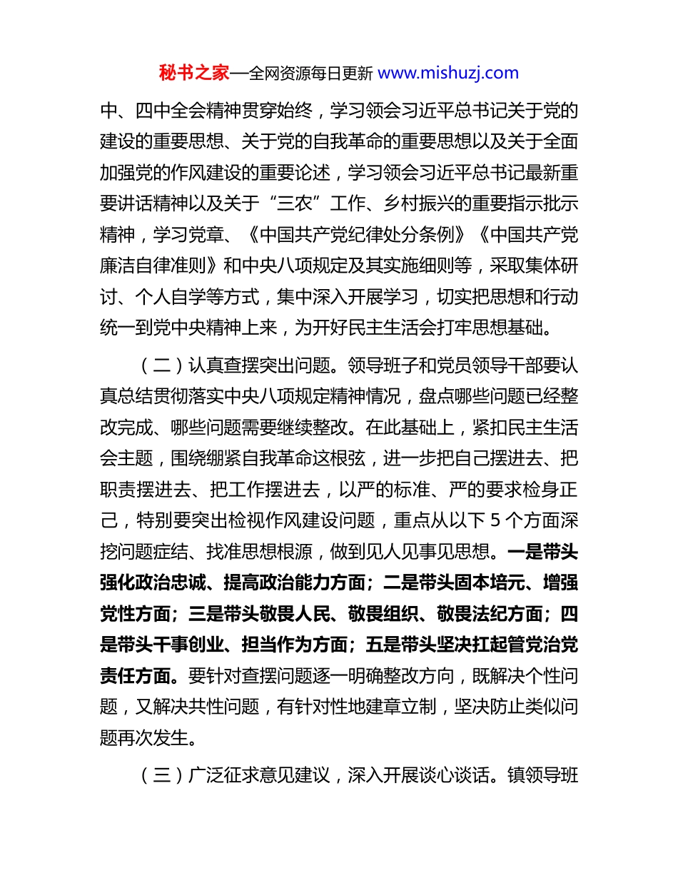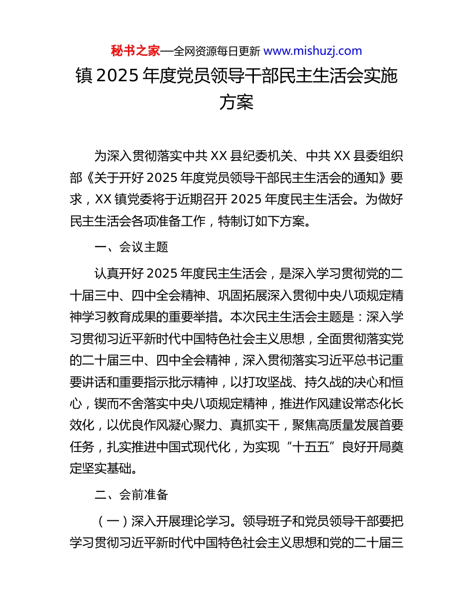 秘书之家—全网资源每日更新 www.mishuzj.com镇 2025 年度党员领导干部民主生活会实施方案为深入贯彻落实中共 XX 县纪委机关、中共 XX 县委组织部《关于开好 2025 年度党员领导干部民主生活会的通知》要求,XX 镇党委将于近期召开 2025 年度民主生活会。为做好民主生活会各项准备工作,特制订如下方案。一、会议主题认真开好 2025 年度民主生活会,是深入学习贯彻党的二十届三中、四中全会精神、巩固拓展深入贯彻中央八项规定精神学习教育成果的重要举措。本次民主生活会主题是:深入学习贯彻习近平新时代中国特色社会主义思想,全面贯彻落实党的二十届三中、四中全会精神,深入贯彻落实习近平总书记重要讲话和重要指示批示精神,以打攻坚战、持久战的决心和恒心,锲而不舍落实中央八项规定精神,推进作风建设常态化长效化,以优良作风凝心聚力、真抓实干,聚焦高质量发展首要任务,扎实推进中国式现代化,为实现“十五五”良好开局奠定坚实基础。二、会前准备(一)深入开展理论学习。领导班子和党员领导干部要把学习贯彻习近平新时代中国特色社会主义思想和党的二十届三秘书之家—全网资源每日更新 www.mishuzj.com中、四中全会精神贯穿始终,学习领会习近平总书记关于党的建设的重要思想、关于党的自我革命的重要思想以及关于全面加强党的作风建设的重要论述,学习领会习近平总书记最新重要讲话精神以及关于“三农”工作、乡村振兴的重要指示批示精神,学习党章、《中国共产党纪律处分条例》《中国共产党廉洁自律准则》和中央八项规定及其实施细则等,采取集体研讨、个人自学等方式,集中深入开展学习,切实把思想和行动统一到党中央精神上来,为开好民主生活会打牢思想基础。(二)认真查摆突出问题。领导班子和党员领导干部要认真总结贯彻落实中央八项规定精神情况,盘点哪些问题已经整改完成、哪些问题需要继续整改。在此基础上,紧扣民主生活会主题,围绕绷紧自我革命这根弦,进一步把自己摆进去、把职责摆进去、把工作摆进去,以严的标准、严的要求检身正己,特别要突出检视作风建设问题,重点从以下 5 个方面深挖问题症结、找准思想根源,做到见人见事见思想。一是带头强化政治忠诚、提高政治能力方面;二是带头固本培元、增强党性方面;三是带头敬畏人民、敬畏组织、敬畏法纪方面;四是带头干事创业、担当作为方面;五是带头坚决扛起管党治党责任方面。要针对查摆问题逐一明确整改方向,既解决个性问题,又解决共性问题,有针对性地建章立制,坚决防止类似问题再次发生。(三)广泛征求意见建议,深入开展谈心谈话。镇领导班秘书之家—全网资源每日更新 www.mishuzj.com子要坚持发扬民主、开门纳谏,采取发放征求意见表、座谈交流等方式,围绕民主生活会主题、要求重点查摆的问题等,广泛征求党员、干部和基层群众意见建议;同时,主要负责同志与班子成员之间、班子成员相互之间要进行谈心谈话,谈心谈话要一对一、面对面,既谈收获体会又谈差距不足,既谈自身缺点又谈对方问题,达到加深共识、增进团结目的。(四)认真撰写对照检查材料和个人发言提纲。在前期认真组织学习、谈心谈话的基础上,主要负责同志要主持研究起草领导班子对照检查材料,带头动手撰写个人对照检查材料和个人发言材料,并审阅把关班子成员个人发言提纲。要逐项对照 5 个方面、逐条查找、逐项梳理,找准查实存在的突出问题,深入进行党性分析,深刻挖掘问题根源,有针对性地制定整改措施。要直奔主题,不搞官样文章,不硬性纠结于字数。(五)认真开展批评与自我批评。班子成员要发扬自我革命精神,严肃认真开展批评与自我批评,打扫政治灰尘,净化政治灵魂,达到坚持真理、修正错误、增进团结的目的。(六)做好情况通报及报告。民主生活会上,主要负责同志要对上年度查摆问题和整改落实情况进行通报,对群众反映、巡视巡察反馈、组织约谈函询、个人需报告的重大事项和有关问题逐项作出说明,受到谈话函询且存在违纪问题的要作出检讨,受到问责的要作出深刻检查。如无以上情形的,要作秘书之家—全网资源每日更新 www.mishuzj.com出零报告。(七)认真抓好整改落实。会后,...
