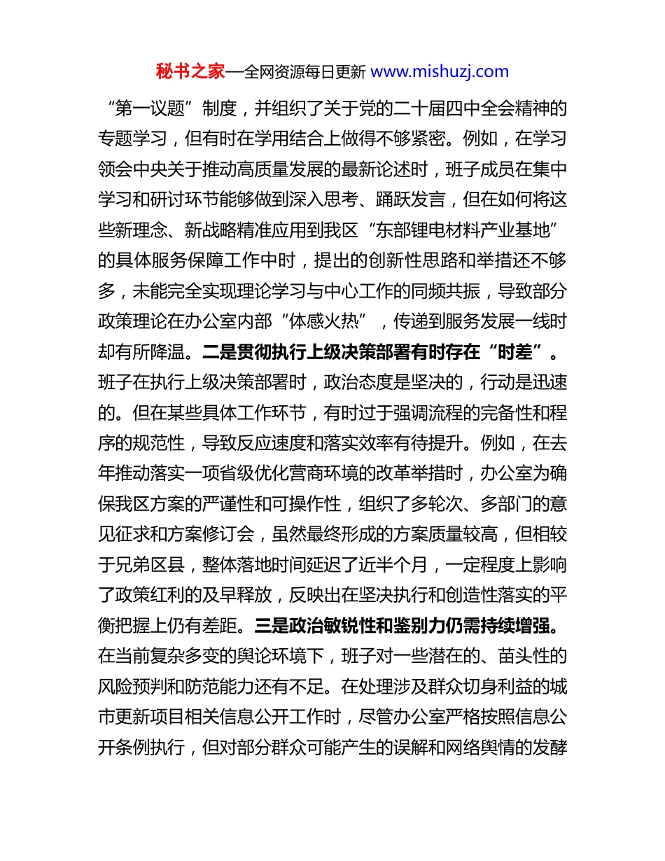 秘书之家—全网资源每日更新 www.mishuzj.com政府办公室领导班子 2025 年民主生活会对照检查材料(五个带头)根据区委关于召开 2025 年度民主生活会的统一部署,区政府办公室领导班子紧扣“深入学习贯彻习近平新时代中国特色社会主义思想,全面贯彻落实党的二十届三中、四中全会精神,深入贯彻落实习近平总书记重要讲话和重要指示批示精神,以打攻坚战、持久战的决心和恒心,锲而不舍落实中央八项规定精神,推进作风建设常态化长效化,以优良作风凝心聚力、真抓干,聚焦高质量发展首要任务,扎实推进中国式现代化,为实现‘十五五’良好开局奠定坚实基础”这一主题,在深入开展学习研讨、广泛征求意见建议、坦诚进行谈心谈话的基础上,认真总结了贯彻落实中央八项规定精神的情况,全面盘点梳理了存在的问题,深刻剖析了问题根源,明确了今后的努力方向和整改措施。现将班子对照检查情况报告如下。一、存在的主要问题对照民主生活会主题和重点查摆的 5 个方面内容,班子成员把自己摆进去、把职责摆进去、把工作摆进去,以刀刃向内的勇气检视反思,查摆出的主要问题如下。(一)在带头强化政治忠诚、提高政治能力方面。一是理论学习成果向实践转化存在“温差”。班子虽然能够严格执行秘书之家—全网资源每日更新 www.mishuzj.com“第一议题”制度,并组织了关于党的二十届四中全会精神的专题学习,但有时在学用结合上做得不够紧密。例如,在学习领会中央关于推动高质量发展的最新论述时,班子成员在集中学习和研讨环节能够做到深入思考、踊跃发言,但在如何将这些新理念、新战略精准应用到我区“东部锂电材料产业基地”的具体服务保障工作中时,提出的创新性思路和举措还不够多,未能完全实现理论学习与中心工作的同频共振,导致部分政策理论在办公室内部“体感火热”,传递到服务发展一线时却有所降温。二是贯彻执行上级决策部署有时存在“时差”。班子在执行上级决策部署时,政治态度是坚决的,行动是迅速的。但在某些具体工作环节,有时过于强调流程的完备性和程序的规范性,导致反应速度和落实效率有待提升。例如,在去年推动落实一项省级优化营商环境的改革举措时,办公室为确保我区方案的严谨性和可操作性,组织了多轮次、多部门的意见征求和方案修订会,虽然最终形成的方案质量较高,但相较于兄弟区县,整体落地时间延迟了近半个月,一定程度上影响了政策红利的及早释放,反映出在坚决执行和创造性落实的平衡把握上仍有差距。三是政治敏锐性和鉴别力仍需持续增强。在当前复杂多变的舆论环境下,班子对一些潜在的、苗头性的风险预判和防范能力还有不足。在处理涉及群众切身利益的城市更新项目相关信息公开工作时,尽管办公室严格按照信息公开条例执行,但对部分群众可能产生的误解和网络舆情的发酵秘书之家—全网资源每日更新 www.mishuzj.com点预判不足,初期更多地是采取“被动澄清”的方式应对,而非“主动引导”,导致在一段时期内网络上出现了一些杂音,虽然最终得到妥善处置,但暴露出班子在运用政治智慧驾驭复杂局面、防范化解意识形态领域风险方面的能力仍需加强。(二)在带头固本培元、增强党性方面。一是党性锤炼的“熔炉”温度有待提升。班子能够认真组织“三会一课”、主题党日等党内政治生活,并利用本区丰富的红色资源开展党性教育。但有时党性教育活动的“仪式感”较强,而思想上的“触动感”略显不足。比如,在组织参观红色革命旧址时,活动流程设计严谨,讲解学习也很到位,但活动结束后的思想交流和灵魂拷问环节相对偏弱,少数同志满足于“身到”而非“心到”,未能真正将革命先辈的崇高精神内化为自身改造主观世界、指导现实工作的强大动力。二是对不良风气的斗争精神有所弱化。班子成员能够做到严于律己,带头遵守廉洁自律各项规定。但在日常工作中,对于一些社会上存在的“圈子文化”、人情往来等不良风气,有时会抱有“只要不碰红线、守住底线即可”的心态,缺乏旗帜鲜明作斗争的锐气。在一些非原则性的问题上,有时会“睁一只眼闭一只眼”,或者以提醒代替批评,担心批评过严会影响同志间的团结与和谐。这种思想上的“绥靖主义”,实质上是党...