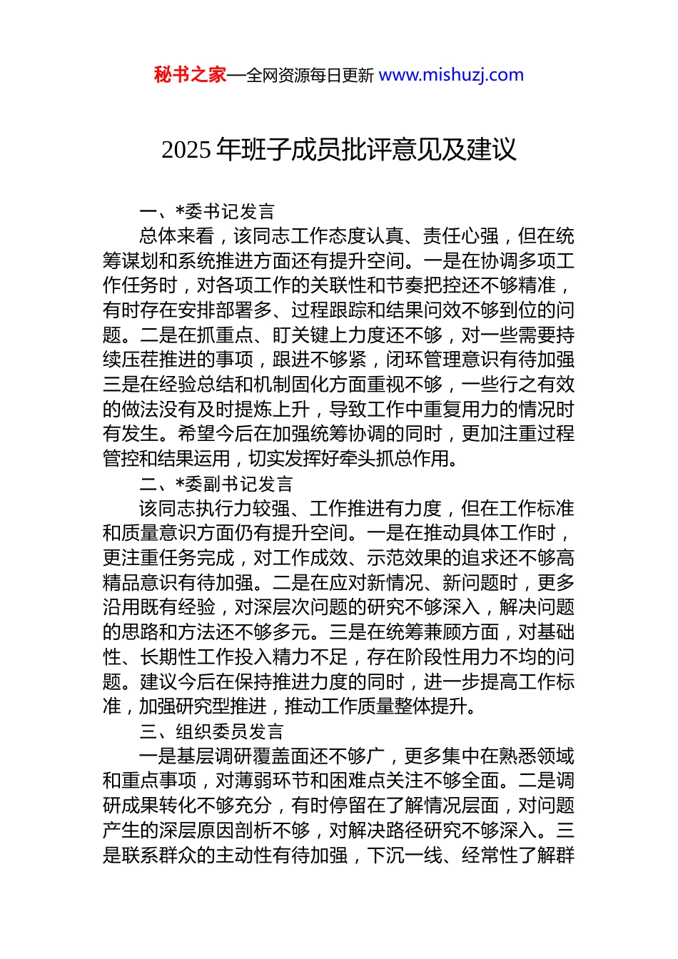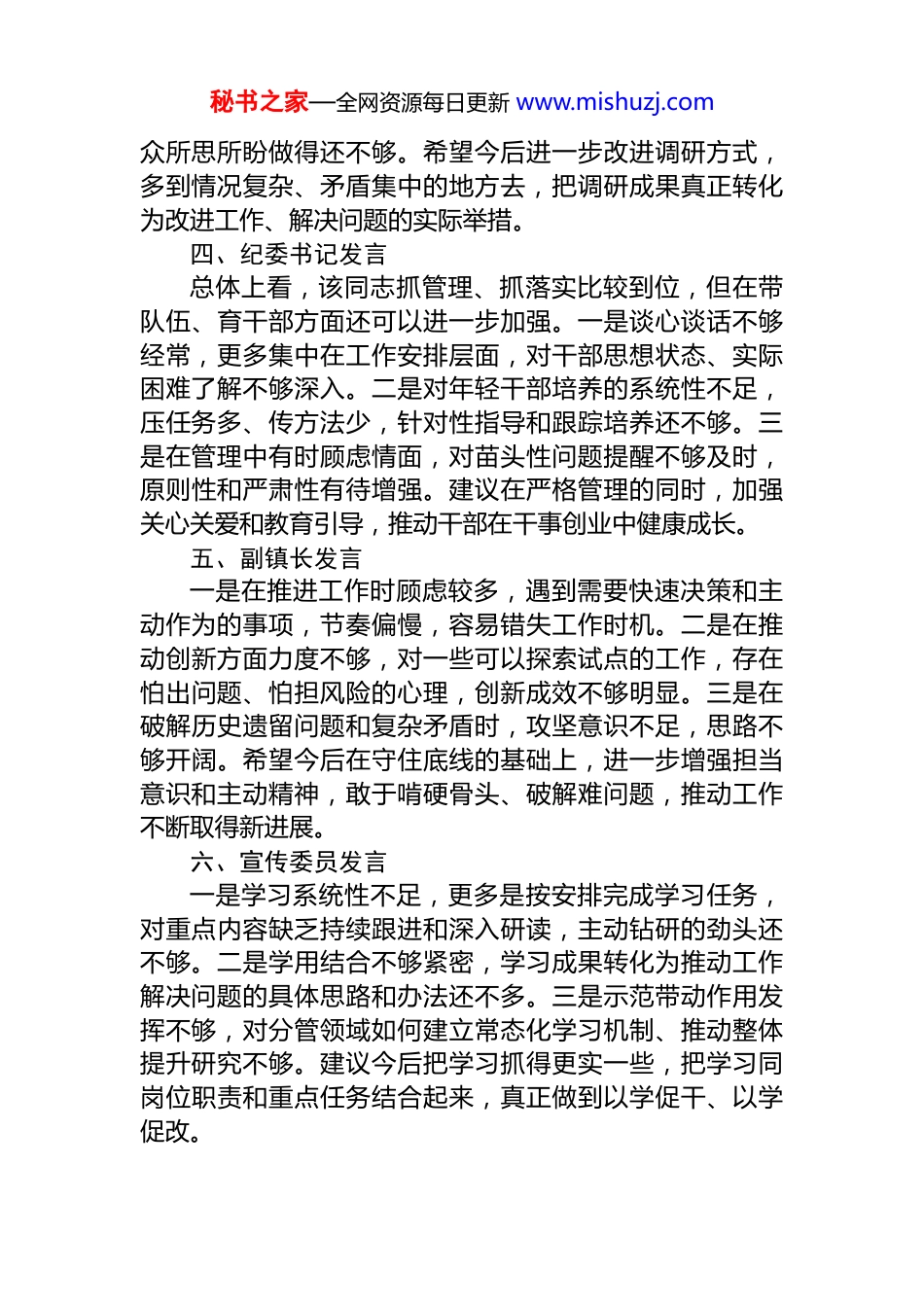 秘书之家—全网资源每日更新 www.mishuzj.com2025 年班子成员批评意见及建议一、*委书记发言总体来看,该同志工作态度认真、责任心强,但在统筹谋划和系统推进方面还有提升空间。一是在协调多项工作任务时,对各项工作的关联性和节奏把控还不够精准,有时存在安排部署多、过程跟踪和结果问效不够到位的问题。二是在抓重点、盯关键上力度还不够,对一些需要持续压茬推进的事项,跟进不够紧,闭环管理意识有待加强三是在经验总结和机制固化方面重视不够,一些行之有效的做法没有及时提炼上升,导致工作中重复用力的情况时有发生。希望今后在加强统筹协调的同时,更加注重过程管控和结果运用,切实发挥好牵头抓总作用。二、*委副书记发言该同志执行力较强、工作推进有力度,但在工作标准和质量意识方面仍有提升空间。一是在推动具体工作时,更注重任务完成,对工作成效、示范效果的追求还不够高精品意识有待加强。二是在应对新情况、新问题时,更多沿用既有经验,对深层次问题的研究不够深入,解决问题的思路和方法还不够多元。三是在统筹兼顾方面,对基础性、长期性工作投入精力不足,存在阶段性用力不均的问题。建议今后在保持推进力度的同时,进一步提高工作标准,加强研究型推进,推动工作质量整体提升。三、组织委员发言一是基层调研覆盖面还不够广,更多集中在熟悉领域和重点事项,对薄弱环节和困难点关注不够全面。二是调研成果转化不够充分,有时停留在了解情况层面,对问题产生的深层原因剖析不够,对解决路径研究不够深入。三是联系群众的主动性有待加强,下沉一线、经常性了解群秘书之家—全网资源每日更新 www.mishuzj.com众所思所盼做得还不够。希望今后进一步改进调研方式,多到情况复杂、矛盾集中的地方去,把调研成果真正转化为改进工作、解决问题的实际举措。四、纪委书记发言总体上看,该同志抓管理、抓落实比较到位,但在带队伍、育干部方面还可以进一步加强。一是谈心谈话不够经常,更多集中在工作安排层面,对干部思想状态、实际困难了解不够深入。二是对年轻干部培养的系统性不足,压任务多、传方法少,针对性指导和跟踪培养还不够。三是在管理中有时顾虑情面,对苗头性问题提醒不够及时,原则性和严肃性有待增强。建议在严格管理的同时,加强关心关爱和教育引导,推动干部在干事创业中健康成长。五、副镇长发言一是在推进工作时顾虑较多,遇到需要快速决策和主动作为的事项,节奏偏慢,容易错失工作时机。二是在推动创新方面力度不够,对一些可以探索试点的工作,存在怕出问题、怕担风险的心理,创新成效不够明显。三是在破解历史遗留问题和复杂矛盾时,攻坚意识不足,思路不够开阔。希望今后在守住底线的基础上,进一步增强担当意识和主动精神,敢于啃硬骨头、破解难问题,推动工作不断取得新进展。六、宣传委员发言一是学习系统性不足,更多是按安排完成学习任务,对重点内容缺乏持续跟进和深入研读,主动钻研的劲头还不够。二是学用结合不够紧密,学习成果转化为推动工作解决问题的具体思路和办法还不多。三是示范带动作用发挥不够,对分管领域如何建立常态化学习机制、推动整体提升研究不够。建议今后把学习抓得更实一些,把学习同岗位职责和重点任务结合起来,真正做到以学促干、以学促改。