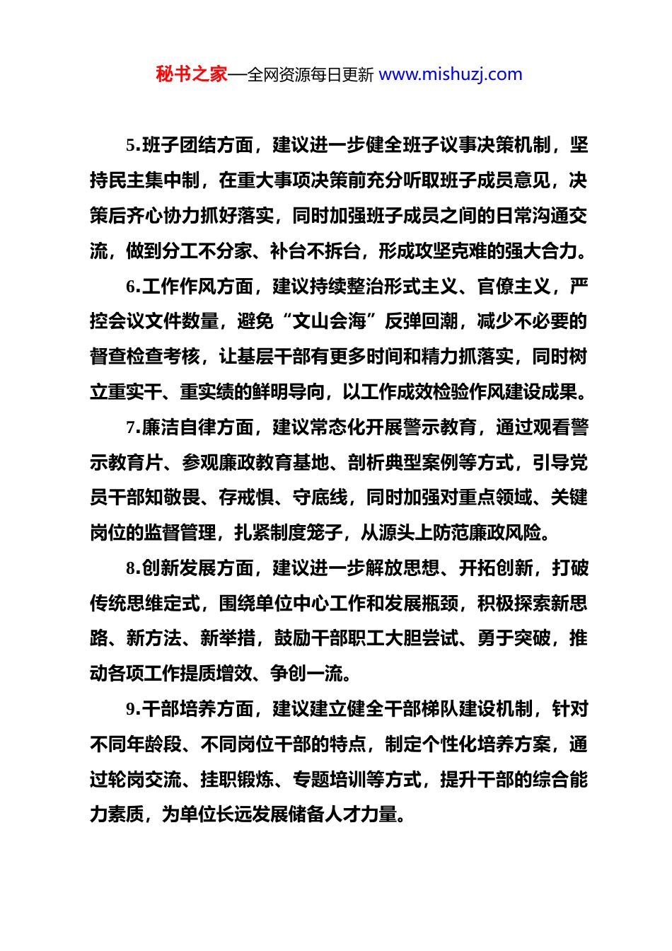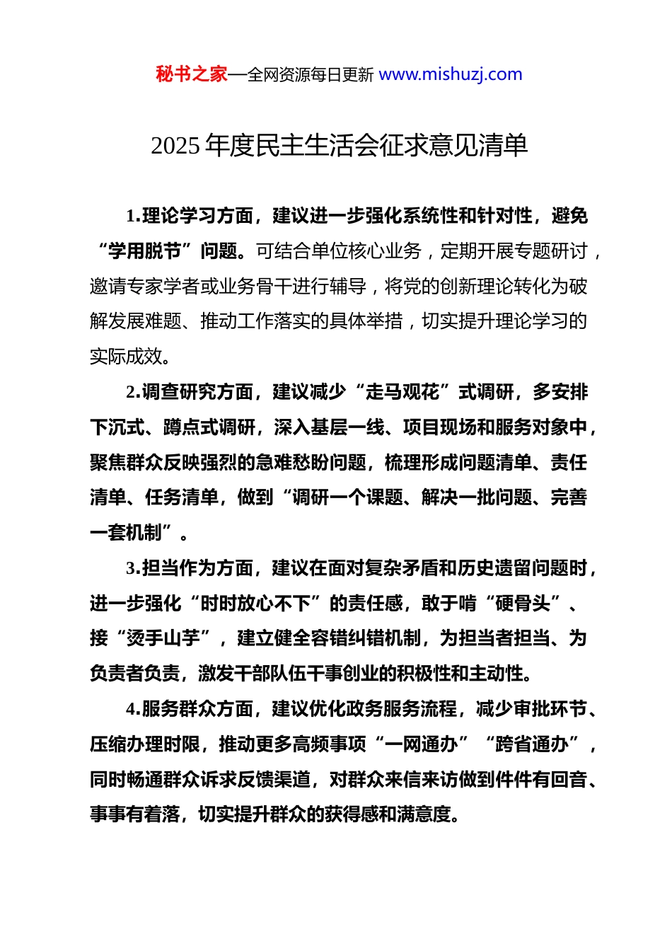 秘书之家—全网资源每日更新 www.mishuzj.com2025 年度民主生活会征求意见清单 1.理论学习方面,建议进一步强化系统性和针对性,避免“学用脱节”问题。可结合单位核心业务,定期开展专题研讨,邀请专家学者或业务骨干进行辅导,将党的创新理论转化为破解发展难题、推动工作落实的具体举措,切实提升理论学习的实际成效。2.调查研究方面,建议减少“走马观花”式调研,多安排下沉式、蹲点式调研,深入基层一线、项目现场和服务对象中,聚焦群众反映强烈的急难愁盼问题,梳理形成问题清单、责任清单、任务清单,做到“调研一个课题、解决一批问题、完善一套机制”。3.担当作为方面,建议在面对复杂矛盾和历史遗留问题时,进一步强化“时时放心不下”的责任感,敢于啃“硬骨头”、接“烫手山芋”,建立健全容错纠错机制,为担当者担当、为负责者负责,激发干部队伍干事创业的积极性和主动性。4.服务群众方面,建议优化政务服务流程,减少审批环节、压缩办理时限,推动更多高频事项“一网通办”“跨省通办”,同时畅通群众诉求反馈渠道,对群众来信来访做到件件有回音、事事有着落,切实提升群众的获得感和满意度。秘书之家—全网资源每日更新 www.mishuzj.com5.班子团结方面,建议进一步健全班子议事决策机制,坚持民主集中制,在重大事项决策前充分听取班子成员意见,决策后齐心协力抓好落实,同时加强班子成员之间的日常沟通交流,做到分工不分家、补台不拆台,形成攻坚克难的强大合力。6.工作作风方面,建议持续整治形式主义、官僚主义,严控会议文件数量,避免“文山会海”反弹回潮,减少不必要的督查检查考核,让基层干部有更多时间和精力抓落实,同时树立重实干、重实绩的鲜明导向,以工作成效检验作风建设成果。7.廉洁自律方面,建议常态化开展警示教育,通过观看警示教育片、参观廉政教育基地、剖析典型案例等方式,引导党员干部知敬畏、存戒惧、守底线,同时加强对重点领域、关键岗位的监督管理,扎紧制度笼子,从源头上防范廉政风险。8.创新发展方面,建议进一步解放思想、开拓创新,打破传统思维定式,围绕单位中心工作和发展瓶颈,积极探索新思路、新方法、新举措,鼓励干部职工大胆尝试、勇于突破,推动各项工作提质增效、争创一流。9.干部培养方面,建议建立健全干部梯队建设机制,针对不同年龄段、不同岗位干部的特点,制定个性化培养方案,通过轮岗交流、挂职锻炼、专题培训等方式,提升干部的综合能力素质,为单位长远发展储备人才力量。秘书之家—全网资源每日更新 www.mishuzj.com10.意识形态工作方面,建议强化阵地建设和管理,定期分析研判意识形态领域形势,加强对微信公众号、门户网站等新媒体平台的监管,及时回应社会关切,弘扬主旋律、传播正能量,牢牢掌握意识形态工作领导权。11.基层党建方面,建议持续深化党支部标准化规范化建设创新“三会一课”、主题党日等活动形式,增强组织生活的吸引力和实效性,同时加强对基层党支部的指导帮扶,推动党建工作与业务工作深度融合,以高质量党建引领高质量发展。12.整改落实方面,建议建立问题整改长效机制,对历次民主生活会、巡视巡察反馈的问题,定期开展“回头看”,防止问题反弹回潮,同时将整改情况纳入干部考核评价体系,确保整改工作取得实实在在的效果。13.担当精神方面,建议在面对上级部署的急难险重任务时,主动认领、靠前指挥,带领干部职工攻坚克难,同时加强对基层工作的指导和支持,帮助基层解决实际困难,提升基层干部的履职能力。14.勤俭节约方面,建议严格执行中央八项规定及其实施细则精神,严控“三公”经费支出,倡导绿色办公、低碳出行,杜绝铺张浪费现象,营造勤俭节约的良好风气。15.联系群众方面,建议落实领导干部包联制度,定期深入秘书之家—全网资源每日更新 www.mishuzj.com基层联系点,与群众面对面交流,倾听群众呼声,了解群众需求,帮助群众解决生产生活中遇到的实际问题,密切党群干群关系。16.决策部署落实方面,建议建立健全跟踪问效机制,对上级决策部署和单位重点工作,明确责任分工、时间节点和目标要求,定期督查督办,确保各项工作落到实处、取得实效。17.专业...