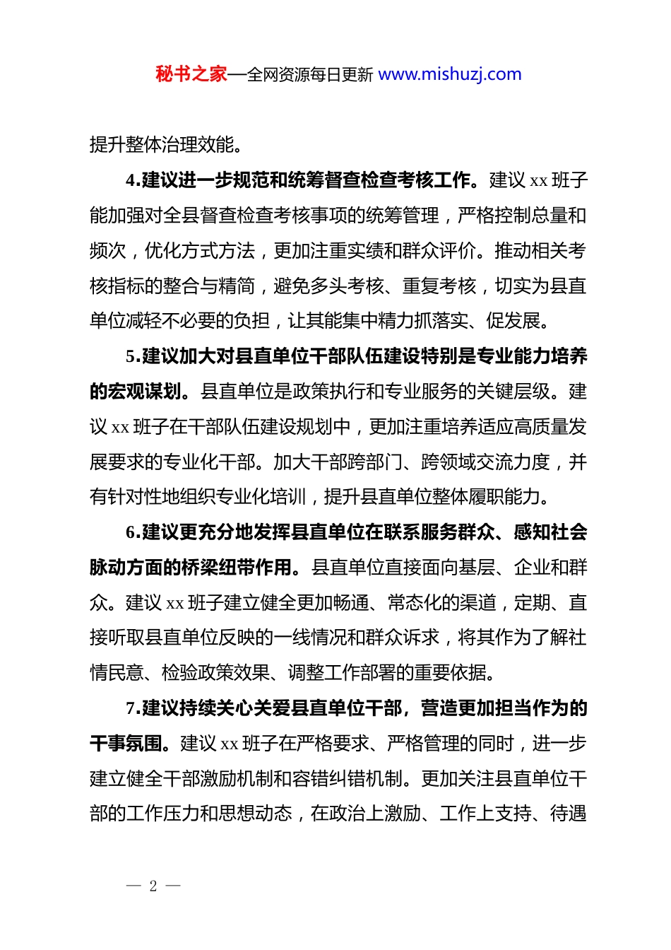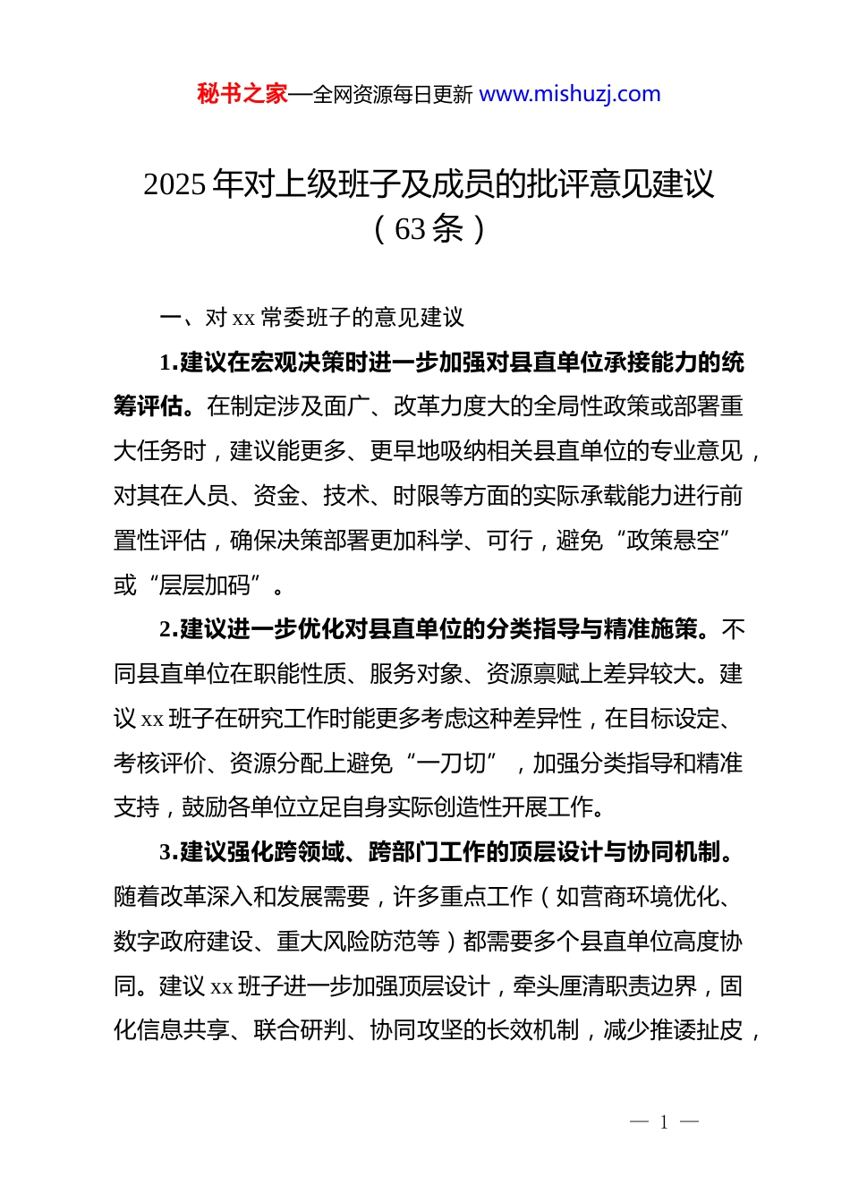秘书之家—全网资源每日更新 www.mishuzj.com2025 年对上级班子及成员的批评意见建议(63 条)一、对 xx 常委班子的意见建议1.建议在宏观决策时进一步加强对县直单位承接能力的统筹评估。在制定涉及面广、改革力度大的全局性政策或部署重大任务时,建议能更多、更早地吸纳相关县直单位的专业意见,对其在人员、资金、技术、时限等方面的实际承载能力进行前置性评估,确保决策部署更加科学、可行,避免“政策悬空”或“层层加码”。2.建议进一步优化对县直单位的分类指导与精准施策。不同县直单位在职能性质、服务对象、资源禀赋上差异较大。建议 xx 班子在研究工作时能更多考虑这种差异性,在目标设定、考核评价、资源分配上避免“一刀切”,加强分类指导和精准支持,鼓励各单位立足自身实际创造性开展工作。3.建议强化跨领域、跨部门工作的顶层设计与协同机制。随着改革深入和发展需要,许多重点工作(如营商环境优化、数字政府建设、重大风险防范等)都需要多个县直单位高度协同。建议 xx 班子进一步加强顶层设计,牵头厘清职责边界,固化信息共享、联合研判、协同攻坚的长效机制,减少推诿扯皮,— 1 —秘书之家—全网资源每日更新 www.mishuzj.com提升整体治理效能。4.建议进一步规范和统筹督查检查考核工作。建议 xx 班子能加强对全县督查检查考核事项的统筹管理,严格控制总量和频次,优化方式方法,更加注重实绩和群众评价。推动相关考核指标的整合与精简,避免多头考核、重复考核,切实为县直单位减轻不必要的负担,让其能集中精力抓落实、促发展。5.建议加大对县直单位干部队伍建设特别是专业能力培养的宏观谋划。县直单位是政策执行和专业服务的关键层级。建议 xx 班子在干部队伍建设规划中,更加注重培养适应高质量发展要求的专业化干部。加大干部跨部门、跨领域交流力度,并有针对性地组织专业化培训,提升县直单位整体履职能力。6.建议更充分地发挥县直单位在联系服务群众、感知社会脉动方面的桥梁纽带作用。县直单位直接面向基层、企业和群众。建议 xx 班子建立健全更加畅通、常态化的渠道,定期、直接听取县直单位反映的一线情况和群众诉求,将其作为了解社情民意、检验政策效果、调整工作部署的重要依据。7.建议持续关心关爱县直单位干部,营造更加担当作为的干事氛围。建议 xx 班子在严格要求、严格管理的同时,进一步建立健全干部激励机制和容错纠错机制。更加关注县直单位干部的工作压力和思想动态,在政治上激励、工作上支持、待遇— 2 —秘书之家—全网资源每日更新 www.mishuzj.com上保障、心理上关怀,旗帜鲜明地为敢于担当、踏实做事的干部撑腰鼓劲,激发整个队伍的积极性、主动性和创造性。二、对班子成员的意见建议(一)对 xx 书记 xx 同志的意见建议1.在决策部署落实过程中,建议能更多考虑县直各单位业务工作的周推动 xx 重大期性和承接能力,在时间安排和任务分解上给予更科学合理的统筹。2.建议进一步优化会议活动统筹机制,尽可能精减合并涉及县直单位主要负责同志参加的会议,为其深入一线抓落实留出更多时间和精力。3.在开展调查研究时,建议能适当增加对部分业务性强、专业要求高的县直单位的专题调研深度,更全面地掌握相关领域发展的实际情况和瓶颈问题。4.建议在干部选拔任用工作中,能更充分地听取相关业务主管部门的意见,特别是对专业性较强的县直单位领导班子配备,进一步突出人岗相适。5.在督促检查工作中,建议能更多采用“四不两直”方式了解县直单位真实工作情况,减少层层陪同带来的负担,同时更直接地发现问题、指导工作。6.建议能更经常性地与县直单位主要负责同志开展谈心谈— 3 —秘书之家—全网资源每日更新 www.mishuzj.com话,不仅谈工作,也适当关心干部的思想动态和实际困难,加强思想引导和压力疏导。7.在谋划全县长远发展战略时,建议能更广泛地吸纳相关领域县直单位的专业建议,使决策更富前瞻性和科学性。(二)对 xx 副书记、县长 xx 同志的意见建议1.建议在部署政府系统重点任务时,进一步加强对任务所需配套政策、资金、人员等要素保障的统筹协调力度,为县直单位推进落实创...