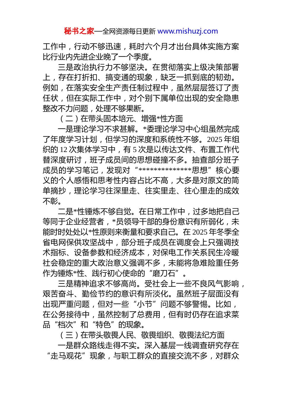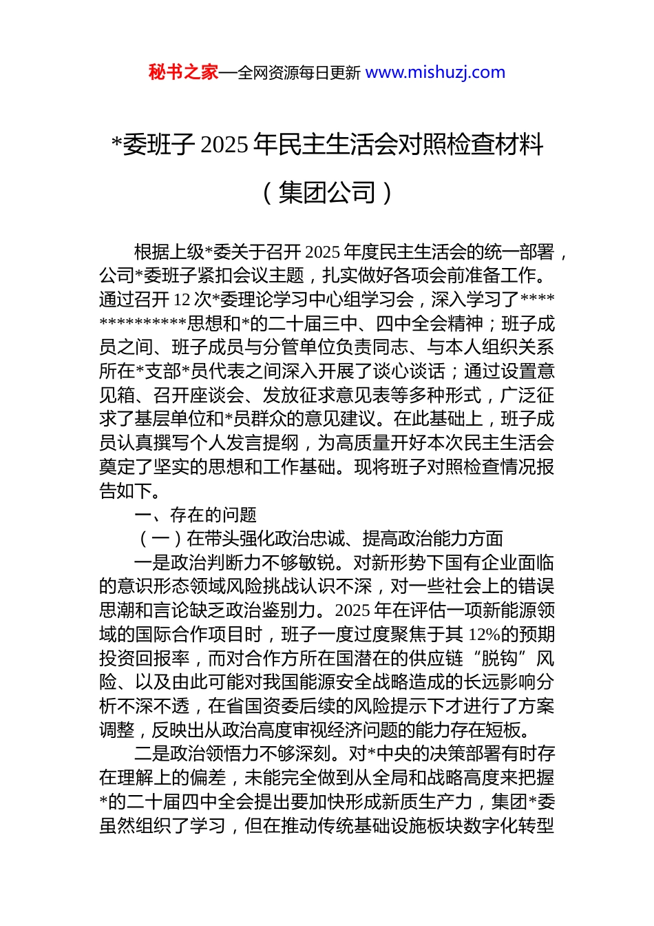 秘书之家—全网资源每日更新 www.mishuzj.com*委班子 2025 年民主生活会对照检查材料(集团公司)根据上级*委关于召开 2025 年度民主生活会的统一部署,公司*委班子紧扣会议主题,扎实做好各项会前准备工作。通过召开 12 次*委理论学习中心组学习会,深入学习了**************思想和*的二十届三中、四中全会精神;班子成员之间、班子成员与分管单位负责同志、与本人组织关系所在*支部*员代表之间深入开展了谈心谈话;通过设置意见箱、召开座谈会、发放征求意见表等多种形式,广泛征求了基层单位和*员群众的意见建议。在此基础上,班子成员认真撰写个人发言提纲,为高质量开好本次民主生活会奠定了坚实的思想和工作基础。现将班子对照检查情况报告如下。一、存在的问题(一)在带头强化政治忠诚、提高政治能力方面一是政治判断力不够敏锐。对新形势下国有企业面临的意识形态领域风险挑战认识不深,对一些社会上的错误思潮和言论缺乏政治鉴别力。2025 年在评估一项新能源领域的国际合作项目时,班子一度过度聚焦于其 12%的预期投资回报率,而对合作方所在国潜在的供应链“脱钩”风险、以及由此可能对我国能源安全战略造成的长远影响分析不深不透,在省国资委后续的风险提示下才进行了方案调整,反映出从政治高度审视经济问题的能力存在短板。二是政治领悟力不够深刻。对*中央的决策部署有时存在理解上的偏差,未能完全做到从全局和战略高度来把握*的二十届四中全会提出要加快形成新质生产力,集团*委虽然组织了学习,但在推动传统基础设施板块数字化转型秘书之家—全网资源每日更新 www.mishuzj.com工作中,行动不够迅速,耗时六个月才出台具体实施方案比行业内先进企业晚了一个季度。三是政治执行力不够坚决。在贯彻落实上级决策部署上,存在打折扣、搞变通的现象,缺乏一抓到底的韧劲。例如,在落实安全生产责任制过程中,虽然层层签订了责任状,但在实际工作中,对个别下属单位出现的安全隐患整改不力问题,处理不够果断。(二)在带头固本培元、增强*性方面一是理论学习不求甚解。*委理论学习中心组虽然完成了年度学习计划,但学习的深度和系统性不够。2025 年组织的 12 次集体学习中,有 5 次是以传达文件、布置工作代替深度研讨,班子成员间的思想碰撞不多。抽查部分班子成员的学习笔记,发现对“**************思想”核心要义的个人感悟和思考性内容占比不高,大多是对原文的简单摘抄,理论学习往深里走、往实里走、往心里走的成效不彰。二是*性锤炼不够自觉。在日常工作中,过多地把自己等同于企业经营者,*员领导干部的身份意识有所弱化,未能时时处处以*性原则来衡量和要求自己。在 2025 年冬季全省电网保供攻坚战中,部分班子成员在调度会上只强调技术指标、设备参数和经济成本,对保电工作关系民生冷暖社会稳定的重大政治意义强调不多,未能将急难险重任务作为锤炼*性、践行初心使命的“磨刀石”。三是精神追求不够高尚。受社会上一些不良风气影响,艰苦奋斗、勤俭节约的意识有所淡化。虽然班子层面没有出现严重问题,但对一些“小节”问题不够警惕。比如,在公务接待中,虽然控制了总费用,但有时仍存在追求菜品“档次”和“特色”的现象。(三)在带头敬畏人民、敬畏组织、敬畏法纪方面一是群众路线走得不实。深入基层一线调查研究存在“走马观花”现象,与职工群众的直接交流不多,对群众秘书之家—全网资源每日更新 www.mishuzj.com的急难愁盼问题了解不够深入。在规划 xx 市一条新的高压输电线路走向时,设计团队提出的方案虽然技术最优、成本最低,却因未充分征求沿线居民意见,忽视了对一处有百年历史的村落宗祠的影响,引发群众不满,导致项目启动延迟了两个月,造成了不必要的工作被动。二是民主集中制执行不严。在“三重一大”决策过程中,有时准备不充分,酝酿讨论不深入,“一把手”末位表态制落实不严格。在 2025 年 5 月一次讨论一项总额达 20亿元的工程总包合同的*委会上,主要负责同志发言占用了会议近一半时间,对合同中存在的风险点,有两位班子成员提出了不同看法,但未能展开充分辩论,最终决议显得仓促,民主决策的质量不...