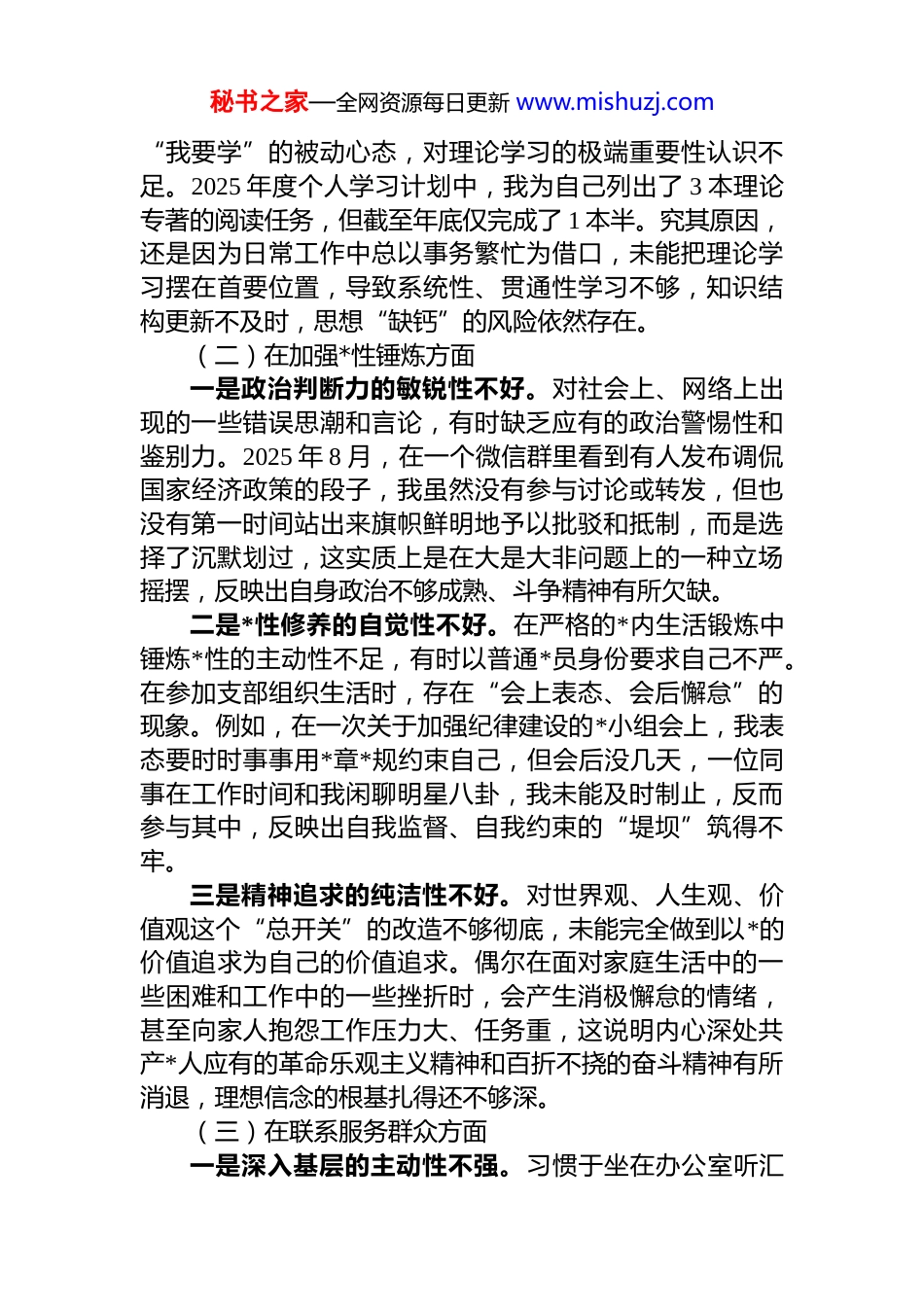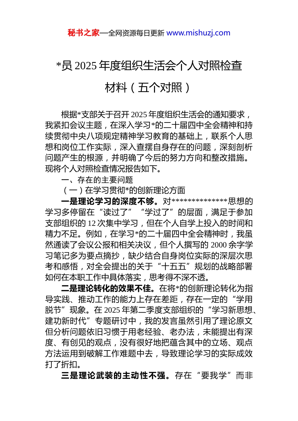 秘书之家—全网资源每日更新 www.mishuzj.com*员 2025 年度组织生活会个人对照检查材料(五个对照)根据*支部关于召开 2025 年度组织生活会的通知要求,我紧扣会议主题,在深入学习*的二十届四中全会精神和持续贯彻中央八项规定精神学习教育的基础上,联系个人思想和岗位工作实际,深入查摆自身存在的问题,深刻剖析问题产生的根源,并明确了今后的努力方向和整改措施。现将个人对照检查情况报告如下。一、存在的主要问题(一)在学习贯彻*的创新理论方面一是理论学习的深度不够。对**************思想的学习多停留在“读过了”“学过了”的层面,满足于参加支部组织的 12 次集中学习,但在个人自学上投入的时间和精力不足。例如,在学习*的二十届四中全会精神时,我虽然通读了会议公报和相关决议,但个人撰写的 2000 余字学习笔记多为要点摘抄,缺少结合自身岗位实际的深层次思考和感悟,对全会提出的关于“十五五”规划的战略部署如何在本职工作中具体落实,思考得不深不透。二是理论转化的效果不佳。在将*的创新理论转化为指导实践、推动工作的能力上存在差距,存在一定的“学用脱节”现象。在 2025 年第二季度支部组织的“学习新思想、建功新时代”专题研讨中,我的发言虽然引用了理论原文但分析问题依旧习惯于用老经验、老办法,未能提出有深度、有创见的观点,没有很好地把蕴含其中的立场、观点方法运用到破解工作难题中去,导致理论学习的实际成效打了折扣。三是理论武装的主动性不强。存在“要我学”而非秘书之家—全网资源每日更新 www.mishuzj.com“我要学”的被动心态,对理论学习的极端重要性认识不足。2025 年度个人学习计划中,我为自己列出了 3 本理论专著的阅读任务,但截至年底仅完成了 1 本半。究其原因,还是因为日常工作中总以事务繁忙为借口,未能把理论学习摆在首要位置,导致系统性、贯通性学习不够,知识结构更新不及时,思想“缺钙”的风险依然存在。(二)在加强*性锤炼方面一是政治判断力的敏锐性不好。对社会上、网络上出现的一些错误思潮和言论,有时缺乏应有的政治警惕性和鉴别力。2025 年 8 月,在一个微信群里看到有人发布调侃国家经济政策的段子,我虽然没有参与讨论或转发,但也没有第一时间站出来旗帜鲜明地予以批驳和抵制,而是选择了沉默划过,这实质上是在大是大非问题上的一种立场摇摆,反映出自身政治不够成熟、斗争精神有所欠缺。二是*性修养的自觉性不好。在严格的*内生活锻炼中锤炼*性的主动性不足,有时以普通*员身份要求自己不严。在参加支部组织生活时,存在“会上表态、会后懈怠”的现象。例如,在一次关于加强纪律建设的*小组会上,我表态要时时事事用*章*规约束自己,但会后没几天,一位同事在工作时间和我闲聊明星八卦,我未能及时制止,反而参与其中,反映出自我监督、自我约束的“堤坝”筑得不牢。三是精神追求的纯洁性不好。对世界观、人生观、价值观这个“总开关”的改造不够彻底,未能完全做到以*的价值追求为自己的价值追求。偶尔在面对家庭生活中的一些困难和工作中的一些挫折时,会产生消极懈怠的情绪,甚至向家人抱怨工作压力大、任务重,这说明内心深处共产*人应有的革命乐观主义精神和百折不挠的奋斗精神有所消退,理想信念的根基扎得还不够深。(三)在联系服务群众方面一是深入基层的主动性不强。习惯于坐在办公室听汇秘书之家—全网资源每日更新 www.mishuzj.com报、看材料,主动深入一线、深入群众开展调查研究不够尽管支部 2025 年组织了 4 次赴 xx 社区的志愿服务活动,我每次都准时参加,但在活动过程中,多是完成清扫街道、分发传单等“规定动作”,与群众的交流多是停留在“您吃饭了吗”“身体还好吗”等浅层问候,没有真正坐下来静下心来倾听他们的烦心事、揪心事,服务群众更像是在完成一项任务。二是解决诉求的彻底性不强。对待群众反映的问题,有时满足于“交办了”“批转了”,缺乏一竿子插到底的跟踪问效精神。2025 年 10 月,我通过走访了解到 xx 小区居民王大爷反映的医保报销流程繁琐问题,随即将问题转交给了相关职能部门的*员同志,但此后便没有再主动过问和跟...