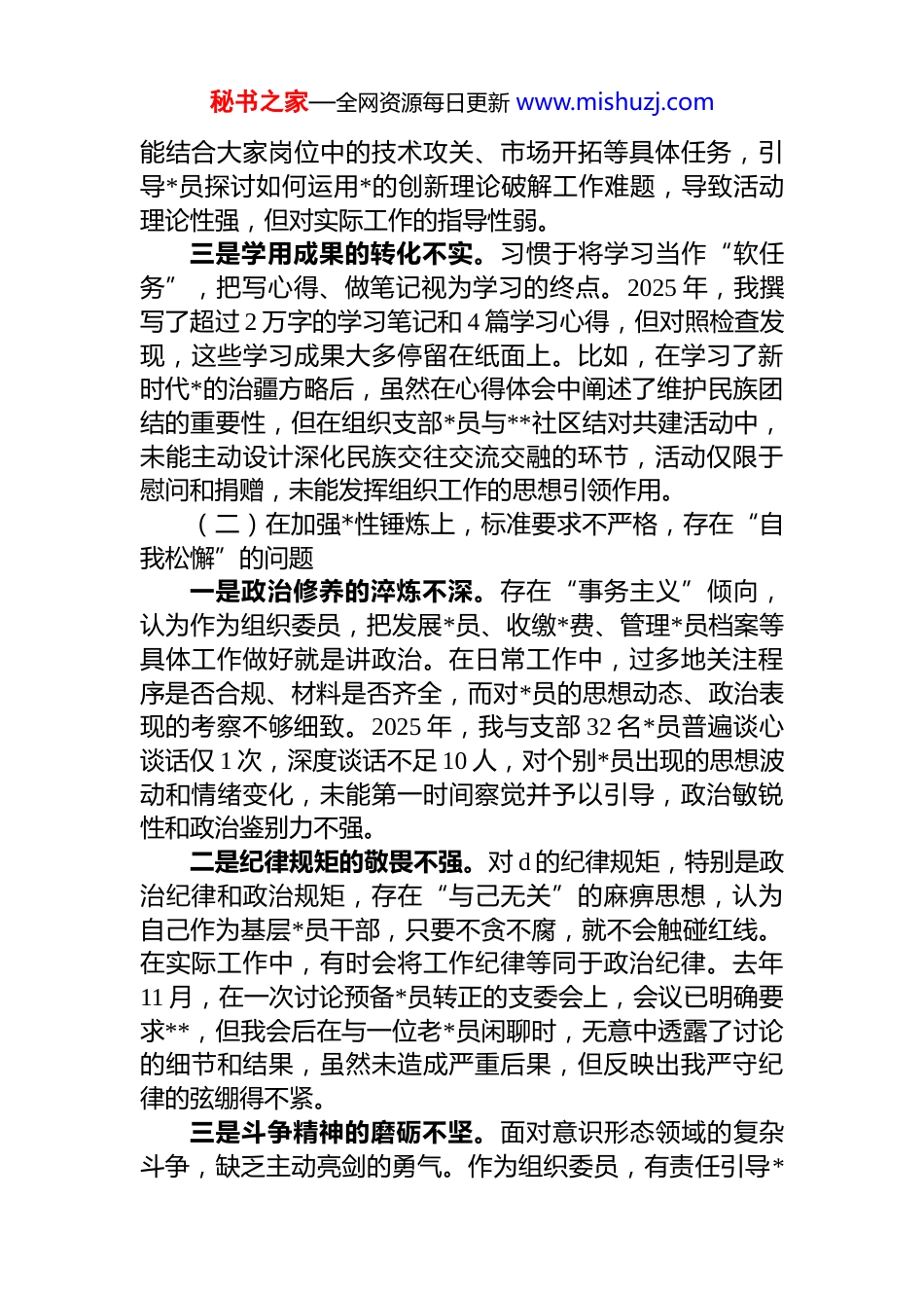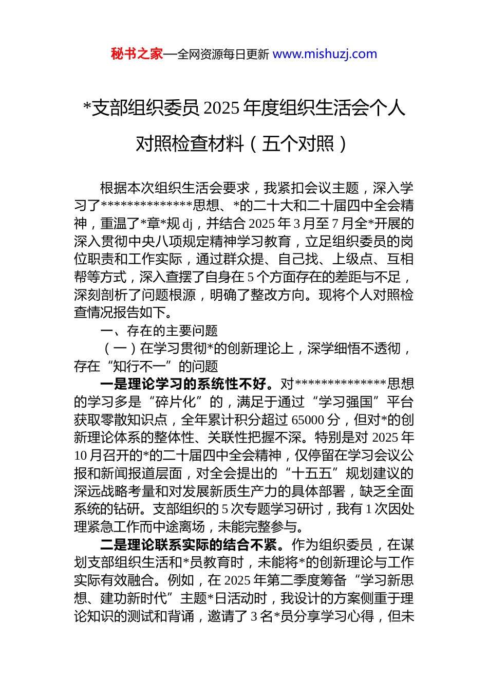 秘书之家—全网资源每日更新 www.mishuzj.com*支部组织委员 2025 年度组织生活会个人对照检查材料(五个对照)根据本次组织生活会要求,我紧扣会议主题,深入学习了**************思想、*的二十大和二十届四中全会精神,重温了*章*规 dj,并结合 2025 年 3 月至 7 月全*开展的深入贯彻中央八项规定精神学习教育,立足组织委员的岗位职责和工作实际,通过群众提、自己找、上级点、互相帮等方式,深入查摆了自身在 5 个方面存在的差距与不足,深刻剖析了问题根源,明确了整改方向。现将个人对照检查情况报告如下。一、存在的主要问题(一)在学习贯彻*的创新理论上,深学细悟不透彻,存在“知行不一”的问题一是理论学习的系统性不好。对**************思想的学习多是“碎片化”的,满足于通过“学习强国”平台获取零散知识点,全年累计积分超过 65000 分,但对*的创新理论体系的整体性、关联性把握不深。特别是对 2025 年10 月召开的*的二十届四中全会精神,仅停留在学习会议公报和新闻报道层面,对全会提出的“十五五”规划建议的深远战略考量和对发展新质生产力的具体部署,缺乏全面系统的钻研。支部组织的 5 次专题学习研讨,我有 1 次因处理紧急工作而中途离场,未能完整参与。二是理论联系实际的结合不紧。作为组织委员,在谋划支部组织生活和*员教育时,未能将*的创新理论与工作实际有效融合。例如,在 2025 年第二季度筹备“学习新思想、建功新时代”主题*日活动时,我设计的方案侧重于理论知识的测试和背诵,邀请了 3 名*员分享学习心得,但未秘书之家—全网资源每日更新 www.mishuzj.com能结合大家岗位中的技术攻关、市场开拓等具体任务,引导*员探讨如何运用*的创新理论破解工作难题,导致活动理论性强,但对实际工作的指导性弱。三是学用成果的转化不实。习惯于将学习当作“软任务”,把写心得、做笔记视为学习的终点。2025 年,我撰写了超过 2 万字的学习笔记和 4 篇学习心得,但对照检查发现,这些学习成果大多停留在纸面上。比如,在学习了新时代*的治疆方略后,虽然在心得体会中阐述了维护民族团结的重要性,但在组织支部*员与**社区结对共建活动中,未能主动设计深化民族交往交流交融的环节,活动仅限于慰问和捐赠,未能发挥组织工作的思想引领作用。(二)在加强*性锤炼上,标准要求不严格,存在“自我松懈”的问题一是政治修养的淬炼不深。存在“事务主义”倾向,认为作为组织委员,把发展*员、收缴*费、管理*员档案等具体工作做好就是讲政治。在日常工作中,过多地关注程序是否合规、材料是否齐全,而对*员的思想动态、政治表现的考察不够细致。2025 年,我与支部 32 名*员普遍谈心谈话仅 1 次,深度谈话不足 10 人,对个别*员出现的思想波动和情绪变化,未能第一时间察觉并予以引导,政治敏锐性和政治鉴别力不强。二是纪律规矩的敬畏不强。对 d 的纪律规矩,特别是政治纪律和政治规矩,存在“与己无关”的麻痹思想,认为自己作为基层*员干部,只要不贪不腐,就不会触碰红线。在实际工作中,有时会将工作纪律等同于政治纪律。去年11 月,在一次讨论预备*员转正的支委会上,会议已明确要求**,但我会后在与一位老*员闲聊时,无意中透露了讨论的细节和结果,虽然未造成严重后果,但反映出我严守纪律的弦绷得不紧。三是斗争精神的磨砺不坚。面对意识形态领域的复杂斗争,缺乏主动亮剑的勇气。作为组织委员,有责任引导*秘书之家—全网资源每日更新 www.mishuzj.com员坚定立场,但在面对网络上一些抹黑*的历史、质疑*的政策的错误言论时,我多数时候选择“一划而过”或“不看不听”,而不是理直气壮地予以批驳和澄清。2025 年全年,我仅在工作群中转发过 3 次正面宣传链接,主动撰写评论、引导舆论的次数为零,在维护*的形象和威信上,先锋模范作用发挥不彻底。(三)在联系服务职工群众上,宗旨意识不牢固,存在“高高在上”的问题一是深入基层的脚步不勤。习惯于坐在办公室通过电话、微信群了解情况、安排工作,与职工群众面对面交流少。2025 年,我平均每周下到基层一线的时间不超过 2 小时,且多是带着检查任务...