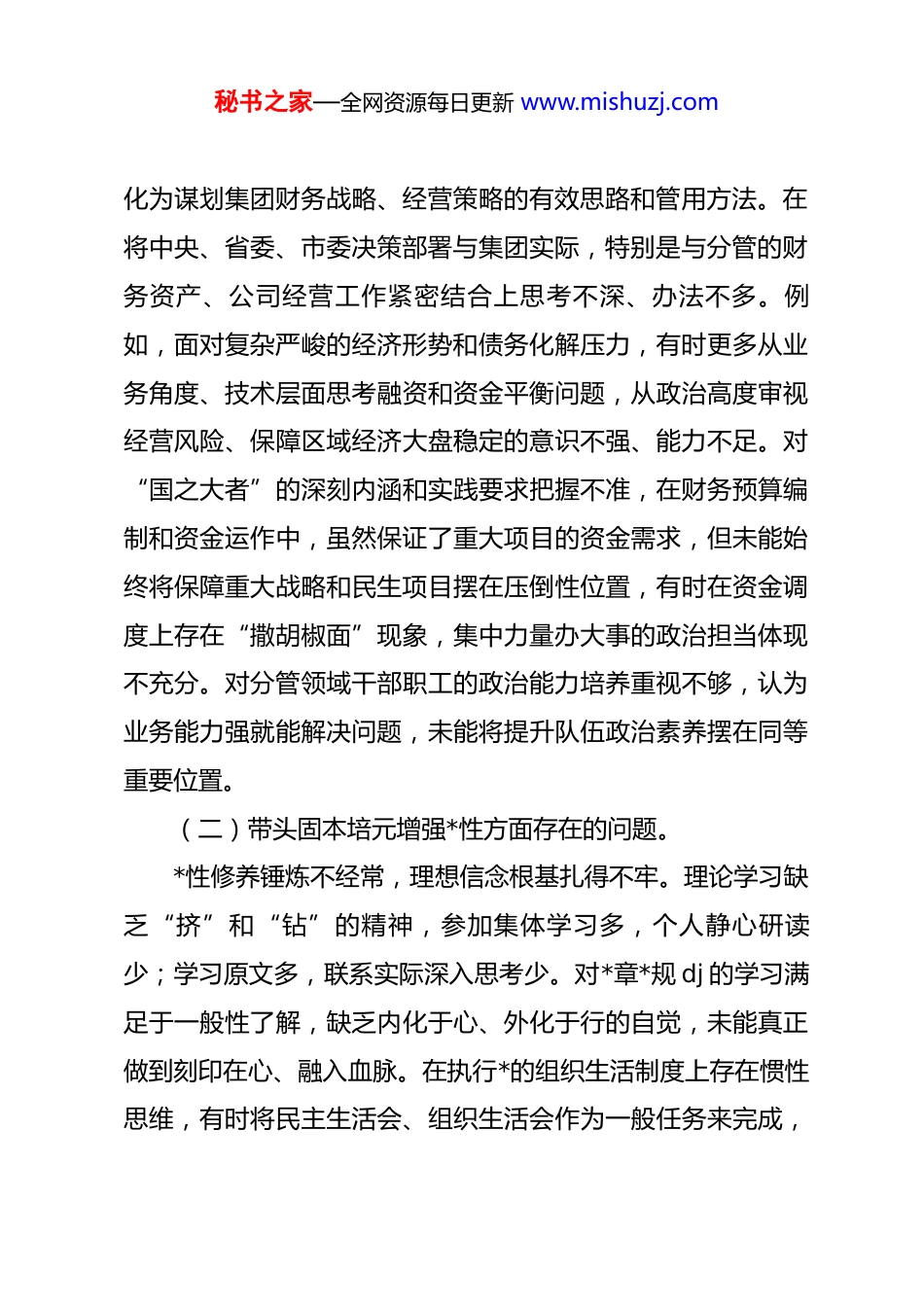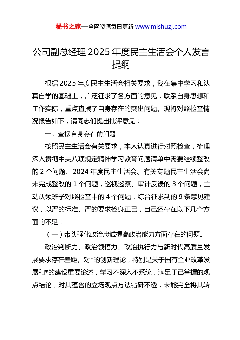 秘书之家—全网资源每日更新 www.mishuzj.com公司副总经理 2025 年度民主生活会个人发言提纲根据 2025 年度民主生活会相关要求,我在集中学习和认真自学的基础上,广泛征求了各方面的意见,联系自身思想和工作实际,重点查摆了自身存在的突出问题。现将对照检查情况报告如下,请同志们提出批评意见:一、查摆自身存在的问题按照民主生活会有关要求,本人认真进行对照检查,梳理深入贯彻中央八项规定精神学习教育问题清单中需要继续整改的 2 个问题、2024 年度民主生活会、有关专题民主生活会尚未完成整改的 1 个问题,巡视巡察、审计反馈的 3 个问题,主动认领班子对照检查中的 4 个问题,综合征求到的 9 条意见建议,以严的标准、严的要求检身正己,自己还存在以下几个方面的不足:(一)带头强化政治忠诚提高政治能力方面存在的问题。政治判断力、政治领悟力、政治执行力与新时代高质量发展要求存在差距。对*的创新理论,特别是关于国有企业改革发展和*的建设重要论述,学习不深入不系统,满足于已掌握的观点结论,对其蕴含的立场观点方法钻研不透,未能完全将其转秘书之家—全网资源每日更新 www.mishuzj.com化为谋划集团财务战略、经营策略的有效思路和管用方法。在将中央、省委、市委决策部署与集团实际,特别是与分管的财务资产、公司经营工作紧密结合上思考不深、办法不多。例如,面对复杂严峻的经济形势和债务化解压力,有时更多从业务角度、技术层面思考融资和资金平衡问题,从政治高度审视经营风险、保障区域经济大盘稳定的意识不强、能力不足。对“国之大者”的深刻内涵和实践要求把握不准,在财务预算编制和资金运作中,虽然保证了重大项目的资金需求,但未能始终将保障重大战略和民生项目摆在压倒性位置,有时在资金调度上存在“撒胡椒面”现象,集中力量办大事的政治担当体现不充分。对分管领域干部职工的政治能力培养重视不够,认为业务能力强就能解决问题,未能将提升队伍政治素养摆在同等重要位置。(二)带头固本培元增强*性方面存在的问题。*性修养锤炼不经常,理想信念根基扎得不牢。理论学习缺乏“挤”和“钻”的精神,参加集体学习多,个人静心研读少;学习原文多,联系实际深入思考少。对*章*规 dj 的学习满足于一般性了解,缺乏内化于心、外化于行的自觉,未能真正做到刻印在心、融入血脉。在执行*的组织生活制度上存在惯性思维,有时将民主生活会、组织生活会作为一般任务来完成,秘书之家—全网资源每日更新 www.mishuzj.com批评与自我批评的武器运用不好,辣味不足,“红脸出汗”效果打折扣。艰苦奋斗、勤俭节约的意识有所淡化,认为集团规模大了、条件好了,在公务接待、会议活动等方面虽然守住了底线,但未能做到锱铢必较、精打细算,厉行节约反对浪费的弦绷得不紧。深入基层一线调研解决实际问题的次数不多,存在“被安排”调研现象,主动带着问题“沉下去”了解分管部门、子公司真实经营状况和员工思想动态不够,与普通*员、职工群众谈心交流不深入,宗旨意识践行不彻底。(三)带头敬畏人民敬畏组织敬畏法纪方面存在的问题。纪律规矩意识虽强但执行存在温差,对权力运行的监督制约抓得不紧。能够认识到敬畏之心的重要性,但在具体工作中,有时过于信任分管部门和下属公司的专业操守,认为他们熟悉业务、懂得规矩,放松了日常的严格管理和监督提醒。在带头遵守财务纪律方面,自身能做到清正廉洁,但对分管领域财务人员的日常廉洁教育和动态监管抓得不严不实,常态化开展财经纪律警示教育的形式单一、效果不佳,未能真正触及灵魂、筑牢防线。财务内控体系建设虽有框架,但部分审批流程仍显繁琐或存在模糊地带,对关键岗位、关键环节的廉政风险排查不深不细,防控措施不够精准有力。对审计、巡视巡察反馈的涉及财务管理、融资运作的问题,虽然组织进行了整改,秘书之家—全网资源每日更新 www.mishuzj.com但举一反三、建立长效机制不够,未能从根子上杜绝类似问题反复发生。例如,对于巡视指出的“债务融资和资金资产管理存在风险隐患”问题,整改多集中于完善制度文本,在穿透式监管、动态风险预警方面措施不硬。对组织忠诚老...