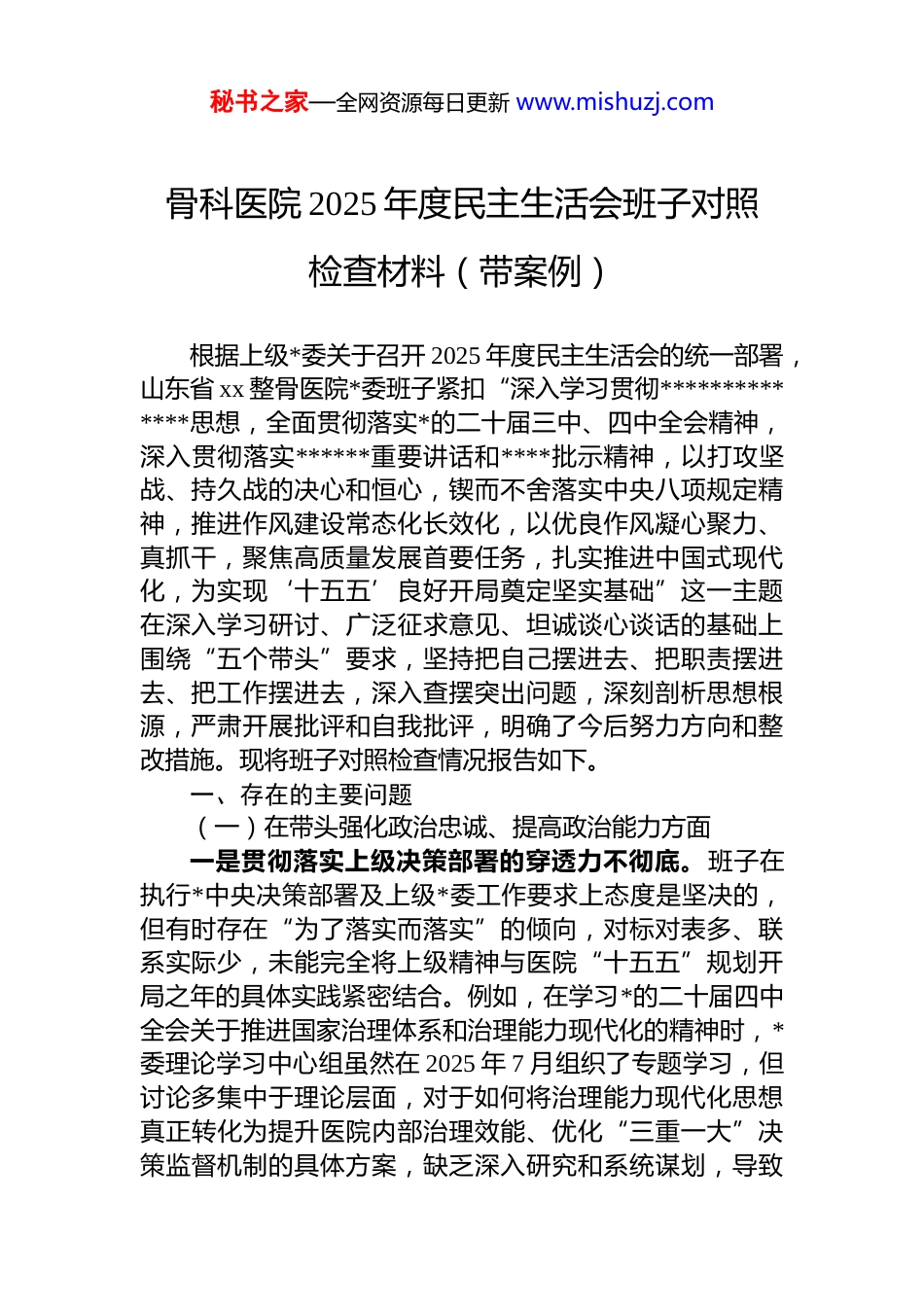 秘书之家—全网资源每日更新 www.mishuzj.com骨科医院 2025 年度民主生活会班子对照检查材料(带案例)根据上级*委关于召开 2025 年度民主生活会的统一部署,山东省 xx 整骨医院*委班子紧扣“深入学习贯彻**************思想,全面贯彻落实*的二十届三中、四中全会精神,深入贯彻落实******重要讲话和****批示精神,以打攻坚战、持久战的决心和恒心,锲而不舍落实中央八项规定精神,推进作风建设常态化长效化,以优良作风凝心聚力、真抓干,聚焦高质量发展首要任务,扎实推进中国式现代化,为实现‘十五五’良好开局奠定坚实基础”这一主题在深入学习研讨、广泛征求意见、坦诚谈心谈话的基础上围绕“五个带头”要求,坚持把自己摆进去、把职责摆进去、把工作摆进去,深入查摆突出问题,深刻剖析思想根源,严肃开展批评和自我批评,明确了今后努力方向和整改措施。现将班子对照检查情况报告如下。一、存在的主要问题(一)在带头强化政治忠诚、提高政治能力方面一是贯彻落实上级决策部署的穿透力不彻底。班子在执行*中央决策部署及上级*委工作要求上态度是坚决的,但有时存在“为了落实而落实”的倾向,对标对表多、联系实际少,未能完全将上级精神与医院“十五五”规划开局之年的具体实践紧密结合。例如,在学习*的二十届四中全会关于推进国家治理体系和治理能力现代化的精神时,*委理论学习中心组虽然在 2025 年 7 月组织了专题学习,但讨论多集中于理论层面,对于如何将治理能力现代化思想真正转化为提升医院内部治理效能、优化“三重一大”决策监督机制的具体方案,缺乏深入研究和系统谋划,导致秘书之家—全网资源每日更新 www.mishuzj.com相关制度的修订工作进度滞后于年度计划 3 个月。二是应对复杂局面、防范化解风险的敏锐性不强烈。对医疗行业发展面临的深层次矛盾和潜在风险,特别是医保支付方式改革、药品集中采购常态化带来的运营压力,认识不够深刻,前瞻性、系统性应对不足。2025 年上半年,面对国家新一轮药品集采政策,班子虽然迅速组织了应对但主要精力集中在如何调整药品目录和控制药占比上,对于政策背后所反映的推动公立医院高质量发展、倒逼成本精细化管理的战略意图,研判不深、行动不快。直到第三季度财务分析显示,因成本管控措施未能同步深化,医院运营成本环比上升 2.8%,才意识到原有应对策略的局限性。三是涵养政治定力、坚定发展信心的举措不扎实。面对医疗行业日趋激烈的竞争态势和持续的改革压力,班子成员有时会产生畏难情绪,对医院作为中医骨伤专科“国家队”的优势和潜力自信不足。在推进国家级中医骨伤诊疗中心建设的关键时期,对于一些需要先行先试的改革项目,如建立与国际接轨的临床研究数据管理平台,在 2025年 5 月的*委会上,部分班子成员因担心投入大、见效慢、易出错而犹豫不决,导致该项目论证周期长达半年,错失了与国内顶尖科研机构合作的最佳时机,影响了医院在“十五五”开局之年抢占科研高地的战略布局。(二)在带头固本培元、增强*性修养方面一是理论学习与思想改造的结合不紧密。在用**************思想凝心铸魂上,存在“学用脱节”现象。集体学习多,但真正触及灵魂、改造世界观的深刻反思少。在2025 年度开展的为期 5 个月的贯彻中央八项规定精神专题学习教育中,班子成员虽然都完成了规定篇目的学习和笔记撰写,但在交流研讨环节,多是复述理论观点,对照自身思想和分管领域工作实际,深刻检视是否存在享乐主义奢靡之风隐形变异问题的发言不深不透,未能真正做到红脸出汗、排毒治病。秘书之家—全网资源每日更新 www.mishuzj.com二是坚守共产*人精神追求的意志不坚定。在长期和平环境和相对优越的工作条件下,艰苦奋斗、勤俭节约的意识有所淡化。虽然医院层面三公经费持续压降,2025 年同比下降 4.5%,但“看不见的浪费”依然存在。例如,在推进院区信息化升级改造过程中,对于一些非核心业务系统仍倾向于采购价格昂贵的一线品牌,而对功能同样满足需求、性价比更高的国产品牌采纳意愿不强。据后勤部门统计,仅 2025 年采购的办公电脑、打印机等设备,如果选择国产品牌,预计可节约开支近 4...
