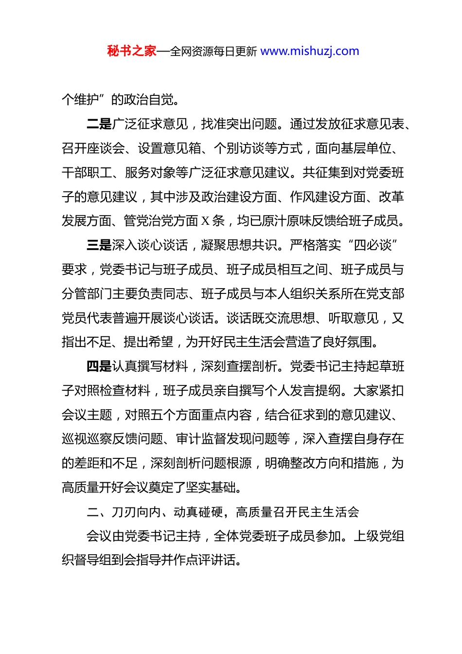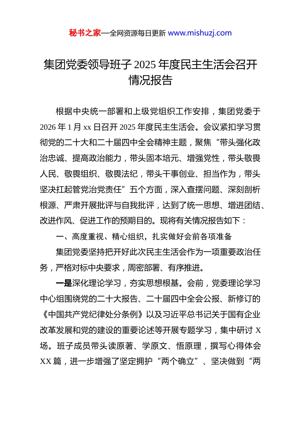 秘书之家—全网资源每日更新 www.mishuzj.com集团党委领导班子 2025 年度民主生活会召开情况报告 根据中央统一部署和上级党组织工作安排,集团党委于2026 年 1 月 xx 日召开 2025 年度民主生活会。会议紧扣学习贯彻党的二十大和二十届四中全会精神主题,聚焦“带头强化政治忠诚、提高政治能力,带头固本培元、增强党性,带头敬畏人民、敬畏组织、敬畏法纪,带头干事创业、担当作为,带头坚决扛起管党治党责任”五个方面,深入查摆问题、深刻剖析根源、严肃开展批评与自我批评,达到了统一思想、增进团结、改进作风、促进工作的预期目的。现将有关情况报告如下:一、高度重视、精心组织,扎实做好会前各项准备集团党委坚持把开好此次民主生活会作为一项重要政治任务,严格对标中央要求,周密部署、有序推进。一是深化理论学习,夯实思想根基。会前,党委理论学习中心组围绕党的二十大报告、二十届四中全会公报、新修订的《中国共产党纪律处分条例》以及习近平总书记关于国有企业改革发展和党的建设的重要论述等开展专题学习,集中研讨 X场。班子成员带头读原著、学原文、悟原理,撰写心得体会XX 篇,进一步增强了坚定拥护“两个确立”、坚决做到“两秘书之家—全网资源每日更新 www.mishuzj.com个维护”的政治自觉。二是广泛征求意见,找准突出问题。通过发放征求意见表、召开座谈会、设置意见箱、个别访谈等方式,面向基层单位、干部职工、服务对象等广泛征求意见建议。共征集到对党委班子的意见建议,其中涉及政治建设方面、作风建设方面、改革发展方面、管党治党方面 X 条,均已原汁原味反馈给班子成员。三是深入谈心谈话,凝聚思想共识。严格落实“四必谈”要求,党委书记与班子成员、班子成员相互之间、班子成员与分管部门主要负责同志、班子成员与本人组织关系所在党支部党员代表普遍开展谈心谈话。谈话既交流思想、听取意见,又指出不足、提出希望,为开好民主生活会营造了良好氛围。四是认真撰写材料,深刻查摆剖析。党委书记主持起草班子对照检查材料,班子成员亲自撰写个人发言提纲。大家紧扣会议主题,对照五个方面重点内容,结合征求到的意见建议、巡视巡察反馈问题、审计监督发现问题等,深入查摆自身存在的差距和不足,深刻剖析问题根源,明确整改方向和措施,为高质量开好会议奠定了坚实基础。二、刀刃向内、动真碰硬,高质量召开民主生活会会议由党委书记主持,全体党委班子成员参加。上级党组织督导组到会指导并作点评讲话。秘书之家—全网资源每日更新 www.mishuzj.com会上,首先通报了 2024 年度民主生活会整改措施落实情况和本次民主生活会征求意见情况。随后,党委书记代表党委班子作对照检查,重点从五个方面查摆了存在的突出问题:一是在强化政治忠诚、提高政治能力方面,政治判断力、政治领悟力、政治执行力有待进一步提升,对党中央关于国资国企改革的战略意图领会不够深透;二是在固本培元、增强党性方面,党内政治生活的政治性、时代性、原则性、战斗性有待加强,批评和自我批评“辣味”不足;三是在敬畏人民、敬畏组织、敬畏法纪方面,宗旨意识树得不够牢固,深入基层一线解决职工急难愁盼问题不够及时;四是在干事创业、担当作为方面,面对复杂严峻的市场环境,攻坚克难的锐气和韧劲有所减弱,推动企业高质量发展的思路举措不够精准;五是在扛起管党治党责任方面,压力传导存在层层递减现象,对重点领域廉洁风险防控不够到位。针对这些问题,班子从政治站位、思想认识、能力本领、作风纪律等方面深刻剖析了原因,并提出了下一步整改方向。随后,党委书记带头作个人对照检查,其他班子成员逐一进行。每位同志发言后,其他班子成员本着对组织、对同志、对事业高度负责的态度,实事求是、开诚布公地提出批评意见。大家自我批评不遮不掩、直面问题,相互批评出于公心、坦诚秘书之家—全网资源每日更新 www.mishuzj.com相见,既有红脸出汗的紧张严肃,又有加油鼓劲的团结和谐。整个过程,共提出批评意见 XX 条,达到了“团结—批评—团结”的目的。上级督导组在点评中指出,本次民主生活会准备充分、主题鲜明、程序规范、批评深刻,...