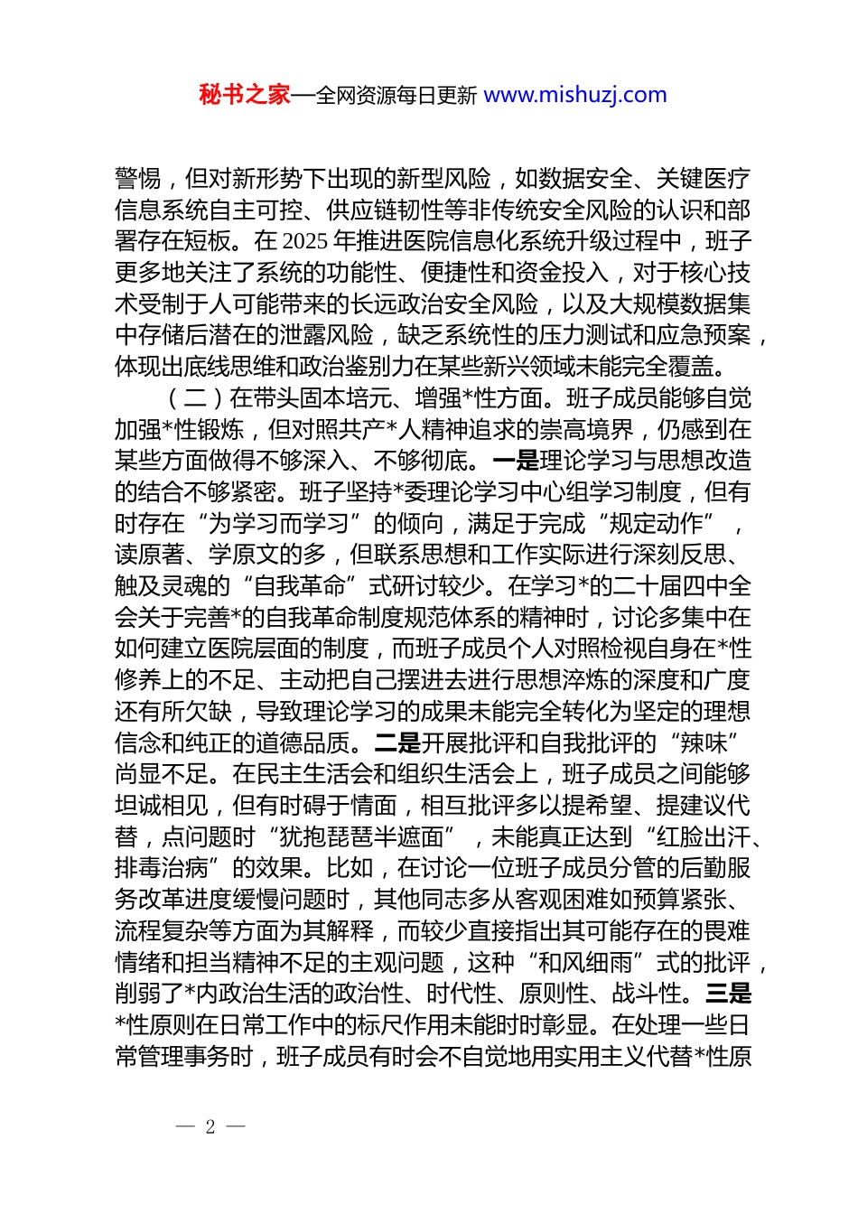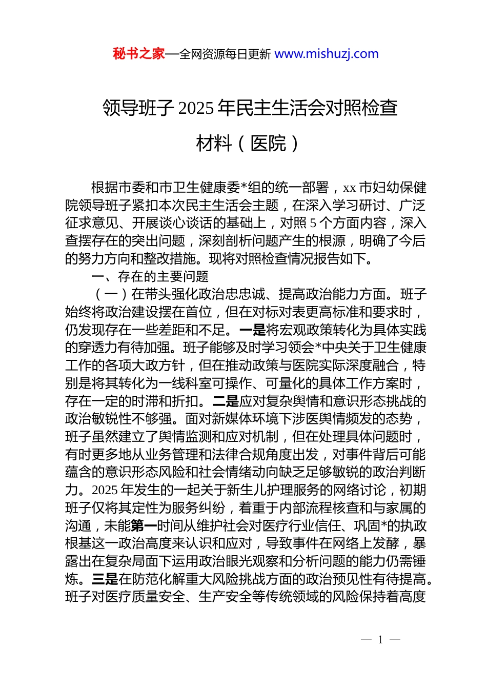 秘书之家—全网资源每日更新 www.mishuzj.com领导班子 2025 年民主生活会对照检查材料(医院)根据市委和市卫生健康委*组的统一部署,xx 市妇幼保健院领导班子紧扣本次民主生活会主题,在深入学习研讨、广泛征求意见、开展谈心谈话的基础上,对照 5 个方面内容,深入查摆存在的突出问题,深刻剖析问题产生的根源,明确了今后的努力方向和整改措施。现将对照检查情况报告如下。一、存在的主要问题(一)在带头强化政治忠忠诚、提高政治能力方面。班子始终将政治建设摆在首位,但在对标对表更高标准和要求时,仍发现存在一些差距和不足。一是将宏观政策转化为具体实践的穿透力有待加强。班子能够及时学习领会*中央关于卫生健康工作的各项大政方针,但在推动政策与医院实际深度融合,特别是将其转化为一线科室可操作、可量化的具体工作方案时,存在一定的时滞和折扣。二是应对复杂舆情和意识形态挑战的政治敏锐性不够强。面对新媒体环境下涉医舆情频发的态势,班子虽然建立了舆情监测和应对机制,但在处理具体问题时,有时更多地从业务管理和法律合规角度出发,对事件背后可能蕴含的意识形态风险和社会情绪动向缺乏足够敏锐的政治判断力。2025 年发生的一起关于新生儿护理服务的网络讨论,初期班子仅将其定性为服务纠纷,着重于内部流程核查和与家属的沟通,未能第一时间从维护社会对医疗行业信任、巩固*的执政根基这一政治高度来认识和应对,导致事件在网络上发酵,暴露出在复杂局面下运用政治眼光观察和分析问题的能力仍需锤炼。三是在防范化解重大风险挑战方面的政治预见性有待提高。班子对医疗质量安全、生产安全等传统领域的风险保持着高度— 1 —秘书之家—全网资源每日更新 www.mishuzj.com警惕,但对新形势下出现的新型风险,如数据安全、关键医疗信息系统自主可控、供应链韧性等非传统安全风险的认识和部署存在短板。在 2025 年推进医院信息化系统升级过程中,班子更多地关注了系统的功能性、便捷性和资金投入,对于核心技术受制于人可能带来的长远政治安全风险,以及大规模数据集中存储后潜在的泄露风险,缺乏系统性的压力测试和应急预案,体现出底线思维和政治鉴别力在某些新兴领域未能完全覆盖。(二)在带头固本培元、增强*性方面。班子成员能够自觉加强*性锻炼,但对照共产*人精神追求的崇高境界,仍感到在某些方面做得不够深入、不够彻底。一是理论学习与思想改造的结合不够紧密。班子坚持*委理论学习中心组学习制度,但有时存在“为学习而学习”的倾向,满足于完成“规定动作”,读原著、学原文的多,但联系思想和工作实际进行深刻反思、触及灵魂的“自我革命”式研讨较少。在学习*的二十届四中全会关于完善*的自我革命制度规范体系的精神时,讨论多集中在如何建立医院层面的制度,而班子成员个人对照检视自身在*性修养上的不足、主动把自己摆进去进行思想淬炼的深度和广度还有所欠缺,导致理论学习的成果未能完全转化为坚定的理想信念和纯正的道德品质。二是开展批评和自我批评的“辣味”尚显不足。在民主生活会和组织生活会上,班子成员之间能够坦诚相见,但有时碍于情面,相互批评多以提希望、提建议代替,点问题时“犹抱琵琶半遮面”,未能真正达到“红脸出汗、排毒治病”的效果。比如,在讨论一位班子成员分管的后勤服务改革进度缓慢问题时,其他同志多从客观困难如预算紧张、流程复杂等方面为其解释,而较少直接指出其可能存在的畏难情绪和担当精神不足的主观问题,这种“和风细雨”式的批评,削弱了*内政治生活的政治性、时代性、原则性、战斗性。三是*性原则在日常工作中的标尺作用未能时时彰显。在处理一些日常管理事务时,班子成员有时会不自觉地用实用主义代替*性原— 2 —秘书之家—全网资源每日更新 www.mishuzj.com则。例如,在干部选拔任用酝酿阶段,有时会过多考虑业务能力的匹配度和人际关系的平衡,而对于干部的政治表现、廉洁自律等方面的考察虽然程序上做到位,但在内心深处对其权重和决定性作用的认识还不够深刻。这种细微之处的偏差,说明将*性修养内化于心、外化于行的自觉性仍有待进一步提升,未能始终如一地用*章*规 dj 这...