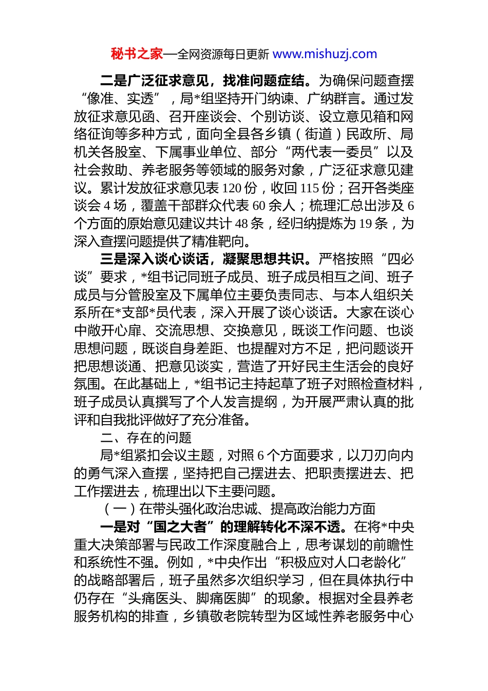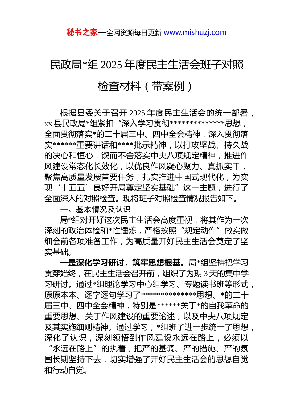 秘书之家—全网资源每日更新 www.mishuzj.com民政局*组 2025 年度民主生活会班子对照检查材料(带案例)根据县委关于召开 2025 年度民主生活会的统一部署,xx 县民政局*组紧扣“深入学习贯彻**************思想,全面贯彻落实*的二十届三中、四中全会精神,深入贯彻落实******重要讲话和****批示精神,以打攻坚战、持久战的决心和恒心,锲而不舍落实中央八项规定精神,推进作风建设常态化长效化,以优良作风凝心聚力、真抓实干,聚焦高质量发展首要任务,扎实推进中国式现代化,为实现‘十五五’良好开局奠定坚实基础”这一主题,进行了全面深入的对照检查。现将班子对照检查情况报告如下。一、基本情况及认识局*组对开好这次民主生活会高度重视,将其作为一次深刻的政治体检和*性锤炼,严格按照“规定动作”做实做细会前各项准备工作,为高质量开好民主生活会奠定了坚实基础。一是深化学习研讨,筑牢思想根基。局*组坚持把学习贯穿始终,在民主生活会召开前,组织了为期 3 天的集中学习研讨。通过*组理论学习中心组学习、专题读书班等形式,原原本本、逐字逐句学习了**************思想、*的二十届三中、四中全会精神,特别是******关于*的自我革命的重要思想、关于作风建设的重要论述,以及中央八项规定及其实施细则精神。通过学习,*组班子进一步统一了思想,深化了认识,深刻领悟到作风建设永远在路上,必须以“永远在路上”的执着,把严的基调、严的措施、严的氛围长期坚持下去,切实增强了开好民主生活会的思想自觉和行动自觉。秘书之家—全网资源每日更新 www.mishuzj.com二是广泛征求意见,找准问题症结。为确保问题查摆“像准、实透”,局*组坚持开门纳谏、广纳群言。通过发放征求意见函、召开座谈会、个别访谈、设立意见箱和网络征询等多种方式,面向全县各乡镇(街道)民政所、局机关各股室、下属事业单位、部分“两代表一委员”以及社会救助、养老服务等领域的服务对象,广泛征求意见建议。累计发放征求意见表 120 份,收回 115 份;召开各类座谈会 4 场,覆盖干部群众代表 60 余人;梳理汇总出涉及 6个方面的原始意见建议共计 48 条,经归纳提炼为 19 条,为深入查摆问题提供了精准靶向。三是深入谈心谈话,凝聚思想共识。严格按照“四必谈”要求,*组书记同班子成员、班子成员相互之间、班子成员与分管股室及下属单位主要负责同志、与本人组织关系所在*支部*员代表,深入开展了谈心谈话。大家在谈心中敞开心扉、交流思想、交换意见,既谈工作问题、也谈思想问题,既谈自身差距、也提醒对方不足,把问题谈开把思想谈通、把意见谈实,营造了开好民主生活会的良好氛围。在此基础上,*组书记主持起草了班子对照检查材料,班子成员认真撰写了个人发言提纲,为开展严肃认真的批评和自我批评做好了充分准备。二、存在的问题局*组紧扣会议主题,对照 6 个方面要求,以刀刃向内的勇气深入查摆,坚持把自己摆进去、把职责摆进去、把工作摆进去,梳理出以下主要问题。(一)在带头强化政治忠诚、提高政治能力方面一是对“国之大者”的理解转化不深不透。在将*中央重大决策部署与民政工作深度融合上,思考谋划的前瞻性和系统性不强。例如,*中央作出“积极应对人口老龄化”的战略部署后,班子虽然多次组织学习,但在具体执行中仍存在“头痛医头、脚痛医脚”的现象。根据对全县养老服务机构的排查,乡镇敬老院转型为区域性养老服务中心秘书之家—全网资源每日更新 www.mishuzj.com的进度仅完成计划的 70%,部分转型后的机构在医养结合、专业照护功能上仍是“换汤不换药”,未能完全满足失能半失能老人的刚性需求,这反映出班子在将顶层设计转化为符合县域实际、可操作、见实效的具体项目和行动方案上,政治执行力存在“最后一公里”的梗阻。二是贯彻落实上级决策部署存在“温差”。对上级*委的一些新部署新要求,有时满足于开会传达、文件转发,在结合 xx 县民政工作实际、创造性地抓好落实上主动性不强。2025 年市委提出要打造“15 分钟养老服务圈”,局*组迅速制定了方案,但在推进过程中,对部分老旧城区和偏远乡村选址难、建设成本高等现实困难...