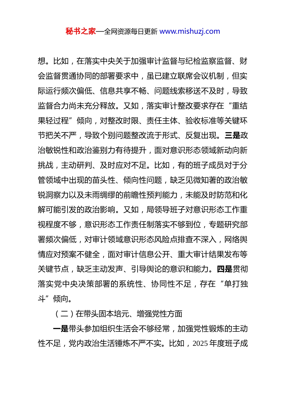 秘书之家—全网资源每日更新 www.mishuzj.com审计局领导班子 2025 年度民主生活会对照检查材料 根据上级党委关于开好 2025 年党员干部民主生活会的部署要求,局领导班子紧紧围绕本次会议主题,通过集中学习和个人自学相结合的方式,深入学习习近平总书记关于党的建设和自我革命的重要思想,学习党的二十届四中全会精神、中央八项规定精神及其实施细则,打牢思想基础。在此基础上,广泛征求基层单位、服务对象及干部职工意见建议,深入开展谈心谈话,聚焦规定的五个方面,全面梳理检视问题,认真撰写对照检查材料,深刻剖析问题根源,明确整改方向和措施。现将对照检查情况报告如下:一、对标对表深入检视问题(一)在带头强化政治忠诚、提高政治能力方面一是政治理论学习的持续性不够,部分会议未严格落实“第一议题”制度,存在以业务学习代替政治理论学习倾向。比如,个别班子成员政治理论学习与业务工作协调不够,更多精力忙于业务工作,参加政治理论学习时间偏少、深度不足,未能真正做到“学思用贯通、知信行统一”。二是政治执行力存在“温差”“落差”,有些政策落地打折扣,实际效果不理秘书之家—全网资源每日更新 www.mishuzj.com想。比如,在落实中央关于加强审计监督与纪检监察监督、财会监督贯通协同的部署要求中,虽已建立联席会议机制,但实际运行频次偏低、信息共享不畅、问题线索移送不及时,导致监督合力尚未充分释放。又如,落实审计整改要求存在“重结果轻过程”倾向,对整改时限、责任主体、验收标准等关键环节把关不严,导致个别问题整改流于形式、反复出现。三是政治敏锐性和政治鉴别力有待提升,面对意识形态领域新动向新挑战,主动研判、及时应对不足。比如,有的班子成员对于分管领域中出现的苗头性、倾向性问题,缺乏见微知著的政治敏锐洞察力以及未雨绸缪的前瞻性预判能力,未能及时防范和化解可能引发的政治影响。又如,局领导班子对意识形态工作重视程度不够,意识形态工作责任制落实不够到位,专题研究部署频次偏低,对审计领域意识形态风险点排查不深入,网络舆情应对预案不健全,面对审计信息公开、重大审计结果发布等关键节点,缺乏主动发声、引导舆论的意识和能力。四是贯彻落实党中央决策部署的系统性、协同性不足,存在“单打独斗”倾向。(二)在带头固本培元、增强党性方面一是带头参加组织生活会不够经常,加强党性锻炼的主动性不足,党内政治生活锤炼不严不实。比如,2025 年度班子成秘书之家—全网资源每日更新 www.mishuzj.com员以普通党员身份参加所在党支部组织生活会,支部组织生活会质量不高,存在理论学习流于形式、批评与自我批评“辣味”不足等问题。又如,有的班子成员对组织生活要求标准不高,参加党内政治生活时,抱有“例行公事”的应付态度,对组织安排的集中学习教育投入精力不够,未能真正入脑入心,致使理想信念的“总开关”出现松动,面对工作中的困难挑战,攻坚克难的精神动力有所减弱。二是学习成果转化不明显,理论指导实践能力偏弱,学用脱节现象依然存在。比如,党组理论中心组学习、全局党政工作会学习,存在重数量轻质量倾向,学习内容与审计主责主业结合不紧密,未能有效转化为提升监督质效、优化审计流程、防范廉政风险的具体举措。又如,部分班子成员对新修订的《审计法》《党政主要领导干部和国有企事业单位主要领导人员经济责任审计规定》等政策理解不深、把握不准,实践中仍沿用旧思路、老办法,导致审计建议针对性不强、整改建议可操作性不足。三是团结协作意识有待加强,存在本位主义倾向,班子成员、科室之间沟通协调不够顺畅,存在互相推诿、信息共享不及时现象,影响审计项目整体推进效率。比如,在跨科室联合审计项目中,因职责边界模糊、任务分工不清,导致问题线索移交滞后、证据链衔接不畅,个别项目进度严重超期。又如,对重大政策跟踪审计中发现的系统秘书之家—全网资源每日更新 www.mishuzj.com性风险,缺乏统筹研判和协同处置机制,未能及时向党委政府提出具有全局视野的决策参考。有些班子成员示范引领作用发挥不明显,对身边同志的带动激励不足,未能营造上下同心、协同攻坚的...