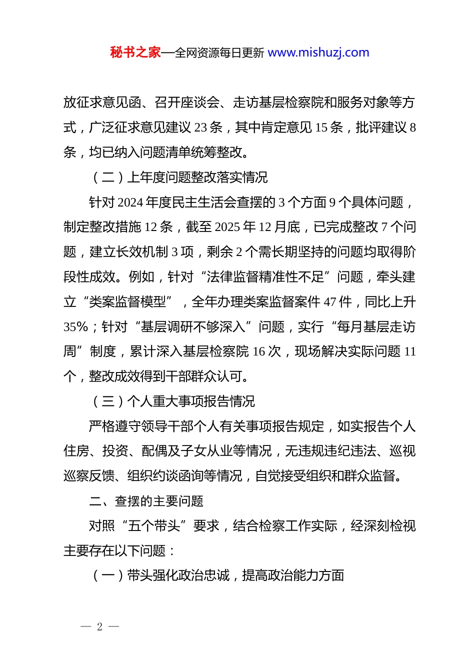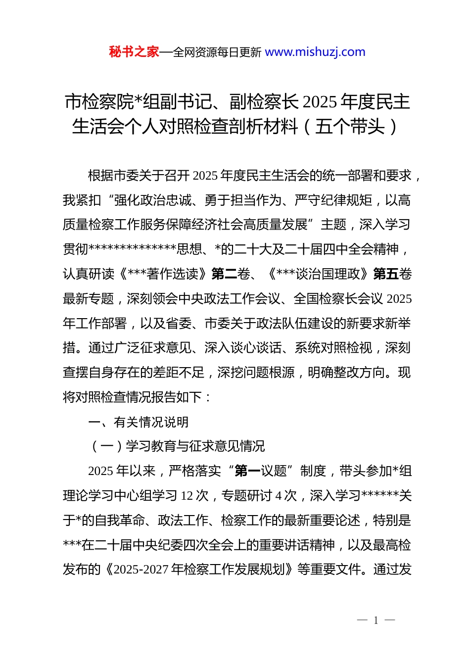秘书之家—全网资源每日更新 www.mishuzj.com市检察院*组副书记、副检察长 2025 年度民主生活会个人对照检查剖析材料(五个带头)根据市委关于召开 2025 年度民主生活会的统一部署和要求,我紧扣“强化政治忠诚、勇于担当作为、严守纪律规矩,以高质量检察工作服务保障经济社会高质量发展”主题,深入学习贯彻**************思想、*的二十大及二十届四中全会精神,认真研读《***著作选读》第二卷、《***谈治国理政》第五卷最新专题,深刻领会中央政法工作会议、全国检察长会议 2025年工作部署,以及省委、市委关于政法队伍建设的新要求新举措。通过广泛征求意见、深入谈心谈话、系统对照检视,深刻查摆自身存在的差距不足,深挖问题根源,明确整改方向。现将对照检查情况报告如下:一、有关情况说明(一)学习教育与征求意见情况2025 年以来,严格落实“第一议题”制度,带头参加*组理论学习中心组学习 12 次,专题研讨 4 次,深入学习******关于*的自我革命、政法工作、检察工作的最新重要论述,特别是***在二十届中央纪委四次全会上的重要讲话精神,以及最高检发布的《2025-2027 年检察工作发展规划》等重要文件。通过发— 1 —秘书之家—全网资源每日更新 www.mishuzj.com放征求意见函、召开座谈会、走访基层检察院和服务对象等方式,广泛征求意见建议 23 条,其中肯定意见 15 条,批评建议 8条,均已纳入问题清单统筹整改。(二)上年度问题整改落实情况针对 2024 年度民主生活会查摆的 3 个方面 9 个具体问题,制定整改措施 12 条,截至 2025 年 12 月底,已完成整改 7 个问题,建立长效机制 3 项,剩余 2 个需长期坚持的问题均取得阶段性成效。例如,针对“法律监督精准性不足”问题,牵头建立“类案监督模型”,全年办理类案监督案件 47 件,同比上升35%;针对“基层调研不够深入”问题,实行“每月基层走访周”制度,累计深入基层检察院 16 次,现场解决实际问题 11个,整改成效得到干部群众认可。(三)个人重大事项报告情况严格遵守领导干部个人有关事项报告规定,如实报告个人住房、投资、配偶及子女从业等情况,无违规违纪违法、巡视巡察反馈、组织约谈函询等情况,自觉接受组织和群众监督。二、查摆的主要问题对照“五个带头”要求,结合检察工作实际,经深刻检视主要存在以下问题:(一)带头强化政治忠诚,提高政治能力方面— 2 —秘书之家—全网资源每日更新 www.mishuzj.com1.政治理论学习“深度转化”不足。对**************思想的学习存在“浅尝辄止”现象,特别是对“两个结合”的最新阐释、“国之大者”在检察领域的具体体现,学习不够系统深入。例如,在学习 2025 年中央政法工作会议提出的“统筹发展和安全”要求时,仅停留在会议精神传达层面,未结合我市检察工作实际制定具体落实方案,导致部分基层检察院在办理涉企合规案件时,对“安全合规”与“发展保障”的平衡把握不准,全年此类案件撤回起诉 2 件,反映出理论指导实践的穿透力不足。2.政治判断力“前瞻预警”不够。面对新形势下的风险挑战,缺乏见微知著的政治敏锐性。2025 年第三季度,我市出现多起利用网络平台实施的新型诈骗案件,涉及群众 120 余人,初期仅作为普通刑事案件办理,未能及时察觉此类案件背后的社会治理漏洞和政治影响,直到上级检察院通报相关典型案例后,才牵头开展专项监督,暴露出对新型犯罪的政治风险研判不及时、不全面。3.政治执行力“刚性落实”有差距。对上级决策部署的执行存在“打折扣”现象,特别是在落实最高检《关于加强新时代检察机关法律监督工作的意见》配套措施时,存在“选择性执行”问题。例如,对于要求建立的“行政执法与刑事司法衔— 3 —秘书之家—全网资源每日更新 www.mishuzj.com接信息共享平台”,因协调难度大、投入成本高,推进速度缓慢,截至 2025 年底仍未实现与全市所有行政执法单位的互联互通,影响了法律监督的整体效能。(二)带头担当作为,推动高质量发展方面1.检察业务创新“突破力度”不足。面对检察工作现代化要求,创新意识和攻坚锐气不够。在推进“数字检察”建设中,仍...