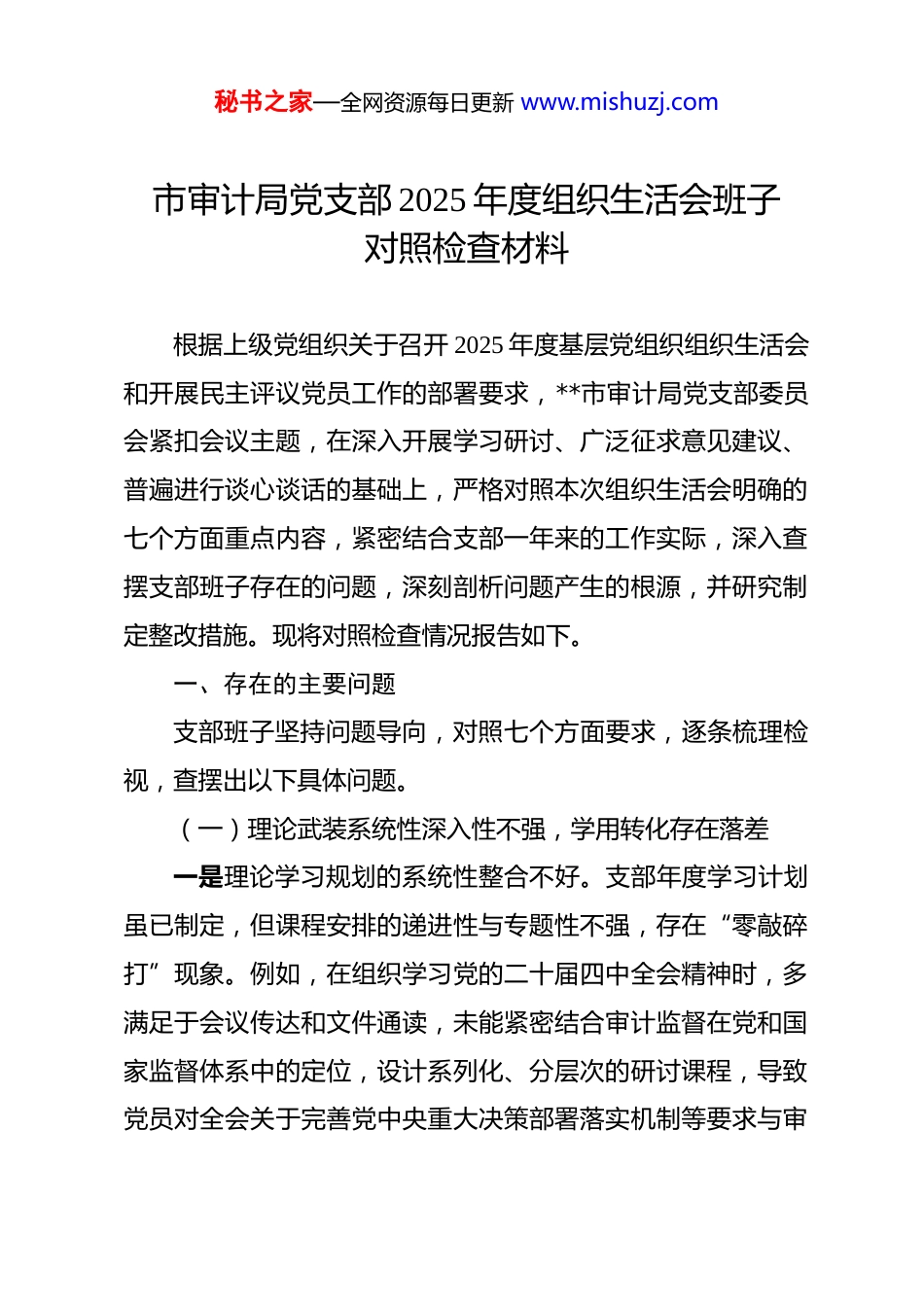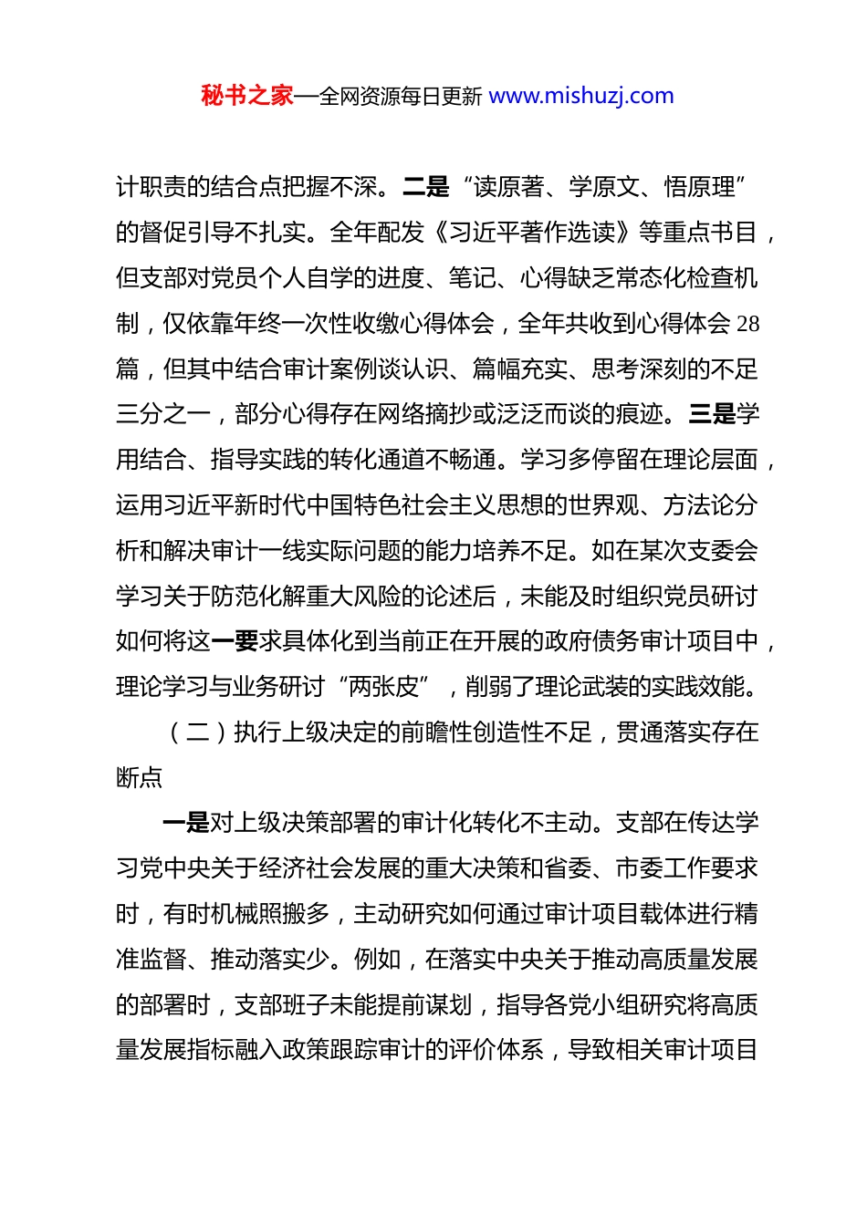秘书之家—全网资源每日更新 www.mishuzj.com市审计局党支部 2025 年度组织生活会班子对照检查材料 根据上级党组织关于召开 2025 年度基层党组织组织生活会和开展民主评议党员工作的部署要求,**市审计局党支部委员会紧扣会议主题,在深入开展学习研讨、广泛征求意见建议、普遍进行谈心谈话的基础上,严格对照本次组织生活会明确的七个方面重点内容,紧密结合支部一年来的工作实际,深入查摆支部班子存在的问题,深刻剖析问题产生的根源,并研究制定整改措施。现将对照检查情况报告如下。一、存在的主要问题支部班子坚持问题导向,对照七个方面要求,逐条梳理检视,查摆出以下具体问题。(一)理论武装系统性深入性不强,学用转化存在落差一是理论学习规划的系统性整合不好。支部年度学习计划虽已制定,但课程安排的递进性与专题性不强,存在“零敲碎打”现象。例如,在组织学习党的二十届四中全会精神时,多满足于会议传达和文件通读,未能紧密结合审计监督在党和国家监督体系中的定位,设计系列化、分层次的研讨课程,导致党员对全会关于完善党中央重大决策部署落实机制等要求与审秘书之家—全网资源每日更新 www.mishuzj.com计职责的结合点把握不深。二是“读原著、学原文、悟原理”的督促引导不扎实。全年配发《习近平著作选读》等重点书目,但支部对党员个人自学的进度、笔记、心得缺乏常态化检查机制,仅依靠年终一次性收缴心得体会,全年共收到心得体会 28篇,但其中结合审计案例谈认识、篇幅充实、思考深刻的不足三分之一,部分心得存在网络摘抄或泛泛而谈的痕迹。三是学用结合、指导实践的转化通道不畅通。学习多停留在理论层面,运用习近平新时代中国特色社会主义思想的世界观、方法论分析和解决审计一线实际问题的能力培养不足。如在某次支委会学习关于防范化解重大风险的论述后,未能及时组织党员研讨如何将这一要求具体化到当前正在开展的政府债务审计项目中,理论学习与业务研讨“两张皮”,削弱了理论武装的实践效能。(二)执行上级决定的前瞻性创造性不足,贯通落实存在断点一是对上级决策部署的审计化转化不主动。支部在传达学习党中央关于经济社会发展的重大决策和省委、市委工作要求时,有时机械照搬多,主动研究如何通过审计项目载体进行精准监督、推动落实少。例如,在落实中央关于推动高质量发展的部署时,支部班子未能提前谋划,指导各党小组研究将高质量发展指标融入政策跟踪审计的评价体系,导致相关审计项目秘书之家—全网资源每日更新 www.mishuzj.com启动后,审计重点一度不够聚焦。二是调动党员积极性主动性的平台载体不丰富。围绕中心、服务大局主要依赖行政指令和项目分工,支部层面搭建的党员攻坚克难、建言献策平台较少。2025 年,支部仅组织了一次“金点子”征集活动,且后续对可行建议的跟踪落实乏力,党员在跨科室、跨项目协作中展现创造性的机会不多,个别业务骨干的潜能未得到充分激发。三是重大事项报告请示的规范性自觉性不够。支部班子对党员领导干部个人有关事项报告的监督提醒到位,但对支部层面一些需向上级党组织请示报告的工作,有时存在“怕麻烦”、“等通知”的心理。如支部计划与**社区开展深度共建活动,前期调研已形成初步方案,但未在支委会形成决议后第一时间向上级机关党委作专项报告,直至上级问询才补充材料,程序规范意识有待强化。(三)组织生活制度执行刚性软化,政治熔炉作用不显一是“三会一课”内容吸引力感染力下降。党员大会、支委会、党小组会的召开次数虽达到规定要求,但议题设置有时与党员思想实际和业务关切结合不紧。第三季度一次党小组会主要学习上级文件,历时一个半小时,期间两名党员因审计项目紧急任务中途离场,会后反馈收获感不强。主题党日活动形式仍以参观学习、志愿服务为主,运用情景模拟、案例辩论等秘书之家—全网资源每日更新 www.mishuzj.com互动式、体验式方法创新不足,全年 12 次主题党日中此类创新形式仅占 2 次。二是谈心谈话的深度和针对性不强。支部委员与党员之间的谈心谈话多集中在组织生活会前和职务变动时,日常随机性、关怀性谈话较少。谈话内容往往围绕工作...