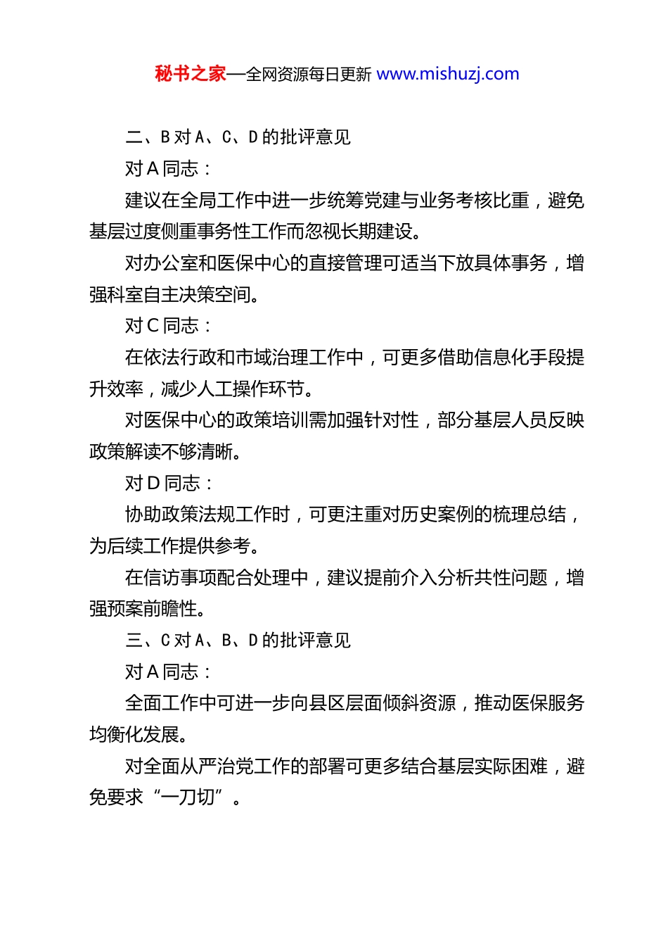 秘书之家—全网资源每日更新 www.mishuzj.com市医疗保障局领导班子成员相互批评意见党组书记、局长:A党组成员、副局长:B党组成员、副局长:C二级主任科员:D一、A 对 B、C、D 的批评意见对 B 同志:建议在基金监管和医药服务管理工作中,进一步加强对基层单位的常态化指导,避免政策执行出现区域性差异。在协助分管党建和意识形态工作时,可更多结合业务实际提出创新性举措,增强党建与业务融合的实效性。对 C 同志:政策法规和待遇保障工作的推进节奏可适当加快,尤其在优化营商环境方面需更主动对接企业需求。对医保中心(除稽查科、信息科)的日常管理可更细化,强化对重点环节的风险防控。对 D 同志:在协助政策法规工作中,建议更主动独立地承担调研任务提升对复杂问题的研判能力。需加强与其他科室的横向沟通,避免因信息不对称影响政策落实效率。秘书之家—全网资源每日更新 www.mishuzj.com二、B 对 A、C、D 的批评意见对 A 同志:建议在全局工作中进一步统筹党建与业务考核比重,避免基层过度侧重事务性工作而忽视长期建设。对办公室和医保中心的直接管理可适当下放具体事务,增强科室自主决策空间。对 C 同志:在依法行政和市域治理工作中,可更多借助信息化手段提升效率,减少人工操作环节。对医保中心的政策培训需加强针对性,部分基层人员反映政策解读不够清晰。对 D 同志:协助政策法规工作时,可更注重对历史案例的梳理总结,为后续工作提供参考。在信访事项配合处理中,建议提前介入分析共性问题,增强预案前瞻性。三、C 对 A、B、D 的批评意见对 A 同志:全面工作中可进一步向县区层面倾斜资源,推动医保服务均衡化发展。对全面从严治党工作的部署可更多结合基层实际困难,避免要求“一刀切”。秘书之家—全网资源每日更新 www.mishuzj.com对 B 同志:基金监管工作中需加强跨部门数据共享,部分环节仍存在信息滞后问题。在文明城市建设等综合性任务中,可更充分调动业务科室参与积极性。对 D 同志:政策法规研究需加强前瞻性,例如对医保支付方式改革等新课题应提前布局。在落实“两代表一委员”交办工作时,可建立更规范的跟踪反馈机制。四、D 对 A、B、C 的批评意见对 A 同志:建议在干部队伍建设中增加专业培训频次,尤其针对新政策开展专题学习。全局工作部署可更明确阶段性重点,避免多项任务并行导致基层压力过大。对 B 同志:安全生产监管等工作可更多结合医保特点,例如加强对医疗机构基金使用安全的专项检查。在档案管理、双联双助等工作中,可进一步优化流程减少重复劳动。对 C 同志:秘书之家—全网资源每日更新 www.mishuzj.com医疗待遇保障政策的宣传方式可更多样化,目前部分群众对政策细节知晓度不高。在招商引资等跨领域工作中,建议更注重与医保主业的有效衔接。