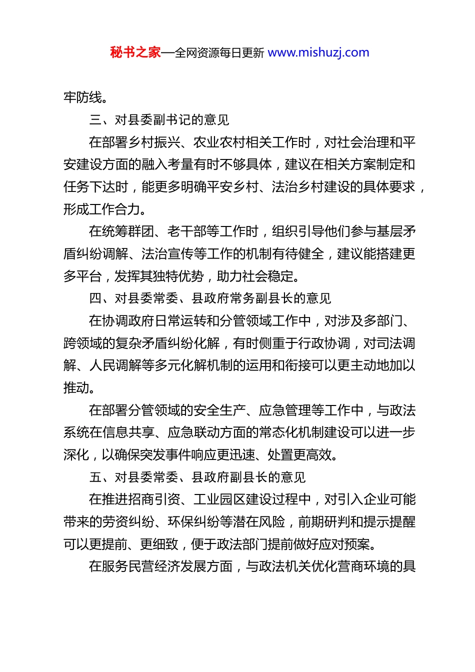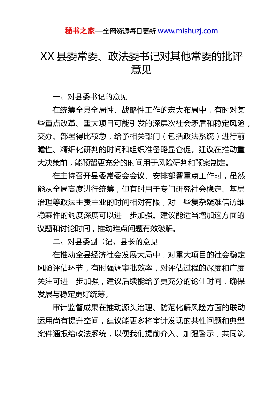 秘书之家—全网资源每日更新 www.mishuzj.comXX 县委常委、政法委书记对其他常委的批评意见一、对县委书记的意见在统筹全县全局性、战略性工作的宏大布局中,有时对某些重点改革、重大项目可能引发的深层次社会矛盾和稳定风险,交办、部署得比较急,给予相关部门(包括政法系统)进行前瞻性、精细化研判的时间和组织准备略显仓促。建议在推动重大决策前,能预留更充分的时间用于风险研判和预案制定。在主持召开县委常委会会议、安排部署重点工作时,虽然能从全局高度进行统筹,但有时用于专门研究社会稳定、基层治理等政法主责主业的时间相对有限,对一些复杂疑难信访维稳案件的调度深度可以进一步加强。建议能适当增加这方面的议题和讨论时间,推动难点问题有效破解。二、对县委副书记、县长的意见在推动全县经济社会发展大局中,对重大项目的社会稳定风险评估环节,有时强调审批效率,对评估过程的深度和广度关注可进一步加强,建议后续能给予更充分的论证时间,确保发展与稳定更好统筹。审计监督成果在推动源头治理、防范化解风险方面的联动运用尚有提升空间,建议能更多将审计发现的共性问题和典型案件通报给政法系统,以便我们提前介入、加强警示,共同筑秘书之家—全网资源每日更新 www.mishuzj.com牢防线。三、对县委副书记的意见在部署乡村振兴、农业农村相关工作时,对社会治理和平安建设方面的融入考量有时不够具体,建议在相关方案制定和任务下达时,能更多明确平安乡村、法治乡村建设的具体要求,形成工作合力。在统筹群团、老干部等工作时,组织引导他们参与基层矛盾纠纷调解、法治宣传等工作的机制有待健全,建议能搭建更多平台,发挥其独特优势,助力社会稳定。四、对县委常委、县政府常务副县长的意见在协调政府日常运转和分管领域工作中,对涉及多部门、跨领域的复杂矛盾纠纷化解,有时侧重于行政协调,对司法调解、人民调解等多元化解机制的运用和衔接可以更主动地加以推动。在部署分管领域的安全生产、应急管理等工作中,与政法系统在信息共享、应急联动方面的常态化机制建设可以进一步深化,以确保突发事件响应更迅速、处置更高效。五、对县委常委、县政府副县长的意见在推进招商引资、工业园区建设过程中,对引入企业可能带来的劳资纠纷、环保纠纷等潜在风险,前期研判和提示提醒可以更提前、更细致,便于政法部门提前做好应对预案。在服务民营经济发展方面,与政法机关优化营商环境的具秘书之家—全网资源每日更新 www.mishuzj.com体举措(如涉企案件快速办理机制)对接不够紧密,建议加强沟通,共同提升法治化营商环境水平。六、对县委常委、宣传部长的意见在意识形态和网络舆情管控方面,对于涉及社会敏感点、可能引发不稳定因素的网络信息,与政法系统的信息互通和会商研判机制响应速度有时可以更快,以便协同做好引导和处置工作。在组织红色教育、文化旅游活动中,融入法治元素、平安建设的内容可以更丰富一些,建议共同策划一些主题宣传活动,提升教育活动的综合效益。七、对县委常委、纪委书记、监委主任的意见在党风廉政建设和反腐败斗争中,对查处案件中暴露出的制度漏洞和监管薄弱环节,向相关领域(尤其是政法系统以外的经济民生领域)提出监察建议并跟踪督办的力度可以进一步加大,推动以案促治。在优化营商环境监督工作中,与政法机关在打击侵害企业合法权益行为方面的协同配合可以更紧密,线索移送和信息反馈流程可以进一步优化。八、对县委常委、组织部部长的意见在干部选拔任用和日常管理监督中,对关键岗位干部(尤其是涉及执法司法、项目管理等岗位)的法治素养、社会治理能力的考察考核指标可以更细化、更具操作性。秘书之家—全网资源每日更新 www.mishuzj.com在推动科技创新工作中,对智慧政法建设、社会治理智能化平台研发应用等方面的资源投入和技术支持力度,相较于其他领域,尚有提升空间,建议能给予更多关注。九、对县委常委、人武部政委的意见在党管武装和国防动员体系中,组织民兵等力量参与基层平安创建、应急处突等工作的常态化机制和训练内容可以更具体、更贴近实战需求。在军地协作方面,围绕退役军人安置、涉军维权等...