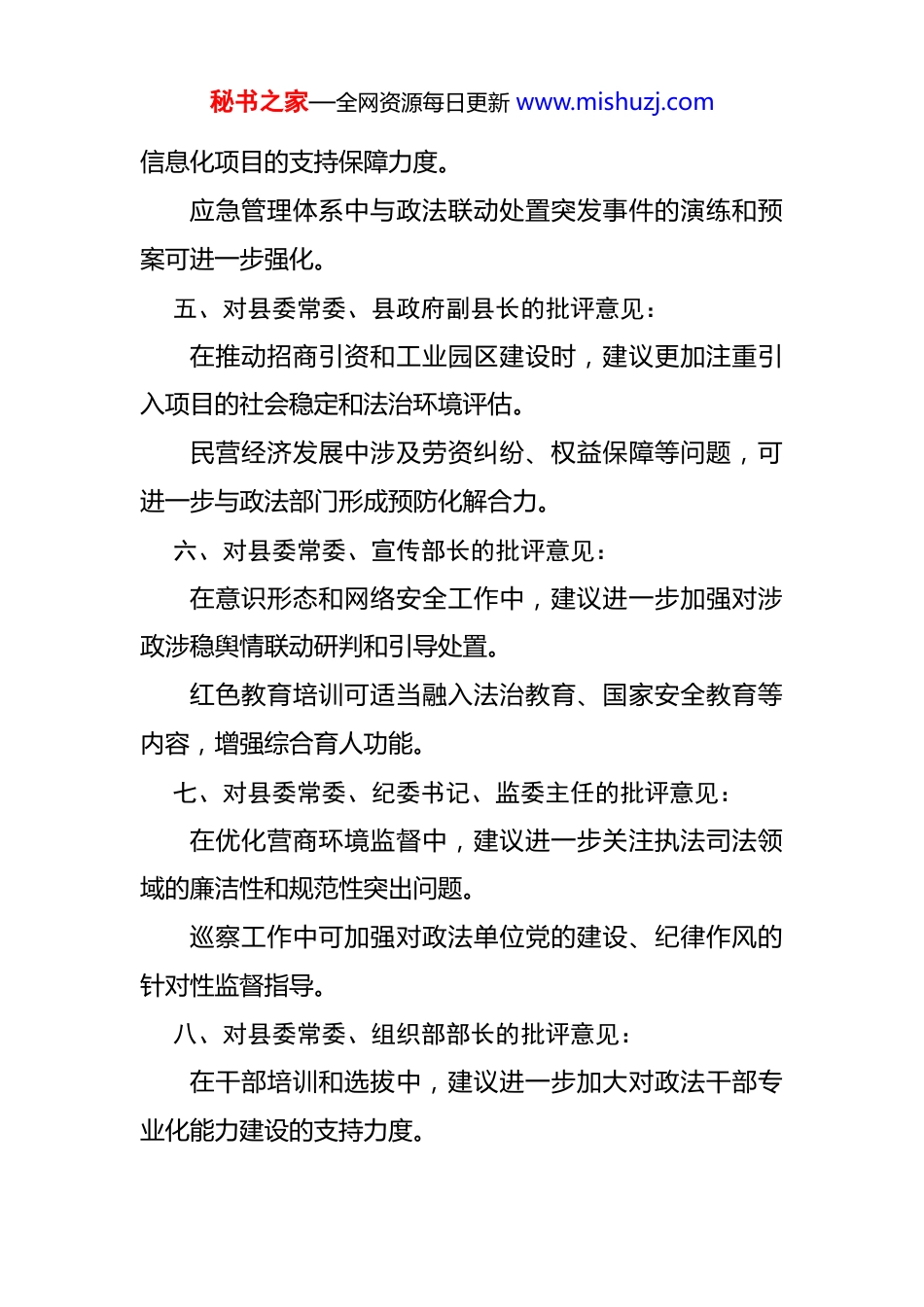 秘书之家—全网资源每日更新 www.mishuzj.comXX 县委常委、政法委书记对其他常委的批评意见一、对县委书记的批评意见:在部署全县重大工作时,建议进一步加强对政法稳定工作的专题调研和系统指导,推动维稳与发展更紧密结合。在听取常委汇报时,可适当增加对社会治理创新、风险防范化解等议题的调度频次和深度。二、对县委副书记、县长的批评意见:在推动经济社会发展过程中,建议更加注重与政法系统的联动,特别是在重大项目社会稳定风险评估方面加强提前介入。审计监督与政法监督的协同机制有待进一步强化,建议推动建立常态化信息互通和工作会商制度。三、对县委副书记的批评意见:在统筹乡村振兴和农业农村工作中,建议进一步融入“平安乡村”建设内容,提升农村治理效能。信访维稳工作虽已取得成效,但在源头预防和多元化解方面还可加强机制创新和资源整合。四、对县委常委、县政府常务副县长的批评意见:在协调政府日常工作时,建议加大对政法基础建设、秘书之家—全网资源每日更新 www.mishuzj.com信息化项目的支持保障力度。应急管理体系中与政法联动处置突发事件的演练和预案可进一步强化。五、对县委常委、县政府副县长的批评意见:在推动招商引资和工业园区建设时,建议更加注重引入项目的社会稳定和法治环境评估。民营经济发展中涉及劳资纠纷、权益保障等问题,可进一步与政法部门形成预防化解合力。六、对县委常委、宣传部长的批评意见:在意识形态和网络安全工作中,建议进一步加强对涉政涉稳舆情联动研判和引导处置。红色教育培训可适当融入法治教育、国家安全教育等内容,增强综合育人功能。七、对县委常委、纪委书记、监委主任的批评意见:在优化营商环境监督中,建议进一步关注执法司法领域的廉洁性和规范性突出问题。巡察工作中可加强对政法单位党的建设、纪律作风的针对性监督指导。八、对县委常委、组织部部长的批评意见:在干部培训和选拔中,建议进一步加大对政法干部专业化能力建设的支持力度。秘书之家—全网资源每日更新 www.mishuzj.com编制资源配置可适当向基层政法和社会治理岗位倾斜,缓解一线力量不足问题。九、对县委常委、人武部政委的批评意见:在党管武装工作中,建议进一步推动民兵队伍参与基层治安联防、应急维稳等工作。国防教育与政法系统的安全教育可加强融合宣传,增强全社会安全共同体意识。十、对县委常委、统战部部长、县总工会主席的批评意见:在民族宗教、非公经济领域工作中,建议进一步强化与政法部门在风险排查、矛盾调处方面的协作。工会维权工作可加强与司法调解、法律援助等机制的衔接,提升依法维权实效。十一、对县委常委、县委办公室主任的批评意见:在统筹县委日常运转中,建议进一步优化常委会议题设置,增加社会治理、法治建设等内容的审议安排。政策研究可更多关注基层治理创新、矛盾化解机制等课题,为县委决策提供参考。