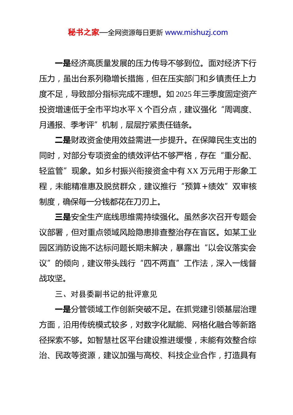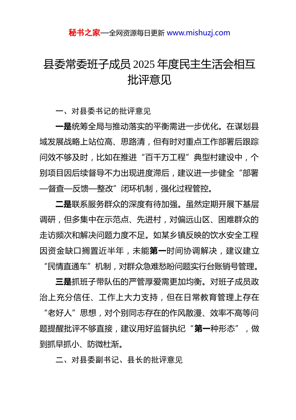 秘书之家—全网资源每日更新 www.mishuzj.com县委常委班子成员 2025 年度民主生活会相互批评意见 一、对县委书记的批评意见一是统筹全局与推动落实的平衡需进一步优化。在谋划县域发展战略上站位高、思路清,但有时对重点工作部署后跟踪问效不够及时,比如在推进“百千万工程”典型村建设中,个别项目因后续督导不力出现进度滞后,建议进一步健全“部署—督查—反馈—整改”闭环机制,强化过程管控。二是联系服务群众的深度有待加强。虽然定期开展下基层调研,但多集中在示范点、先进村,对偏远山区、困难群众的走访频次和解决问题力度不足。如某乡镇反映的饮水安全工程因资金缺口搁置近半年,未能第一时间协调解决,建议建立“民情直通车”机制,对群众急难愁盼问题实行台账销号管理。三是抓班子带队伍的严管厚爱需更加均衡。对班子成员政治上充分信任、工作上大力支持,但在日常教育管理上存在“老好人”思想,对个别同志存在的作风散漫、效率不高等问题提醒批评不够直接,建议用好监督执纪“第一种形态”,做到抓早抓小、防微杜渐。二、对县委副书记、县长的批评意见秘书之家—全网资源每日更新 www.mishuzj.com一是经济高质量发展的压力传导不够到位。面对经济下行压力,虽出台系列稳增长措施,但在压实部门和乡镇责任上力度不足,导致部分指标完成不理想。如 2025 年三季度固定资产投资增速低于全市平均水平 X 个百分点,建议强化“周调度、月通报、季考评”机制,层层拧紧责任链条。二是财政资金使用效益需进一步提升。在保障民生支出的同时,对部分专项资金的绩效评估不够严格,存在“重分配、轻监管”现象。如乡村振兴衔接资金中有 XX 万元用于形象工程,未能精准惠及脱贫群众,建议推行“预算+绩效”双审核制度,确保每一分钱都花在刀刃上。三是安全生产底线思维需持续强化。虽然多次召开专题会议部署,但对重点领域风险隐患排查整治存在盲区。如某工业园区消防设施不达标问题长期未解决,暴露出“以会议落实会议”的倾向,建议带头践行“四不两直”工作法,深入一线督战攻坚。三、对县委副书记的批评意见一是分管领域工作创新突破不足。在抓党建引领基层治理方面,沿用传统模式较多,对数字化赋能、网格化融合等新路径探索不够。如智慧社区平台建设推进缓慢,未能有效整合综治、民政等资源,建议加强与高校、科技企业合作,打造具有秘书之家—全网资源每日更新 www.mishuzj.com本县特色的治理样板。二是干部队伍建设系统性谋划欠缺。在年轻干部培养上,多依赖组织部门常规安排,主动搭建实践锻炼平台较少。目前35 岁以下科级干部占比仅 XX%,低于全市平均 X 个百分点,建议实施“青苗计划”,通过专班攻坚、跨岗交流等方式加速成长。三是意识形态阵地管理存在薄弱环节。对新媒体传播规律研究不深,应对网络舆情反应速度有待提升。如某次突发事件中,官方回应滞后导致谣言扩散,建议建立“宣传+网信+公安”联动机制,提升舆情引导能力。四、对县委常委、县纪委书记的批评意见一是政治监督具体化精准化水平需提高。在监督党中央重大决策部署落实时,有时存在“上下一般粗”问题,未能紧密结合本县实际细化监督清单。如对耕地保护政策执行情况的监督,未针对我县丘陵地貌特点制定差异化措施,建议建立“一领域一方案”监督模式。二是“三不腐”一体推进的协同效应未充分释放。在查办案件的同时,对案发单位以案促改督促指导不够,部分单位整改报告流于形式。如某局连续两年发生同类违纪问题,暴露出警示教育震慑力不足,建议推行“一案五必须”(必须通报、秘书之家—全网资源每日更新 www.mishuzj.com必须剖析、必须整改、必须回访、必须建制)机制。三是纪检监察队伍专业化建设需加力。面对新型腐败、隐性腐败手段,部分干部存在“本领恐慌”。如在办理金融领域案件时,因缺乏专业人才导致取证周期过长,建议实施“尖兵锻造”工程,通过跟班学习、专家授课等方式提升实战能力。五、对县委常委、县委组织部部长的批评意见一是干部考核评价体系科学性有待增强。现行考核指标偏重经济数据,对生态环保、民生改善等潜绩考量不足,导致部分干部存在“重显绩、...