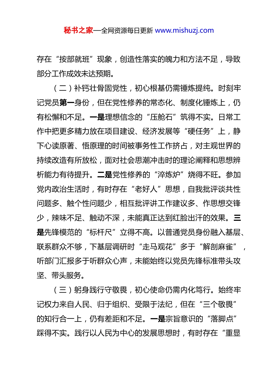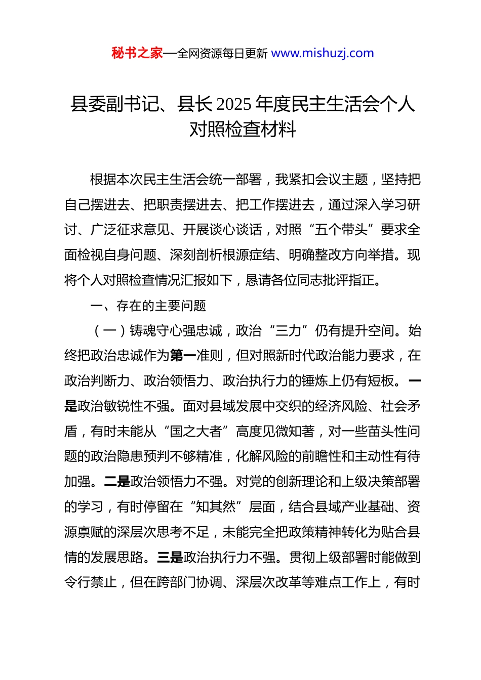 秘书之家—全网资源每日更新 www.mishuzj.com县委副书记、县长 2025 年度民主生活会个人对照检查材料 根据本次民主生活会统一部署,我紧扣会议主题,坚持把自己摆进去、把职责摆进去、把工作摆进去,通过深入学习研讨、广泛征求意见、开展谈心谈话,对照“五个带头”要求全面检视自身问题、深刻剖析根源症结、明确整改方向举措。现将个人对照检查情况汇报如下,恳请各位同志批评指正。一、存在的主要问题(一)铸魂守心强忠诚,政治“三力”仍有提升空间。始终把政治忠诚作为第一准则,但对照新时代政治能力要求,在政治判断力、政治领悟力、政治执行力的锤炼上仍有短板。一是政治敏锐性不强。面对县域发展中交织的经济风险、社会矛盾,有时未能从“国之大者”高度见微知著,对一些苗头性问题的政治隐患预判不够精准,化解风险的前瞻性和主动性有待加强。二是政治领悟力不强。对党的创新理论和上级决策部署的学习,有时停留在“知其然”层面,结合县域产业基础、资源禀赋的深层次思考不足,未能完全把政策精神转化为贴合县情的发展思路。三是政治执行力不强。贯彻上级部署时能做到令行禁止,但在跨部门协调、深层次改革等难点工作上,有时秘书之家—全网资源每日更新 www.mishuzj.com存在“按部就班”现象,创造性落实的魄力和方法不足,导致部分工作成效未达预期。(二)补钙壮骨固党性,初心根基仍需锤炼提纯。时刻牢记党员第一身份,但在党性修养的常态化、制度化锤炼上,仍有松懈和不足。一是理想信念的“压舱石”筑得不实。日常工作中把更多精力放在项目建设、经济发展等“硬任务”上,静下心读原著、悟原理的时间被事务性工作挤占,对主观世界的持续改造有所放松,面对社会思潮冲击时的理论阐释和思想辨析能力有待提升。二是党性修养的“淬炼炉”烧得不旺。参加党内政治生活时,有时存在“老好人”思想,自我批评谈共性问题多、触个性问题少,相互批评讲工作建议多、作思想交锋少,辣味不足、触动不深,未能真正达到红脸出汗的效果。三是先锋模范的“标杆尺”立得不高。以普通党员身份融入基层、联系群众不够,下基层调研时“走马观花”多于“解剖麻雀”,听部门汇报多于听群众心声,未能始终以党员先锋标准带头攻坚、带头服务。(三)躬身践行守敬畏,初心使命仍需内化笃行。始终牢记权力来自人民、归于组织、受限于法纪,但在“三个敬畏”的知行合一上,仍有差距和不足。一是宗旨意识的“落脚点”踩得不实。践行以人民为中心的发展思想时,有时存在“重显秘书之家—全网资源每日更新 www.mishuzj.com绩、轻潜绩”倾向,对上级考核的硬指标抓得紧,对群众反映强烈但短期难见成效的民生小事推进慢,未能始终把群众安危冷暖放在首位。二是组织观念的“规矩线”守得不严。严格遵守党的组织纪律,但在执行请示报告、议事决策等制度时,有时存在“小事简化、事后补报”的情况,对组织程序的严肃性认识不够,主动向组织汇报思想、工作、情况的自觉性有待加强。三是法治思维的“方向盘”把得不牢。处理复杂矛盾和历史遗留问题时,有时习惯于用行政手段、经验办法推进工作,运用法治思维谋划工作、法治方式解决问题的能力不足,依法执政、依法行政的意识仍需强化。(四)挺膺担当勇作为,攻坚劲头仍需加压奋进。始终秉持“为官一任、造福一方”的初心,但在干事创业、担当作为的精气神上,仍有短板和弱项。一是斗争精神的“锋芒度”不够。面对县域发展中的深层次矛盾,如产业转型瓶颈、城乡融合难题等,有时存在求稳怕乱思想,敢于较真碰硬、迎难而上的劲头不足,对一些棘手问题存在“等靠要”心态。二是创新锐气的“突破力”不足。工作中习惯于按传统思路、既有模式推进,面对新情况新问题,跳出思维定势、探索新路径新方法的主动性不够,在培育新质生产力、打造特色产业品牌等工作中,缺乏“无中生有、敢为人先”的创新魄力。三是落实韧劲秘书之家—全网资源每日更新 www.mishuzj.com的“钉钉子”精神不强。对一些跨年度、跨部门的重点工作,前期部署紧、中期推进松、后期督查软,未能形成闭环管理,有时存在“虎头蛇尾”现象,工作落实的深度和实效有待提升。(五)扛责守...