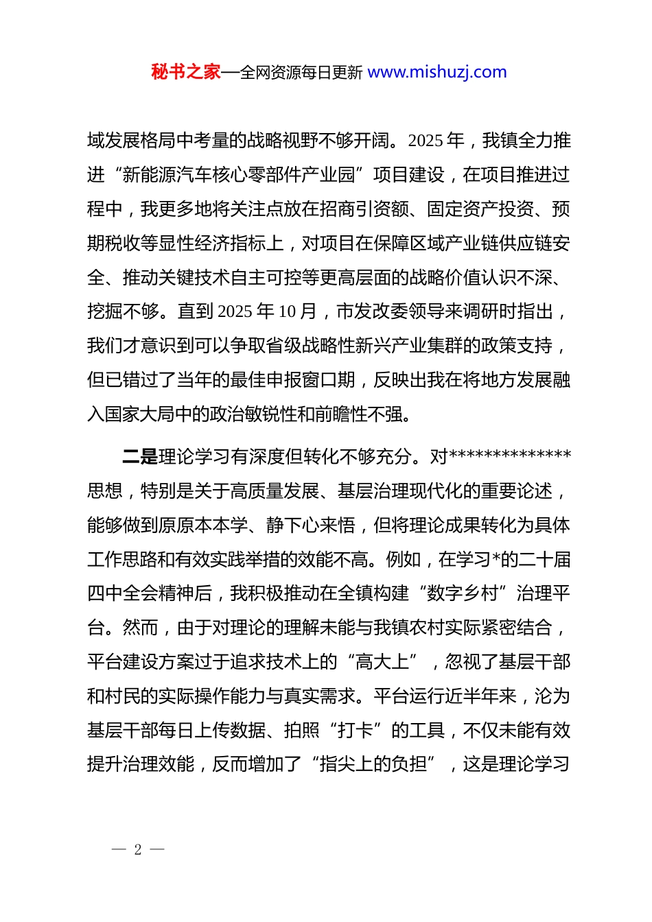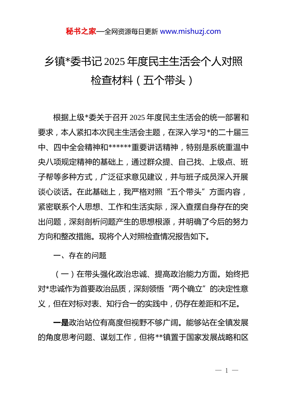 秘书之家—全网资源每日更新 www.mishuzj.com乡镇*委书记 2025 年度民主生活会个人对照检查材料(五个带头)根据上级*委关于召开 2025 年度民主生活会的统一部署和要求,本人紧扣本次民主生活会主题,在深入学习*的二十届三中、四中全会精神和******重要讲话精神,特别是系统重温中央八项规定精神的基础上,通过群众提、自己找、上级点、班子帮等多种方式,广泛征求意见建议,并与班子成员深入开展谈心谈话。在此基础上,我严格对照“五个带头”方面内容,紧密联系个人思想、工作和生活实际,深入查摆自身存在的突出问题,深刻剖析问题产生的思想根源,并明确了今后的努力方向和整改措施。现将个人对照检查情况报告如下。一、存在的问题(一)在带头强化政治忠诚、提高政治能力方面。始终把对*忠诚作为首要政治品质,深刻领悟“两个确立”的决定性意义,但在对标对表、知行合一的实践中,仍存在差距和不足。一是政治站位有高度但视野不够广阔。能够站在全镇发展的角度思考问题、谋划工作,但将**镇置于国家发展战略和区— 1 —秘书之家—全网资源每日更新 www.mishuzj.com域发展格局中考量的战略视野不够开阔。2025 年,我镇全力推进“新能源汽车核心零部件产业园”项目建设,在项目推进过程中,我更多地将关注点放在招商引资额、固定资产投资、预期税收等显性经济指标上,对项目在保障区域产业链供应链安全、推动关键技术自主可控等更高层面的战略价值认识不深、挖掘不够。直到 2025 年 10 月,市发改委领导来调研时指出,我们才意识到可以争取省级战略性新兴产业集群的政策支持,但已错过了当年的最佳申报窗口期,反映出我在将地方发展融入国家大局中的政治敏锐性和前瞻性不强。二是理论学习有深度但转化不够充分。对**************思想,特别是关于高质量发展、基层治理现代化的重要论述,能够做到原原本本学、静下心来悟,但将理论成果转化为具体工作思路和有效实践举措的效能不高。例如,在学习*的二十届四中全会精神后,我积极推动在全镇构建“数字乡村”治理平台。然而,由于对理论的理解未能与我镇农村实际紧密结合,平台建设方案过于追求技术上的“高大上”,忽视了基层干部和村民的实际操作能力与真实需求。平台运行近半年来,沦为基层干部每日上传数据、拍照“打卡”的工具,不仅未能有效提升治理效能,反而增加了“指尖上的负担”,这是理论学习— 2 —秘书之家—全网资源每日更新 www.mishuzj.com与工作实践“两张皮”的典型表现。三是贯彻执行有力度但韧劲不够持久。对于上级*委的决策部署,能够做到闻令而动、坚决执行,但在一些需要长期坚持、久久为功的工作上,存在“开头一阵火,中间稳吞水”的现象。2025 年上半年,我镇在农村人居环境整治工作中投入巨大精力,集中力量解决了垃圾乱堆、污水乱排等一批顽疾,在全市二季度考核中名列前茅。但进入下半年,随着工作重心转移到产业项目和安全生产上,我对人居环境整治的关注度和督导力度明显下降。11 月份我到**村暗访时发现,新建的垃圾分类处理站已经半停运,部分村民又恢复了老习惯,前期的整治成果出现“回潮”。这暴露出我抓工作的恒心和韧劲不足,缺乏“钉钉子”精神,对工作的长期性、艰巨性认识不深刻。(二)在带头固本培元、增强*性方面。始终注重加强*性锻炼,但在改造主观世界、锤炼*性修养的自觉性和彻底性上,仍存在不足。一是思想淬炼重宏大叙事但轻日常躬省。在*委中心组学习、讲授专题*课时,能够引经据典,系统阐述*的创新理论和光荣历史。但在个人自学和独处时,往往更关注与工作直接相关的政策文件、产业资讯,而静下心来重温马列经典、对照*章*规— 3 —秘书之家—全网资源每日更新 www.mishuzj.com反躬自省的时间和精力投入不够。对一些社会上的错误思潮和网络上的负面言论,虽然能保持政治上的清醒和坚定,但有时满足于不信不传,缺少从思想根源上进行深入剖析和坚决斗争的主动性,反映出在复杂的意识形态领域的战斗精神有所弱化。二是*性锤炼重组织生活但轻内心叩问。能够严格执行双重组织生活制度,认真参加民主生活会、组织生活会,带头开展批评和自我批评。但在实...