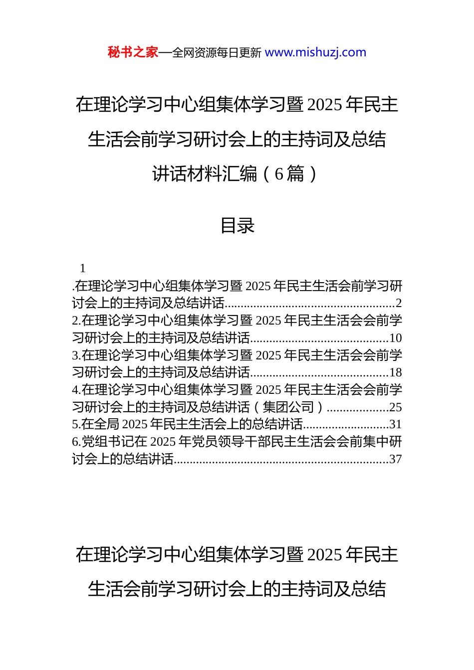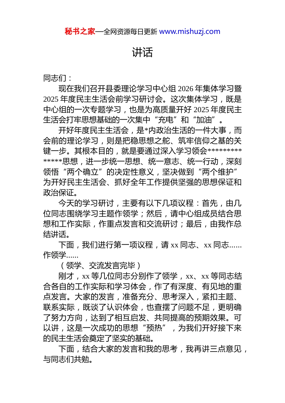 秘书之家—全网资源每日更新 www.mishuzj.com在理论学习中心组集体学习暨 2025 年民主生活会前学习研讨会上的主持词及总结讲话材料汇编(6 篇)目录1.在理论学习中心组集体学习暨 2025 年民主生活会前学习研讨会上的主持词及总结讲话.....................................................22.在理论学习中心组集体学习暨 2025 年民主生活会会前学习研讨会上的主持词及总结讲话...........................................103.在理论学习中心组集体学习暨 2025 年民主生活会会前学习研讨会上的主持词及总结讲话...........................................184.在理论学习中心组集体学习暨 2025 年民主生活会会前学习研讨会上的主持词及总结讲话(集团公司)...................255.在全局 2025 年民主生活会上的总结讲话...........................316.党组书记在 2025 年党员领导干部民主生活会会前集中研讨会上的总结讲话...................................................................37在理论学习中心组集体学习暨 2025 年民主生活会前学习研讨会上的主持词及总结秘书之家—全网资源每日更新 www.mishuzj.com讲话同志们:现在我们召开县委理论学习中心组 2026 年集体学习暨2025 年度民主生活会前学习研讨会。这次集体学习,既是中心组的一次专题学习,也是为高质量开好 2025 年度民主生活会打牢思想基础的一次集中“充电”和“加油”。开好年度民主生活会,是*内政治生活的一件大事,而会前的理论学习,则是把稳思想之舵、筑牢信仰之基的关键一步。其根本目的,就是要通过深入学习领会**************思想,进一步统一思想、统一意志、统一行动,深刻领悟“两个确立”的决定性意义,坚决做到“两个维护”为开好民主生活会、抓好全年工作提供坚强的思想保证和政治保证。今天的学习研讨,主要有以下几项议程:首先,由几位同志围绕学习主题作领学;然后,请中心组成员结合思想和工作实际,作重点发言和交流研讨;最后,由我作总结讲话。下面,我们进行第一项议程,请 xx 同志、xx 同志……作领学……(领学、交流发言完毕)刚才,xx 等几位同志分别作了领学,xx、xx 等同志结合各自的工作实际和学习体会,作了有深度、有见地的重点发言。大家的发言,准备充分、思考深入,紧扣主题、联系实际,既谈了认识体会,也查摆了问题不足,更明确了努力方向,达到了相互启发、共同提高的预期效果。可以讲,这是一次成功的思想“预热”,为我们开好接下来的民主生活会奠定了坚实的基础。下面,结合大家的发言和我的思考,我再讲三点意见,与同志们共勉。秘书之家—全网资源每日更新 www.mishuzj.com一、在深学细悟中铸魂增智,深刻把握*的创新理论的精髓要义与实践伟力思想是行动的先导,理论是实践的指南。**************思想,是一个系统完备、逻辑严密、内涵丰富、博大精深的科学体系。我们抓学习,绝不能满足于“学过了”“读过了”,而必须往深处走、往实处走、往心里走,真正做到学思用贯通、知信行统一。(一)把握“两个结合”的根本要求,筑牢思想根基。***强调,“两个结合”是我们取得成功的最大法宝。一是要深刻理解“把马克思主义基本原理同中国具体实际相结合”的实践逻辑。这要求我们必须坚持一切从实际出发,把大政方针与我县的发展阶段、资源禀赋有效连接。我们不能当“传声筒”“收发室”,必须把上级精神转化为符合 xx 县情的“施工图”“任务书”。二是要深刻感悟“把马克思主义基本原理同中华优秀传统文化相结合”的文化意蕴。中华优秀传统文化是我们最深厚的文化软实力,其中蕴含的“民为邦本”“天人合一”“革故鼎新”等思想为我们观察时代、把握时代、引领时代提供了丰富的智慧滋养。我们要善于从中汲取力量,让我们的决策部署既有理论高度,更有文化温度和历史厚度。(二)聚焦“新质生产力”的发展要义,找准主攻方向。发展新质生产力是推动高质量发展的内在要求和重要着力点。我们县要实现换道超车、跨越发展,就必须牢牢牵住这个“牛鼻子”。一是要深刻认识科技创新这个核心要素。我们必须清醒地看到,我县目前研发...