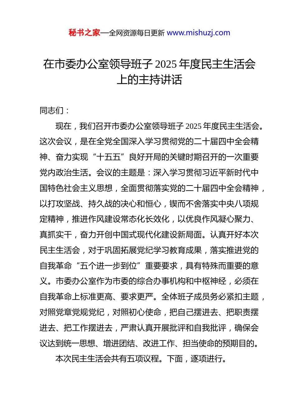 秘书之家—全网资源每日更新 www.mishuzj.com在市委办公室领导班子 2025 年度民主生活会上的主持讲话 同志们:现在,我们召开市委办公室领导班子 2025 年度民主生活会。这次会议,是在全党全国深入学习贯彻党的二十届四中全会精神、奋力实现“十五五”良好开局的关键时期召开的一次重要党内政治生活。会议的主题是:深入学习贯彻习近平新时代中国特色社会主义思想,全面贯彻落实党的二十届四中全会精神,以打攻坚战、持久战的决心和恒心,锲而不舍落实中央八项规定精神,推进作风建设常态化长效化,以优良作风凝心聚力、真抓实干,奋力开创中国式现代化建设新局面。认真开好本次民主生活会,对于巩固拓展党纪学习教育成果,落实推进党的自我革命“五个进一步到位”重要要求,具有特殊而重要的意义。市委办公室作为市委的综合办事机构和中枢神经,必须在自我革命上标准更高、要求更严。全体班子成员务必紧扣主题,对照党章党规党纪,对照初心使命,把自己摆进去、把职责摆进去、把工作摆进去,严肃认真开展批评和自我批评,确保会议达到统一思想、增进团结、改进工作、担当使命的预期目的。本次民主生活会共有五项议程。下面,逐项进行。秘书之家—全网资源每日更新 www.mishuzj.com第一项议程:由我代表领导班子,通报 2025 年中央八项规定精神贯彻落实情况报告和 2025 年度民主生活会会前准备情况。(内容略)第二项议程:由我代表领导班子作检视剖析发言。(内容略)第三项议程:各班子成员进行个人对照检查发言,并接受其他同志的批评。(内容略)第四项议程:请**同志(督导组组长)进行点评讲话。(内容略)第五项议程:由我代表领导班子进行表态讲话。刚才,督导组**组长作了精准深刻的点评讲话,既充分肯定了我们的前期工作和会议成效,也明确指出了存在的问题和不足,并对下一步整改落实提出了具体而严格的要求。这充分体现了市委对我们的严管厚爱和殷切期望,我们诚恳接受、照单全收,并将以最坚决的态度、最扎实的举措抓好贯彻落实。习近平总书记深刻指出,“自我革命是我们党跳出治乱兴衰历史周期率的第二个答案,从抓作风入手推进全面从严治党是新时代党的自我革命一条重要经验”。本次民主生活会,通过深刻的批评与自我批评,我们共同经历了一次严肃的党性锤炼和秘书之家—全网资源每日更新 www.mishuzj.com作风洗礼。查摆出的问题,既有个性的,也有共性的;既有思想层面的,也有工作层面的,归根结底反映了我们在将严的要求内化于心、外化于行上还存在差距。对此,我代表市委办公室领导班子郑重表态如下:一、坚守政治机关根本属性,在淬炼绝对忠诚上作表率、立新标。市委办公室首先是政治机关,政治属性是第一属性,对党绝对忠诚是生命线和根本点。针对查摆中反映出的在运用党的创新理论指导“三服务”工作实践、穿透性落实市委决策部署等方面存在的不足,我们将把理论学习摆在更加突出的位置。不仅持续深入学习习近平新时代中国特色社会主义思想的核心要义,更要将其置于党的二十届四中全会作出的新战略部署、赋予党委办公室的新时代使命中考量把握。我们将健全并严格落实“第一议题”制度,完善理论中心组学习、专题研讨、政治培训的闭环机制,确保党中央的各项方针政策、省委和市委的每一项工作部署,都能在办公室工作中不折不扣、不偏不倚地得到最迅速、最精准、最有力的执行和反馈。领导班子将带头深刻领悟“两个确立”的决定性意义,带头坚决做到“两个维护”,不断提高政治判断力、政治领悟力、政治执行力,确保办公室的各项工作始终沿着正确的政治方向前进,切实将办公室打造成为让市委最放心、最可靠的坚强前哨和巩固后院。秘书之家—全网资源每日更新 www.mishuzj.com二、聚焦中枢机构核心职能,在提升服务质效上出实招、求突破。围绕中心、服务大局是办公室工作的主题主线。对照查摆出的在辅助决策的前瞻性、督查落实的穿透力、统筹协调的权威性等方面的问题,我们将以“时时放心不下”的责任感和积极担当作为的精气神,全力破解。具体而言,信息调研工作将改变“等素材、编简报”的惯性,主动设置议题,围绕“十五五”规划实施中的战略性...