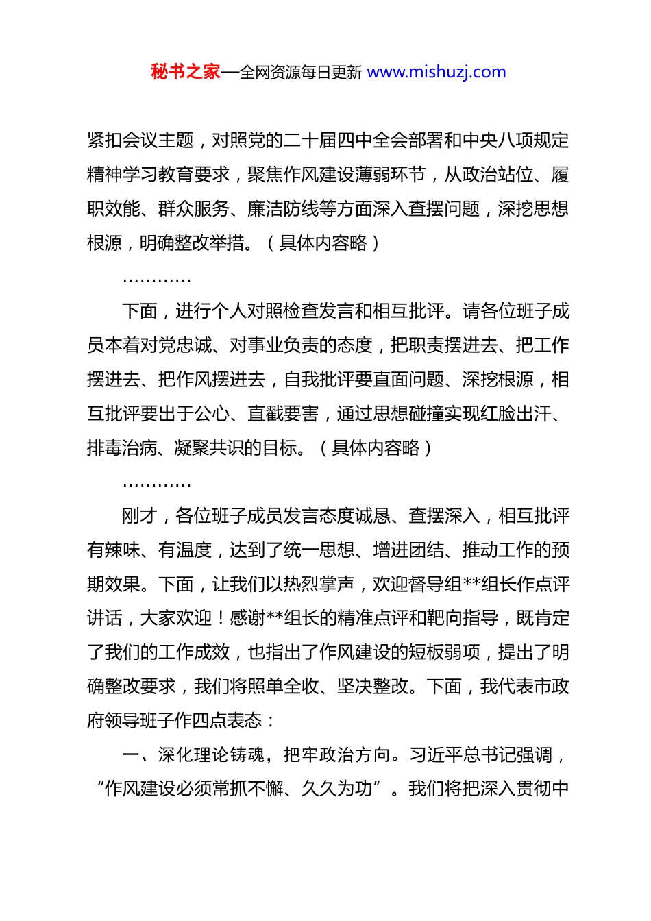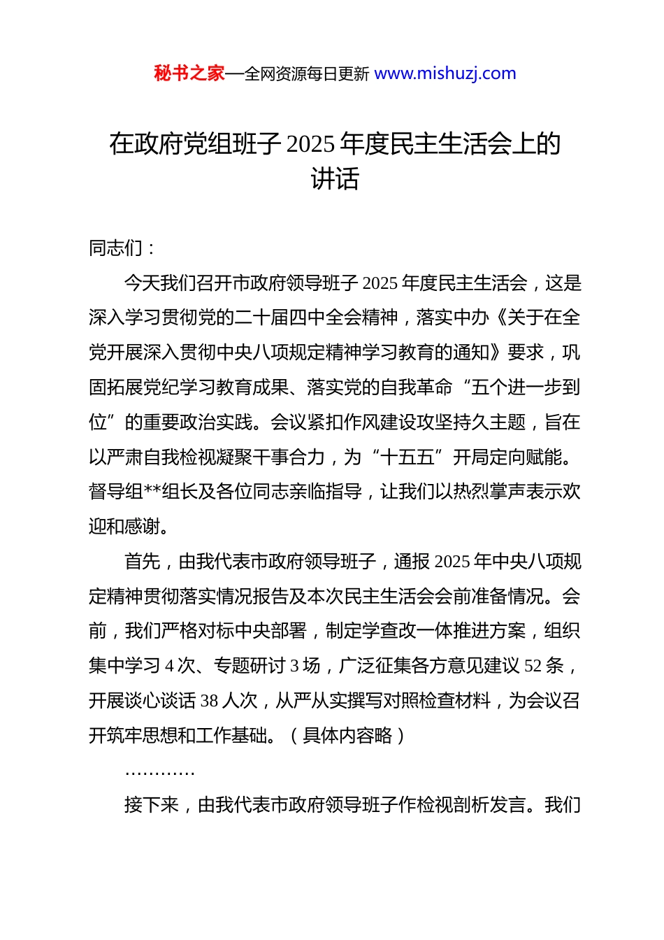 秘书之家—全网资源每日更新 www.mishuzj.com在政府党组班子 2025 年度民主生活会上的讲话 同志们:今天我们召开市政府领导班子 2025 年度民主生活会,这是深入学习贯彻党的二十届四中全会精神,落实中办《关于在全党开展深入贯彻中央八项规定精神学习教育的通知》要求,巩固拓展党纪学习教育成果、落实党的自我革命“五个进一步到位”的重要政治实践。会议紧扣作风建设攻坚持久主题,旨在以严肃自我检视凝聚干事合力,为“十五五”开局定向赋能。督导组**组长及各位同志亲临指导,让我们以热烈掌声表示欢迎和感谢。首先,由我代表市政府领导班子,通报 2025 年中央八项规定精神贯彻落实情况报告及本次民主生活会会前准备情况。会前,我们严格对标中央部署,制定学查改一体推进方案,组织集中学习 4 次、专题研讨 3 场,广泛征集各方意见建议 52 条,开展谈心谈话 38 人次,从严从实撰写对照检查材料,为会议召开筑牢思想和工作基础。(具体内容略)…………接下来,由我代表市政府领导班子作检视剖析发言。我们秘书之家—全网资源每日更新 www.mishuzj.com紧扣会议主题,对照党的二十届四中全会部署和中央八项规定精神学习教育要求,聚焦作风建设薄弱环节,从政治站位、履职效能、群众服务、廉洁防线等方面深入查摆问题,深挖思想根源,明确整改举措。(具体内容略)…………下面,进行个人对照检查发言和相互批评。请各位班子成员本着对党忠诚、对事业负责的态度,把职责摆进去、把工作摆进去、把作风摆进去,自我批评要直面问题、深挖根源,相互批评要出于公心、直戳要害,通过思想碰撞实现红脸出汗、排毒治病、凝聚共识的目标。(具体内容略)…………刚才,各位班子成员发言态度诚恳、查摆深入,相互批评有辣味、有温度,达到了统一思想、增进团结、推动工作的预期效果。下面,让我们以热烈掌声,欢迎督导组**组长作点评讲话,大家欢迎!感谢**组长的精准点评和靶向指导,既肯定了我们的工作成效,也指出了作风建设的短板弱项,提出了明确整改要求,我们将照单全收、坚决整改。下面,我代表市政府领导班子作四点表态:一、深化理论铸魂,把牢政治方向。习近平总书记强调,“作风建设必须常抓不懈、久久为功”。我们将把深入贯彻中秘书之家—全网资源每日更新 www.mishuzj.com央八项规定精神学习教育融入日常,每月开展 1 次专题研学,每季度组织 1 次作风建设复盘,深入落实党的二十届四中全会精神,切实把学习成果转化为践行“两个维护”的行动自觉,确保市政府工作始终与中央、省市委同频共振。严格落实学查改一体要求,以理论清醒筑牢作风坚定根基,不断提升政治判断力、政治领悟力、政治执行力。二、坚持立行立改,健全长效机制。紧扣督导组反馈意见和班子查摆问题,建立问题、责任、时限“三张清单”,明确36 项具体整改任务,实行销号管理、闭环落实,短期问题 15 日内整改到位,长期任务分阶段推进、3 个月内初见成效。对标中办学习教育通知要求,完善作风建设监督防控机制,全年开展专项督查 5 次,健全群众监督反馈渠道,坚决纠治形式主义、官僚主义,推动作风建设常态长效。三、聚焦履职攻坚,提升服务质效。立足市政府统筹经济社会发展核心职能,以优良作风推动“十五五”开局各项任务落地。全年谋划实施重点项目 135 个,办结民生实事 32 项,解决群众急难愁盼问题 160 件以上。深化“放管服”改革与政务服务数字化转型,压缩审批时限 45%,推行“一窗通办”全覆盖,以真抓实干作风破解发展难题,推动高质量发展取得新突破,为中国式现代化建设贡献力量。秘书之家—全网资源每日更新 www.mishuzj.com四、严守纪律底线,涵养清风正气。严格落实全面从严治党主体责任,带头执行中央八项规定及其实施细则精神,坚决抵制特权思想和特权现象。健全重点领域廉政风险防控体系,排查梳理风险点 35 个,完善防控措施,全年开展廉政警示教育3 次,强化以案为鉴、以案促改。班子成员带头廉洁自律,自觉接受各方监督,管好亲属和身边工作人员,筑牢拒腐防变防线,营造风清气正的政治生态。同志们,作风建设没有休止符。我们要以此次民...