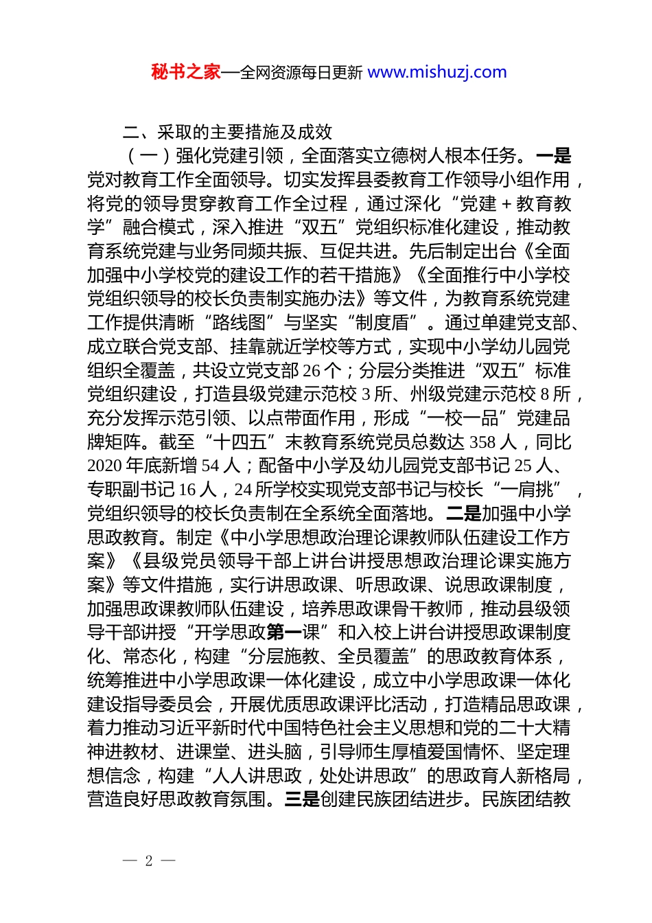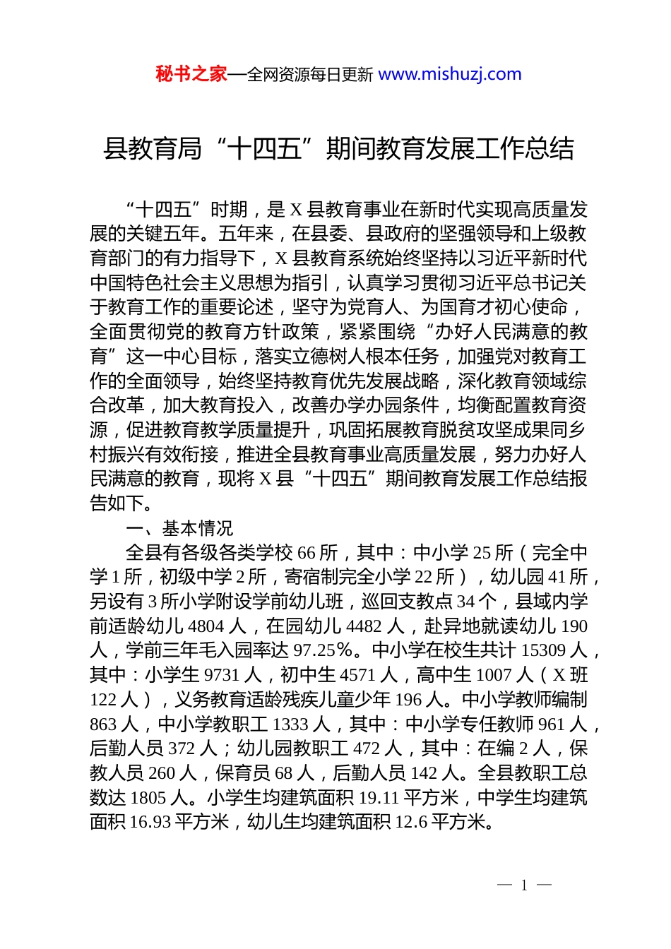 秘书之家—全网资源每日更新 www.mishuzj.com县教育局“十四五”期间教育发展工作总结“十四五”时期,是 X 县教育事业在新时代实现高质量发展的关键五年。五年来,在县委、县政府的坚强领导和上级教育部门的有力指导下,X 县教育系统始终坚持以习近平新时代中国特色社会主义思想为指引,认真学习贯彻习近平总书记关于教育工作的重要论述,坚守为党育人、为国育才初心使命,全面贯彻党的教育方针政策,紧紧围绕“办好人民满意的教育”这一中心目标,落实立德树人根本任务,加强党对教育工作的全面领导,始终坚持教育优先发展战略,深化教育领域综合改革,加大教育投入,改善办学办园条件,均衡配置教育资源,促进教育教学质量提升,巩固拓展教育脱贫攻坚成果同乡村振兴有效衔接,推进全县教育事业高质量发展,努力办好人民满意的教育,现将 X 县“十四五”期间教育发展工作总结报告如下。一、基本情况全县有各级各类学校 66 所,其中:中小学 25 所(完全中学 1 所,初级中学 2 所,寄宿制完全小学 22 所),幼儿园 41 所,另设有 3 所小学附设学前幼儿班,巡回支教点 34 个,县域内学前适龄幼儿 4804 人,在园幼儿 4482 人,赴异地就读幼儿 190人,学前三年毛入园率达 97.25%。中小学在校生共计 15309 人,其中:小学生 9731 人,初中生 4571 人,高中生 1007 人(X 班122 人),义务教育适龄残疾儿童少年 196 人。中小学教师编制863 人,中小学教职工 1333 人,其中:中小学专任教师 961 人,后勤人员 372 人;幼儿园教职工 472 人,其中:在编 2 人,保教人员 260 人,保育员 68 人,后勤人员 142 人。全县教职工总数达 1805 人。小学生均建筑面积 19.11 平方米,中学生均建筑面积 16.93 平方米,幼儿生均建筑面积 12.6 平方米。— 1 —秘书之家—全网资源每日更新 www.mishuzj.com二、采取的主要措施及成效(一)强化党建引领,全面落实立德树人根本任务。一是党对教育工作全面领导。切实发挥县委教育工作领导小组作用,将党的领导贯穿教育工作全过程,通过深化“党建+教育教学”融合模式,深入推进“双五”党组织标准化建设,推动教育系统党建与业务同频共振、互促共进。先后制定出台《全面加强中小学校党的建设工作的若干措施》《全面推行中小学校党组织领导的校长负责制实施办法》等文件,为教育系统党建工作提供清晰“路线图”与坚实“制度盾”。通过单建党支部、成立联合党支部、挂靠就近学校等方式,实现中小学幼儿园党组织全覆盖,共设立党支部 26 个;分层分类推进“双五”标准党组织建设,打造县级党建示范校 3 所、州级党建示范校 8 所,充分发挥示范引领、以点带面作用,形成“一校一品”党建品牌矩阵。截至“十四五”末教育系统党员总数达 358 人,同比2020 年底新增 54 人;配备中小学及幼儿园党支部书记 25 人、专职副书记 16 人,24 所学校实现党支部书记与校长“一肩挑”,党组织领导的校长负责制在全系统全面落地。二是加强中小学思政教育。制定《中小学思想政治理论课教师队伍建设工作方案》《县级党员领导干部上讲台讲授思想政治理论课实施方案》等文件措施,实行讲思政课、听思政课、说思政课制度,加强思政课教师队伍建设,培养思政课骨干教师,推动县级领导干部讲授“开学思政第一课”和入校上讲台讲授思政课制度化、常态化,构建“分层施教、全员覆盖”的思政教育体系,统筹推进中小学思政课一体化建设,成立中小学思政课一体化建设指导委员会,开展优质思政课评比活动,打造精品思政课,着力推动习近平新时代中国特色社会主义思想和党的二十大精神进教材、进课堂、进头脑,引导师生厚植爱国情怀、坚定理想信念,构建“人人讲思政,处处讲思政”的思政育人新格局,营造良好思政教育氛围。三是创建民族团结进步。民族团结教— 2 —秘书之家—全网资源每日更新 www.mishuzj.com育融入日常,以铸牢中华民族共同体意识为主线,将党的民族理论、民族政策纳入党委中心组及各校“周五”政治理论学习内容组织学习;指导学校依托宣传栏、微信公众号等载体宣传民族团...