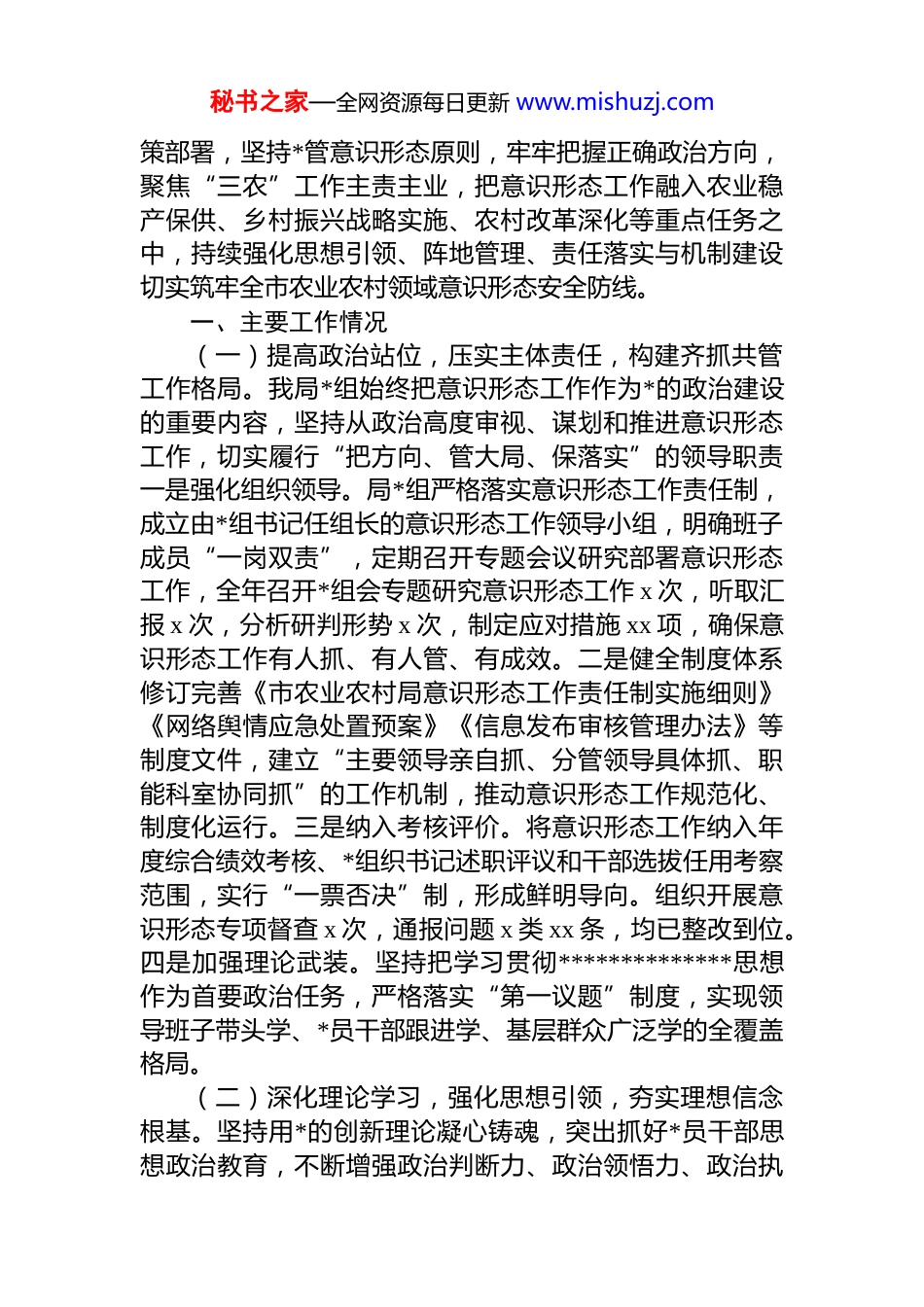 秘书之家—全网资源每日更新 www.mishuzj.com2025 年意识形态工作总结及 2026 年工作计划材料汇编(8 篇)(含集团公司)目录1.局党组 2025 年意识形态工作总结...........................................22.局党组 2025 年意识形态工作总结.........................................83.党委 2025 年意识形态工作总结及 2026 年工作计划(集团公司).......................................................................................164.党委 2025 年意识形态工作总结(集团公司)...................245.市委政法委 2025 年意识形态工作总结...............................296.市委社会工作部 2025 年度意识形态工作总结...................347.市委办公室 2025 年意识形态工作总结和 2026 年工作计划...................................................................................................438.市政府办公室党组 2025 年意识形态工作总结...................57局*组 2025 年意识形态工作总结2025 年,市农业农村局*组深入学习贯彻**************思想,全面落实*中央和省、市委关于意识形态工作的决秘书之家—全网资源每日更新 www.mishuzj.com策部署,坚持*管意识形态原则,牢牢把握正确政治方向,聚焦“三农”工作主责主业,把意识形态工作融入农业稳产保供、乡村振兴战略实施、农村改革深化等重点任务之中,持续强化思想引领、阵地管理、责任落实与机制建设切实筑牢全市农业农村领域意识形态安全防线。一、主要工作情况(一)提高政治站位,压实主体责任,构建齐抓共管工作格局。我局*组始终把意识形态工作作为*的政治建设的重要内容,坚持从政治高度审视、谋划和推进意识形态工作,切实履行“把方向、管大局、保落实”的领导职责一是强化组织领导。局*组严格落实意识形态工作责任制,成立由*组书记任组长的意识形态工作领导小组,明确班子成员“一岗双责”,定期召开专题会议研究部署意识形态工作,全年召开*组会专题研究意识形态工作 x 次,听取汇报 x 次,分析研判形势 x 次,制定应对措施 xx 项,确保意识形态工作有人抓、有人管、有成效。二是健全制度体系修订完善《市农业农村局意识形态工作责任制实施细则》《网络舆情应急处置预案》《信息发布审核管理办法》等制度文件,建立“主要领导亲自抓、分管领导具体抓、职能科室协同抓”的工作机制,推动意识形态工作规范化、制度化运行。三是纳入考核评价。将意识形态工作纳入年度综合绩效考核、*组织书记述职评议和干部选拔任用考察范围,实行“一票否决”制,形成鲜明导向。组织开展意识形态专项督查 x 次,通报问题 x 类 xx 条,均已整改到位。四是加强理论武装。坚持把学习贯彻**************思想作为首要政治任务,严格落实“第一议题”制度,实现领导班子带头学、*员干部跟进学、基层群众广泛学的全覆盖格局。(二)深化理论学习,强化思想引领,夯实理想信念根基。坚持用*的创新理论凝心铸魂,突出抓好*员干部思想政治教育,不断增强政治判断力、政治领悟力、政治执秘书之家—全网资源每日更新 www.mishuzj.com行力。一是坚持“第一议题”深学细悟。始终将学习贯彻******重要讲话和****批示精神作为*委会、中心组学习的“第一议题”,围绕******关于“三农”工作的重要论述、中央一号文件精神、粮食安全战略、乡村全面振兴等内容开展专题学习,做到及时跟进学、联系实际学、融会贯通学。全年传达学习中央及省市重要会议精神。二是推动理论学习走深走实。结合 zt 教育常态化长效化要求,制定年度学习计划,编印《“三农”政策理论学习读本》,开设“农讲堂”专题讲座 xx 期,邀请*校专家、高校教授、行业领军人才授课,提升学习的专业性与实效性。组织*员干部赴井冈山、瑞金等地开展红色研学活动 x 批次,重温入*誓词、缅怀革命先烈,赓续红色血脉。三是创新学习形式载体。依托“学习强国”平台、“赣鄱 dj 云”“江西农业农村”微信公众号等新媒体阵地,打造线上线下融合的学习矩阵。建立青年理论学习小组 x 个,开展读书分享、主...