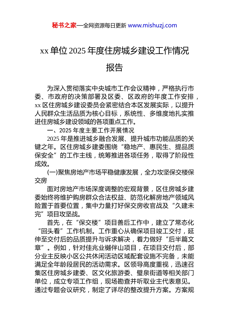 秘书之家—全网资源每日更新 www.mishuzj.comxx 单位 2025 年度住房城乡建设工作情况报告为深入贯彻落实中央城市工作会议精神,严格执行市委、市政府的决策部署及区委、区政府的年度工作安排,xx 区住房城乡建设委员会紧密结合本区发展实际,以提升人民群众生活品质为核心目标,系统性、多维度地扎实推进住房城乡建设领域的各项重点工作。一、2025 年度主要工作开展情况2025 年是推进城乡融合发展、提升城市功能品质的关键之年。区住房城乡建委围绕“稳地产、惠民生、提品质保安全”的工作主线,统筹推进各项任务,取得了阶段性成效。(一)聚焦房地产市场平稳健康发展,全力攻坚保交楼保交房面对房地产市场深度调整的宏观背景,区住房城乡建委始终将维护购房群众合法权益、防范化解房地产领域风险置于首要位置,集中力量打好保交房收官战及“久建未完”项目攻坚战。首先,在“保交楼”项目善后工作中,建立了常态化“回头看”工作机制。工作重心从确保项目竣工交付,延伸至交付后的品质提升与诉求解决,着力做好“后半篇文章”。例如,针对佳兆业樾伴山项目,在项目交付后,部分业主反映小区公共休闲活动区域配套设施不完备,未能满足全年龄段居民的活动需求。区领导高度重视,迅速召集区住房城乡建委、区文化旅游委、璧泉街道等相关部门单位,成立专项工作组,现场勘查并听取业主代表意见。通过专题会议研究,制定了详尽的整改提升方案。方案规秘书之家—全网资源每日更新 www.mishuzj.com划增设标准羽毛球场、儿童游戏沙坑、太空漫步机、组合式健身器械等多元化休闲健身设施。截至目前,施工单位已进场作业,相关设施基础工程已完成,设备采购与安装正有序进行,预计将于 2025 年 12 月中旬全面完工。该举措不仅及时回应了群众的合理诉求,更将为小区营造一个老少皆宜的和谐社区环境,显著提升了已交付项目的居住品质与业主满意度。其次,在“保交房”及“久建未完”项目处置工作中,采取了强有力的组织保障和创新的工作方法。由区级领导牵头包案,成立跨部门工作专班,统筹协调资源,为项目处置提供高级别的决策支持。工作专班深入研究并灵活运用国家及市级出台的各项纾困解难配套政策,坚持“一项目一策”的原则,对每个项目的具体问题进行精准分析,分类施策。通过引入战略投资者、协调司法重整、争取专项借款、盘活存量资产等多种方式,成功推动了 6 个长期停滞的项目实现复工续建,并促使 2 个项目最终达到竣工交付标准。年度内累计交付住宅 288 套,交付商业面积 1.4 万平方米,有力地保障了数百户购房家庭的合法权益,维护了区域社会大局的稳定。(二)引领高品质居住需求,有序推进“好房子”建设为适应人民群众对居住条件从“有没有”到“好不好”的转变,区住房城乡建委积极引导和推动区域住宅建设向高品质、绿色化、智能化方向转型。为提升行业认知水平,区住房城乡建委特邀国内知名行业专家,面向本区房地产开发与建筑行业的从业人员,举办了关于第四代住宅建设的专题培训讲座。讲座系统讲解了第四代住宅的政策导向、核心定义、设计理念、技术标准及关键设计规范,内容涵盖了从规划设计到施工建造的全过程要素。来自区内 16 家开发企业和 19 家建筑企业的工程、设计、成本、营销等核心岗位负责人共计 40 余人参加了培训。此次讲座极大地开阔了本土企业的视野,为我秘书之家—全网资源每日更新 www.mishuzj.com区推广庭院式、立体生态等新型住宅模式奠定了理论基础有效加快了我区“好房子”的建设进程。为吸引优质资本和先进开发理念,区住房城乡建委牵头组织了“2025 年 xx 区城市价值暨高品质建设用地推介会议”。会议全面展示了 xx 区的区位优势、产业基础、生态环境和未来规划,重点推介了一批区位优越、配套完善、适宜打造高品质住宅的建设用地。此举成功吸引了多家国内知名品牌房地产企业的关注与投资意向,为促进我区“好房子”建设、引入更多高水平开发项目创造了良好条件,从而推动 xx 城市能级的整体提升,为市民创造更高品质的生活空间。(三)完善住房保障体系,切实保障群众安居宜居区住房城乡建委持续健全以配售型保障性...