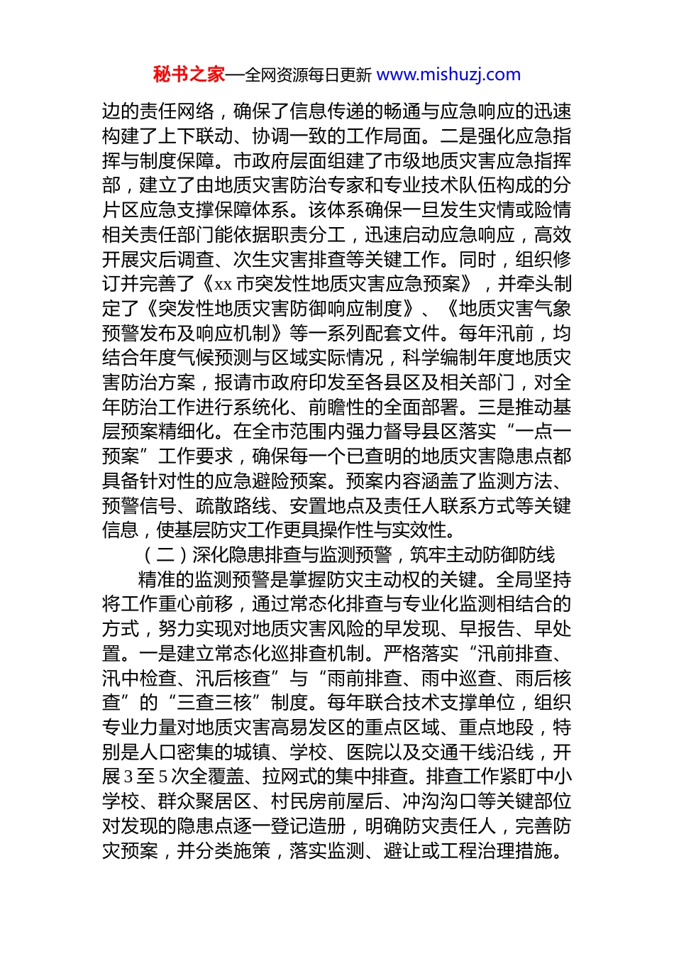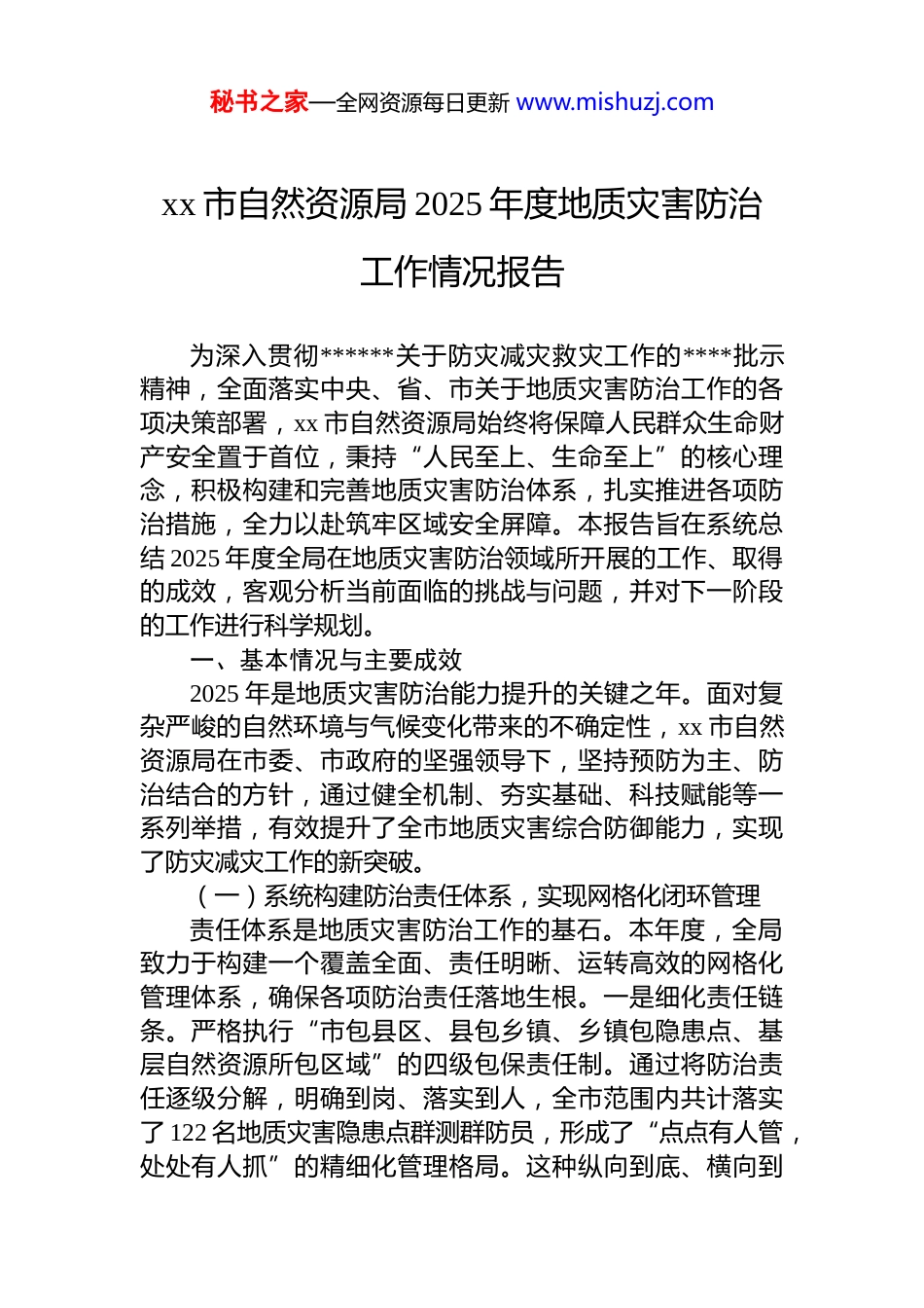 秘书之家—全网资源每日更新 www.mishuzj.comxx 市自然资源局 2025 年度地质灾害防治工作情况报告为深入贯彻******关于防灾减灾救灾工作的****批示精神,全面落实中央、省、市关于地质灾害防治工作的各项决策部署,xx 市自然资源局始终将保障人民群众生命财产安全置于首位,秉持“人民至上、生命至上”的核心理念,积极构建和完善地质灾害防治体系,扎实推进各项防治措施,全力以赴筑牢区域安全屏障。本报告旨在系统总结 2025 年度全局在地质灾害防治领域所开展的工作、取得的成效,客观分析当前面临的挑战与问题,并对下一阶段的工作进行科学规划。一、基本情况与主要成效2025 年是地质灾害防治能力提升的关键之年。面对复杂严峻的自然环境与气候变化带来的不确定性,xx 市自然资源局在市委、市政府的坚强领导下,坚持预防为主、防治结合的方针,通过健全机制、夯实基础、科技赋能等一系列举措,有效提升了全市地质灾害综合防御能力,实现了防灾减灾工作的新突破。(一)系统构建防治责任体系,实现网格化闭环管理责任体系是地质灾害防治工作的基石。本年度,全局致力于构建一个覆盖全面、责任明晰、运转高效的网格化管理体系,确保各项防治责任落地生根。一是细化责任链条。严格执行“市包县区、县包乡镇、乡镇包隐患点、基层自然资源所包区域”的四级包保责任制。通过将防治责任逐级分解,明确到岗、落实到人,全市范围内共计落实了 122 名地质灾害隐患点群测群防员,形成了“点点有人管,处处有人抓”的精细化管理格局。这种纵向到底、横向到秘书之家—全网资源每日更新 www.mishuzj.com边的责任网络,确保了信息传递的畅通与应急响应的迅速构建了上下联动、协调一致的工作局面。二是强化应急指挥与制度保障。市政府层面组建了市级地质灾害应急指挥部,建立了由地质灾害防治专家和专业技术队伍构成的分片区应急支撑保障体系。该体系确保一旦发生灾情或险情相关责任部门能依据职责分工,迅速启动应急响应,高效开展灾后调查、次生灾害排查等关键工作。同时,组织修订并完善了《xx 市突发性地质灾害应急预案》,并牵头制定了《突发性地质灾害防御响应制度》、《地质灾害气象预警发布及响应机制》等一系列配套文件。每年汛前,均结合年度气候预测与区域实际情况,科学编制年度地质灾害防治方案,报请市政府印发至各县区及相关部门,对全年防治工作进行系统化、前瞻性的全面部署。三是推动基层预案精细化。在全市范围内强力督导县区落实“一点一预案”工作要求,确保每一个已查明的地质灾害隐患点都具备针对性的应急避险预案。预案内容涵盖了监测方法、预警信号、疏散路线、安置地点及责任人联系方式等关键信息,使基层防灾工作更具操作性与实效性。(二)深化隐患排查与监测预警,筑牢主动防御防线精准的监测预警是掌握防灾主动权的关键。全局坚持将工作重心前移,通过常态化排查与专业化监测相结合的方式,努力实现对地质灾害风险的早发现、早报告、早处置。一是建立常态化巡排查机制。严格落实“汛前排查、汛中检查、汛后核查”与“雨前排查、雨中巡查、雨后核查”的“三查三核”制度。每年联合技术支撑单位,组织专业力量对地质灾害高易发区的重点区域、重点地段,特别是人口密集的城镇、学校、医院以及交通干线沿线,开展 3 至 5 次全覆盖、拉网式的集中排查。排查工作紧盯中小学校、群众聚居区、村民房前屋后、冲沟沟口等关键部位对发现的隐患点逐一登记造册,明确防灾责任人,完善防灾预案,并分类施策,落实监测、避让或工程治理措施。秘书之家—全网资源每日更新 www.mishuzj.com二是强化科技赋能与专业监测。为弥补传统人工监测的局限性,不断提升监测预警的科技水平。目前,已在全市 35处重要隐患点布设了包括 gnss 基准站、泥位计、雨量计、位移计在内的专业监测设备共 132 台(套),实现了对重点区域的全天候自动化实时监测。这些设备能够实时采集地表位移、降雨量等关键数据,为风险研判提供科学依据。同时,储备了无人机、手持 gps 等应急调查设备 36 台(套)及其他监测装备 200 余套,确保在灾情险情发生时,能够迅速开展应急调查...