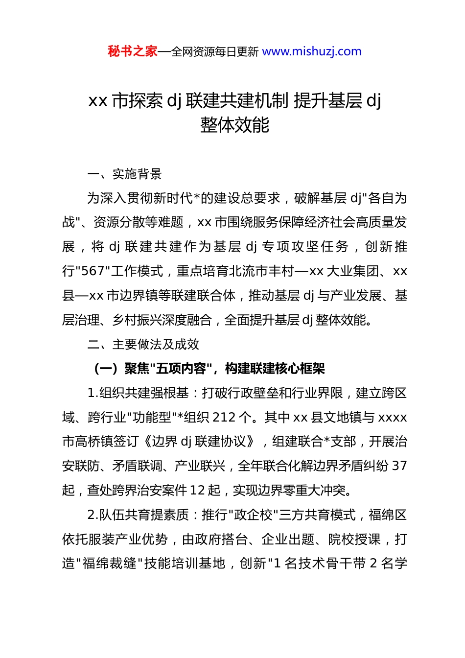 秘书之家—全网资源每日更新 www.mishuzj.comxx 市探索 dj 联建共建机制 提升基层 dj整体效能一、实施背景为深入贯彻新时代*的建设总要求,破解基层 dj"各自为战"、资源分散等难题,xx 市围绕服务保障经济社会高质量发展 , 将 dj 联 建 共 建 作 为 基 层 dj 专 项 攻 坚 任 务 , 创 新 推行"567"工作模式,重点培育北流市丰村—xx 大业集团、xx县—xx 市边界镇等联建联合体,推动基层 dj 与产业发展、基层治理、乡村振兴深度融合,全面提升基层 dj 整体效能。二、主要做法及成效(一)聚焦"五项内容",构建联建核心框架1.组织共建强根基:打破行政壁垒和行业界限,建立跨区域、跨行业"功能型"*组织 212 个。其中 xx 县文地镇与 xxxx市高桥镇签订《边界 dj 联建协议》,组建联合*支部,开展治安联防、矛盾联调、产业联兴,全年联合化解边界矛盾纠纷 37起,查处跨界治安案件 12 起,实现边界零重大冲突。2.队伍共育提素质:推行"政企校"三方共育模式,福绵区依托服装产业优势,由政府搭台、企业出题、院校授课,打造"福绵裁缝"技能培训基地,创新"1 名技术骨干带 2 名学秘书之家—全网资源每日更新 www.mishuzj.com徒、2 名学徒带 1 名新手"的"121"带徒机制,累计培养技术工人 5870 人,其中 320 人成长为企业技术主管。3.资源共享促高效:北流市丰村*支部与 xx 大业集团*委整合资源,将企业资金、管理优势与村庄生态资源结合,打造"生态民宿+农事体验"乡村旅游项目,建成民宿 12 家、农事体验园 3 个,丰村成功获评全国乡村旅游重点村,2024 年村集体增收 86 万元。4.活动共办聚合力:兴业县组织联建*组织创办"感*恩跟*走"微讲堂,开展政策宣讲、技能培训、文艺汇演等活动 50 余场,覆盖群众 2000 余人次;联建单位公益捐资 20 多万元,资助贫困学生 43 名,修缮村级文化活动中心 6 个。5.事业共创谋发展:xx 县与 xx 市联建乡村振兴产品展销馆,整合两地特色农产品 120 余种,建立"线上直播+线下展销"销售体系,2024 年实现销售额 1500 多万元,直接受益农户 78 户,户均年增收 2.5 万元。(二)落实"六条举措",规范联建运行机制全面推行"六个一"工作法:搭建一个跨层级组织架构,明确联建各方职责;签订一份共建框架协议,界定合作范围;制定一套议事规则,建立月度协商、季度研判机制;探索一个特色载体,结合领域特点设计联建项目;建立一套保障机制,落秘书之家—全网资源每日更新 www.mishuzj.com实经费、场地等保障;形成一套评价体系,将联建成效纳入 dj考核,确保联建工作常态长效。(三)创新"七种模式",拓展联建覆盖领域根据不同领域特点,因地制宜推行七种联建模式:乡村振兴型聚焦产业增收,基层治理型强化矛盾化解,项目牵引型保障重大项目推进,产业链接型推动产业链协同,商圈联动型优化营商环境,毗邻协作型破解跨界治理难题,飞地抱团型促进薄弱村增收,实现联建工作与中心工作同频共振。三、经验启示1.dj 联建必须坚持 dj 统领,把*的政治优势、组织优势转化为发展优势,确保联建工作方向不偏。2.必须坚持优势互补,找准联建各方需求契合点,实现资源共享、优势叠加,避免"一头热"。3.必须坚持问题导向,聚焦基层治理、产业发展等难点问题设计联建载体,确保联建工作实效可见。4.必须坚持群众满意,把增进民生福祉作为出发点和落脚点,让群众在联建工作中感受变化、得到实惠。xx 县 xx 镇以"聚能先锋"dj 联建 推动地企融合高质量发展秘书之家—全网资源每日更新 www.mishuzj.com一、实施背景xx 镇作为 xx 县煤电产业核心区,华能核桃峪煤矿、华能xx 电厂等重点企业集聚,近年来因产业开发面临征迁安置、民生保障、安全稳定等突出问题。为破解"企业发展与地方建设两张皮 "难题,镇 *委 以 "聚能 先锋 "dj 品牌 为 引领 ,创新 构建"1+3+3+1"dj 联建机制,推动地企*组织深度融合,实现企业发展与乡村振兴互利共赢。二、主要做法及成效(一)建强组织体系,织密联建"红色网络"创新构建"1 个联合*委+3 支*员先锋队+3 项联建制度+1个评...