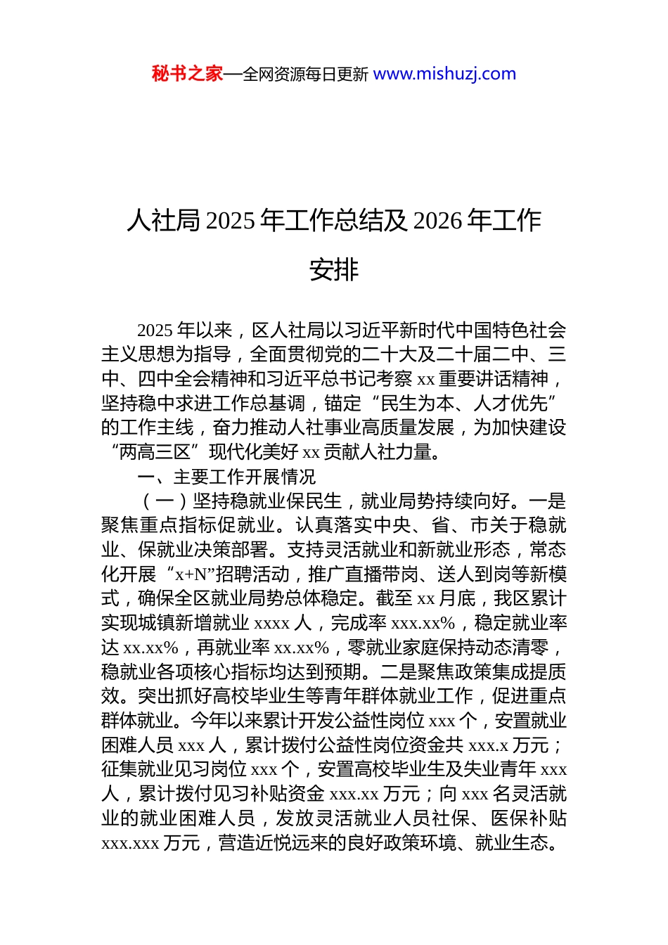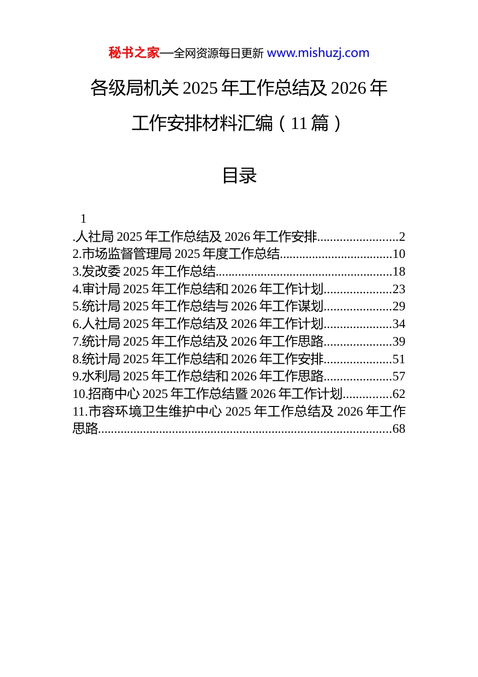 秘书之家—全网资源每日更新 www.mishuzj.com各级局机关 2025 年工作总结及 2026 年工作安排材料汇编(11 篇)目录1.人社局 2025 年工作总结及 2026 年工作安排.........................22.市场监督管理局 2025 年度工作总结...................................103.发改委 2025 年工作总结.......................................................184.审计局 2025 年工作总结和 2026 年工作计划.....................235.统计局 2025 年工作总结与 2026 年工作谋划.....................296.人社局 2025 年工作总结及 2026 年工作计划.....................347.统计局 2025 年工作总结及 2026 年工作思路.....................398.统计局 2025 年工作总结和 2026 年工作安排.....................519.水利局 2025 年工作总结和 2026 年工作思路.....................5710.招商中心 2025 年工作总结暨 2026 年工作计划...............6211.市容环境卫生维护中心 2025 年工作总结及 2026 年工作思路...........................................................................................68秘书之家—全网资源每日更新 www.mishuzj.com人社局 2025 年工作总结及 2026 年工作安排2025 年以来,区人社局以习近平新时代中国特色社会主义思想为指导,全面贯彻党的二十大及二十届二中、三中、四中全会精神和习近平总书记考察 xx 重要讲话精神,坚持稳中求进工作总基调,锚定“民生为本、人才优先”的工作主线,奋力推动人社事业高质量发展,为加快建设“两高三区”现代化美好 xx 贡献人社力量。一、主要工作开展情况(一)坚持稳就业保民生,就业局势持续向好。一是聚焦重点指标促就业。认真落实中央、省、市关于稳就业、保就业决策部署。支持灵活就业和新就业形态,常态化开展“x+N”招聘活动,推广直播带岗、送人到岗等新模式,确保全区就业局势总体稳定。截至 xx 月底,我区累计实现城镇新增就业 xxxx 人,完成率 xxx.xx%,稳定就业率达 xx.xx%,再就业率 xx.xx%,零就业家庭保持动态清零,稳就业各项核心指标均达到预期。二是聚焦政策集成提质效。突出抓好高校毕业生等青年群体就业工作,促进重点群体就业。今年以来累计开发公益性岗位 xxx 个,安置就业困难人员 xxx 人,累计拨付公益性岗位资金共 xxx.x 万元;征集就业见习岗位 xxx 个,安置高校毕业生及失业青年 xxx人,累计拨付见习补贴资金 xxx.xx 万元;向 xxx 名灵活就业的就业困难人员,发放灵活就业人员社保、医保补贴xxx.xxx 万元,营造近悦远来的良好政策环境、就业生态。秘书之家—全网资源每日更新 www.mishuzj.com三是聚焦渠道拓展扩存量。大力推广直播带岗,搭建精准对接平台,常态化开展民营企业服务月、公共就业服务专项活动,延续开展“春风行动”、就业援助月等专项活动。今年以来,累计举办各类招聘会 xxx 场次,参加招聘会企业 xxxx 家次,提供岗位 x.x 万个次,达成就业意向 xxxx余人。推进人力资源市场信息化建设,发挥 xx 公共招聘网(xx 区)效能,今年以来,公共招聘网(xx 区)累计注册企业 xx 家,提供就业岗位 xxxx 个,注册个人简历 xxx 份,人才信息资源存量有效扩充。(二)惠民生兜底线,社会保障持续向优。一是社保提标扩面有力有效。通过数据比对精准参保扩面,截至xxxx 年 xx 月,xx 区城镇职工养老保险参保 x.xx 万人,完成目标任务的 xx.xx%,预计 xx 月达到 x.xxx 万人,占任务xxx.xx%,征收养老保险费 xxxxx 万元,比上年同期增长x.xx%;失业保险参保 x.xx 万人,完成目标任务的 xxx.xx%,征收失业保险费 xxxx 万元,比上年同期增长 x.xx%;工伤保险参保 x.xx 万人,完成目标任务的 xx.xx%,预计 xx月达到 x.xx 万人,占任务 xxx.xx%,征收工伤保险费 xxxx万元,比上年同期增长 xx.xx%,“应保尽保”的社会保障网络进一步筑牢。二是居民增收提速有为有方。加大困难群众救助帮扶力度,兜牢兜好民生底线,积极和辖区企业对接,保证失业保险阶段性降费...
