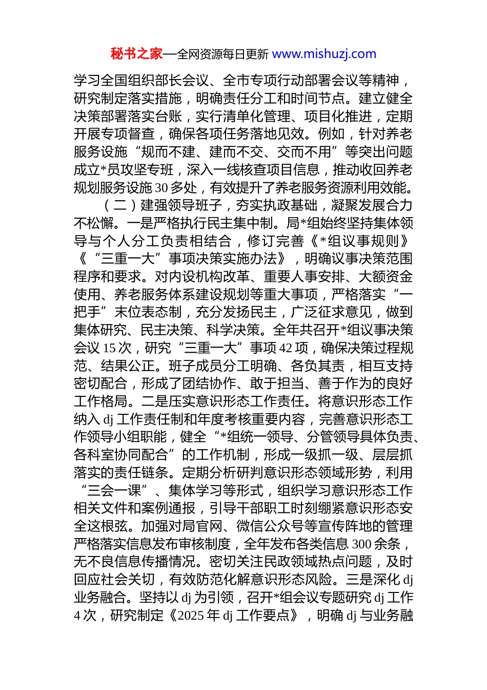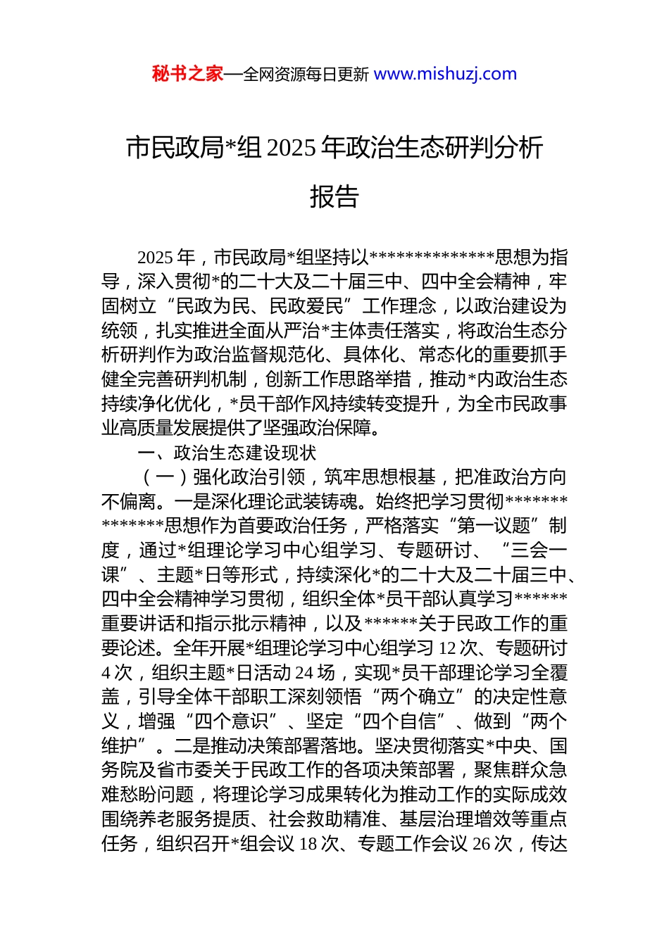 秘书之家—全网资源每日更新 www.mishuzj.com市民政局*组 2025 年政治生态研判分析报告2025 年,市民政局*组坚持以**************思想为指导,深入贯彻*的二十大及二十届三中、四中全会精神,牢固树立“民政为民、民政爱民”工作理念,以政治建设为统领,扎实推进全面从严治*主体责任落实,将政治生态分析研判作为政治监督规范化、具体化、常态化的重要抓手健全完善研判机制,创新工作思路举措,推动*内政治生态持续净化优化,*员干部作风持续转变提升,为全市民政事业高质量发展提供了坚强政治保障。一、政治生态建设现状(一)强化政治引领,筑牢思想根基,把准政治方向不偏离。一是深化理论武装铸魂。始终把学习贯彻**************思想作为首要政治任务,严格落实“第一议题”制度,通过*组理论学习中心组学习、专题研讨、“三会一课”、主题*日等形式,持续深化*的二十大及二十届三中、四中全会精神学习贯彻,组织全体*员干部认真学习******重要讲话和指示批示精神,以及******关于民政工作的重要论述。全年开展*组理论学习中心组学习 12 次、专题研讨4 次,组织主题*日活动 24 场,实现*员干部理论学习全覆盖,引导全体干部职工深刻领悟“两个确立”的决定性意义,增强“四个意识”、坚定“四个自信”、做到“两个维护”。二是推动决策部署落地。坚决贯彻落实*中央、国务院及省市委关于民政工作的各项决策部署,聚焦群众急难愁盼问题,将理论学习成果转化为推动工作的实际成效围绕养老服务提质、社会救助精准、基层治理增效等重点任务,组织召开*组会议 18 次、专题工作会议 26 次,传达秘书之家—全网资源每日更新 www.mishuzj.com学习全国组织部长会议、全市专项行动部署会议等精神,研究制定落实措施,明确责任分工和时间节点。建立健全决策部署落实台账,实行清单化管理、项目化推进,定期开展专项督查,确保各项任务落地见效。例如,针对养老服务设施“规而不建、建而不交、交而不用”等突出问题成立*员攻坚专班,深入一线核查项目信息,推动收回养老规划服务设施 30 多处,有效提升了养老服务资源利用效能。(二)建强领导班子,夯实执政基础,凝聚发展合力不松懈。一是严格执行民主集中制。局*组始终坚持集体领导与个人分工负责相结合,修订完善《*组议事规则》《“三重一大”事项决策实施办法》,明确议事决策范围程序和要求。对内设机构改革、重要人事安排、大额资金使用、养老服务体系建设规划等重大事项,严格落实“一把手”末位表态制,充分发扬民主,广泛征求意见,做到集体研究、民主决策、科学决策。全年共召开*组议事决策会议 15 次,研究“三重一大”事项 42 项,确保决策过程规范、结果公正。班子成员分工明确、各负其责,相互支持密切配合,形成了团结协作、敢于担当、善于作为的良好工作格局。二是压实意识形态工作责任。将意识形态工作纳入 dj 工作责任制和年度考核重要内容,完善意识形态工作领导小组职能,健全“*组统一领导、分管领导具体负责、各科室协同配合”的工作机制,形成一级抓一级、层层抓落实的责任链条。定期分析研判意识形态领域形势,利用“三会一课”、集体学习等形式,组织学习意识形态工作相关文件和案例通报,引导干部职工时刻绷紧意识形态安全这根弦。加强对局官网、微信公众号等宣传阵地的管理严格落实信息发布审核制度,全年发布各类信息 300 余条,无不良信息传播情况。密切关注民政领域热点问题,及时回应社会关切,有效防范化解意识形态风险。三是深化 dj业务融合。坚持以 dj 为引领,召开*组会议专题研究 dj 工作4 次,研究制定《2025 年 dj 工作要点》,明确 dj 与业务融秘书之家—全网资源每日更新 www.mishuzj.com合发展举措。扎实推进*支部标准化规范化建设,完成 4 个*支部换届工作,培育先进*支部 2 个。聚焦养老服务、社会救助等核心业务,创新开展“dj+民政服务”品牌创建活动,推动*员干部在银发助餐点建设、居家养老服务、困境儿童帮扶等一线亮身份、践承诺、作表率。例如,在银发助餐服务推进过程中,各*支部主动对接社区,协调整合资源,推动建成社区银发助餐点 120 ...
