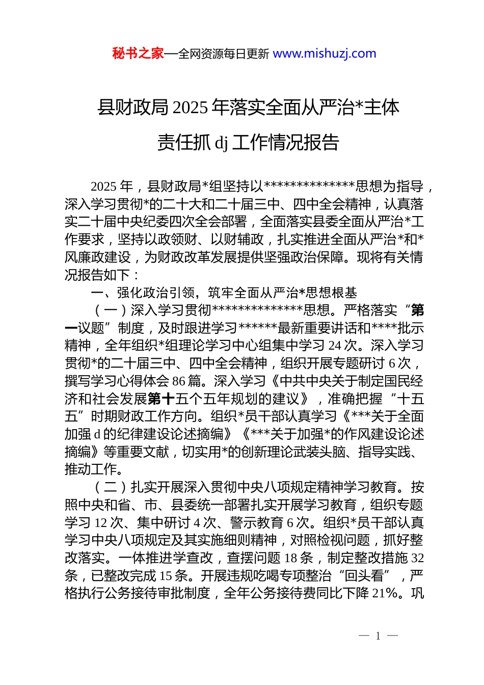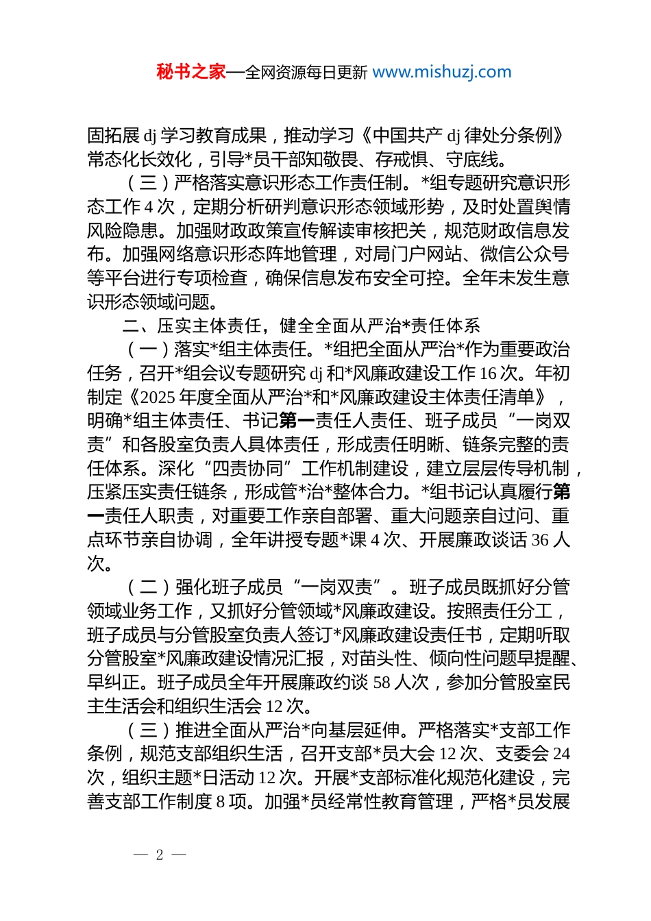 秘书之家—全网资源每日更新 www.mishuzj.com县财政局 2025 年落实全面从严治*主体责任抓 dj 工作情况报告2025 年,县财政局*组坚持以**************思想为指导,深入学习贯彻*的二十大和二十届三中、四中全会精神,认真落实二十届中央纪委四次全会部署,全面落实县委全面从严治*工作要求,坚持以政领财、以财辅政,扎实推进全面从严治*和*风廉政建设,为财政改革发展提供坚强政治保障。现将有关情况报告如下:一、强化政治引领,筑牢全面从严治*思想根基(一)深入学习贯彻**************思想。严格落实“第一议题”制度,及时跟进学习******最新重要讲话和****批示精神,全年组织*组理论学习中心组集中学习 24 次。深入学习贯彻*的二十届三中、四中全会精神,组织开展专题研讨 6 次,撰写学习心得体会 86 篇。深入学习《中共中央关于制定国民经济和社会发展第十五个五年规划的建议》,准确把握“十五五”时期财政工作方向。组织*员干部认真学习《***关于全面加强 d 的纪律建设论述摘编》《***关于加强*的作风建设论述摘编》等重要文献,切实用*的创新理论武装头脑、指导实践、推动工作。(二)扎实开展深入贯彻中央八项规定精神学习教育。按照中央和省、市、县委统一部署扎实开展学习教育,组织专题学习 12 次、集中研讨 4 次、警示教育 6 次。组织*员干部认真学习中央八项规定及其实施细则精神,对照检视问题,抓好整改落实。一体推进学查改,查摆问题 18 条,制定整改措施 32条,已整改完成 15 条。开展违规吃喝专项整治“回头看”,严格执行公务接待审批制度,全年公务接待费同比下降 21%。巩— 1 —秘书之家—全网资源每日更新 www.mishuzj.com固拓展 dj 学习教育成果,推动学习《中国共产 dj 律处分条例》常态化长效化,引导*员干部知敬畏、存戒惧、守底线。(三)严格落实意识形态工作责任制。*组专题研究意识形态工作 4 次,定期分析研判意识形态领域形势,及时处置舆情风险隐患。加强财政政策宣传解读审核把关,规范财政信息发布。加强网络意识形态阵地管理,对局门户网站、微信公众号等平台进行专项检查,确保信息发布安全可控。全年未发生意识形态领域问题。二、压实主体责任,健全全面从严治*责任体系(一)落实*组主体责任。*组把全面从严治*作为重要政治任务,召开*组会议专题研究 dj 和*风廉政建设工作 16 次。年初制定《2025 年度全面从严治*和*风廉政建设主体责任清单》,明确*组主体责任、书记第一责任人责任、班子成员“一岗双责”和各股室负责人具体责任,形成责任明晰、链条完整的责任体系。深化“四责协同”工作机制建设,建立层层传导机制,压紧压实责任链条,形成管*治*整体合力。*组书记认真履行第一责任人职责,对重要工作亲自部署、重大问题亲自过问、重点环节亲自协调,全年讲授专题*课 4 次、开展廉政谈话 36 人次。(二)强化班子成员“一岗双责”。班子成员既抓好分管领域业务工作,又抓好分管领域*风廉政建设。按照责任分工,班子成员与分管股室负责人签订*风廉政建设责任书,定期听取分管股室*风廉政建设情况汇报,对苗头性、倾向性问题早提醒、早纠正。班子成员全年开展廉政约谈 58 人次,参加分管股室民主生活会和组织生活会 12 次。(三)推进全面从严治*向基层延伸。严格落实*支部工作条例,规范支部组织生活,召开支部*员大会 12 次、支委会 24次,组织主题*日活动 12 次。开展*支部标准化规范化建设,完善支部工作制度 8 项。加强*员经常性教育管理,严格*员发展— 2 —秘书之家—全网资源每日更新 www.mishuzj.com程序,全年发展*员 2 名、培养入*积极分子 4 名。开展民主评议*员,对评议结果进行通报反馈,督促整改提升。三、突出清廉财政建设,深化廉政风险防控(一)加强重点领域廉政风险防控。聚焦预算编制、资金拨付、政府采购、国有资产处置等关键环节,梳理廉政风险点42 个,制定防控措施 68 条。修订完善《财政资金管理内部控制制度》《政府采购监督管理办法》等制度 12 项,织密扎牢制度笼子。推进廉政风险项目化防控,对乡村振兴资金、惠民惠农补贴资金等...